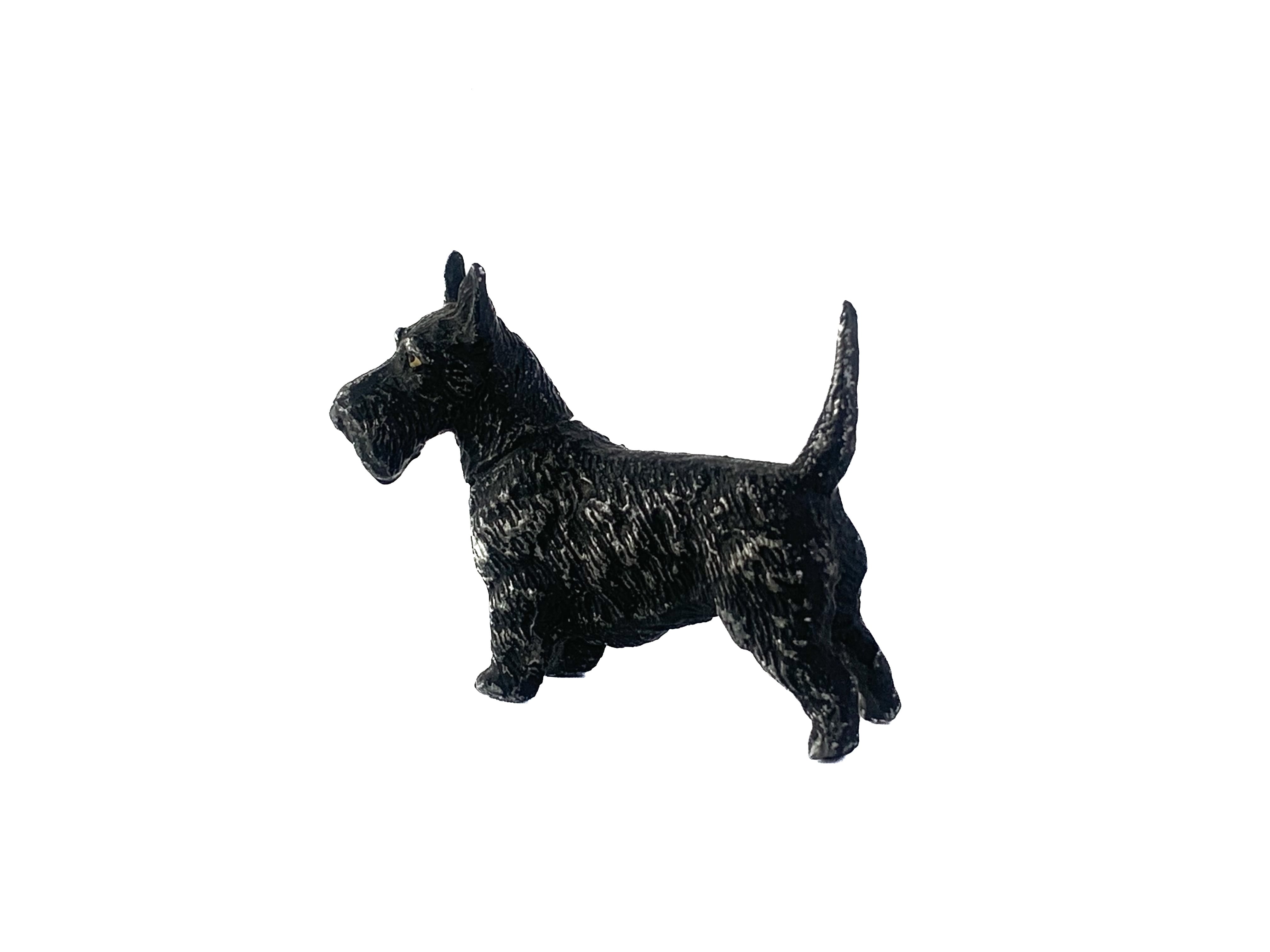 ちょっと目つきの悪いワンコ、シュナウザーかな?ピンと立った耳と尻尾、黒々とした毛並み。