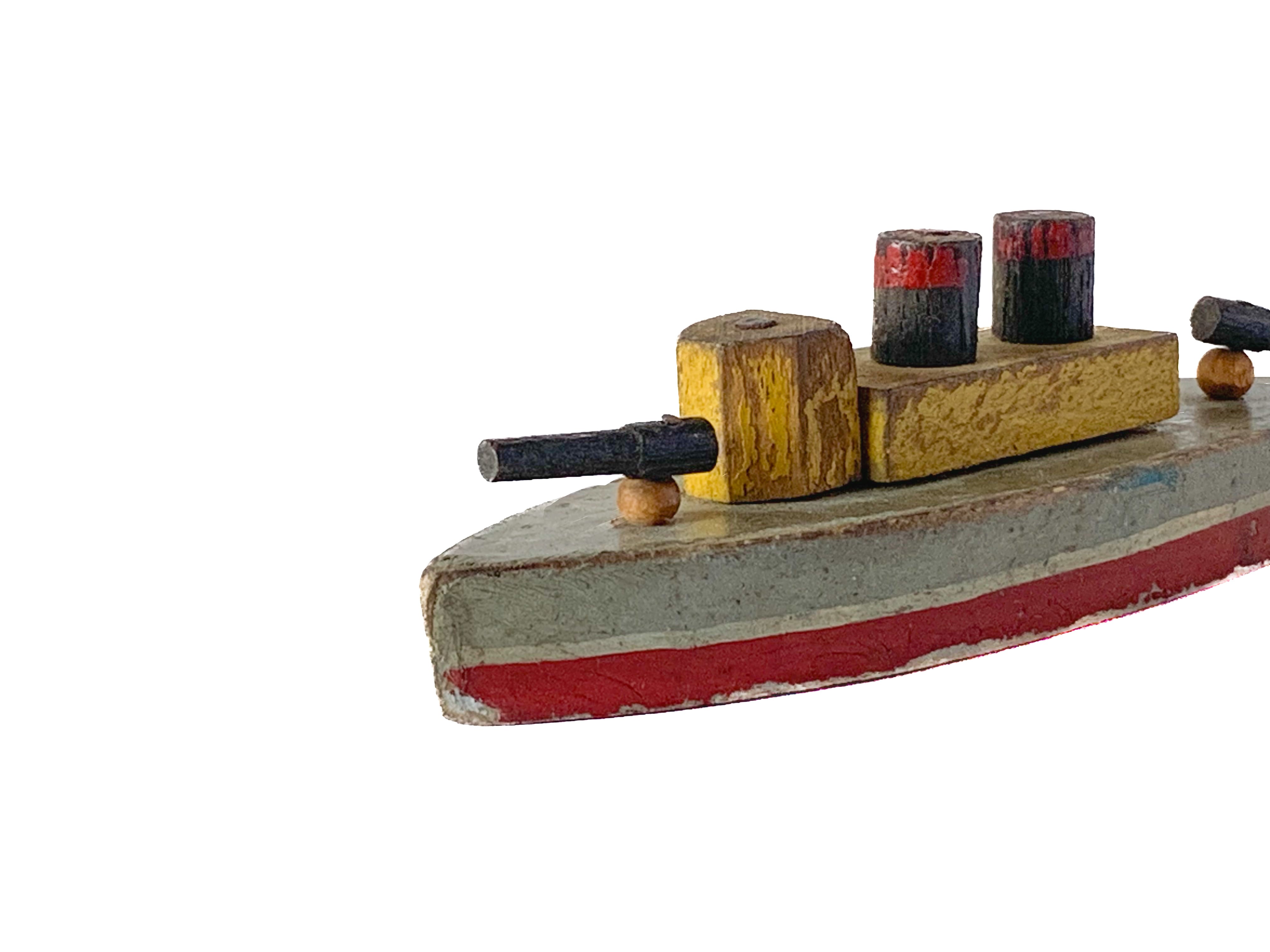 木製の船。手作り感がある様で、よく見たらしっかりとした作りをしています。大砲も動きます。砲弾と言うより、ポンと豆でも出て来そうな緩さではありますが、一応、戦艦なのでしょうね。木の枯れ具合も、色の剥げ具合も、とても気に入っています。