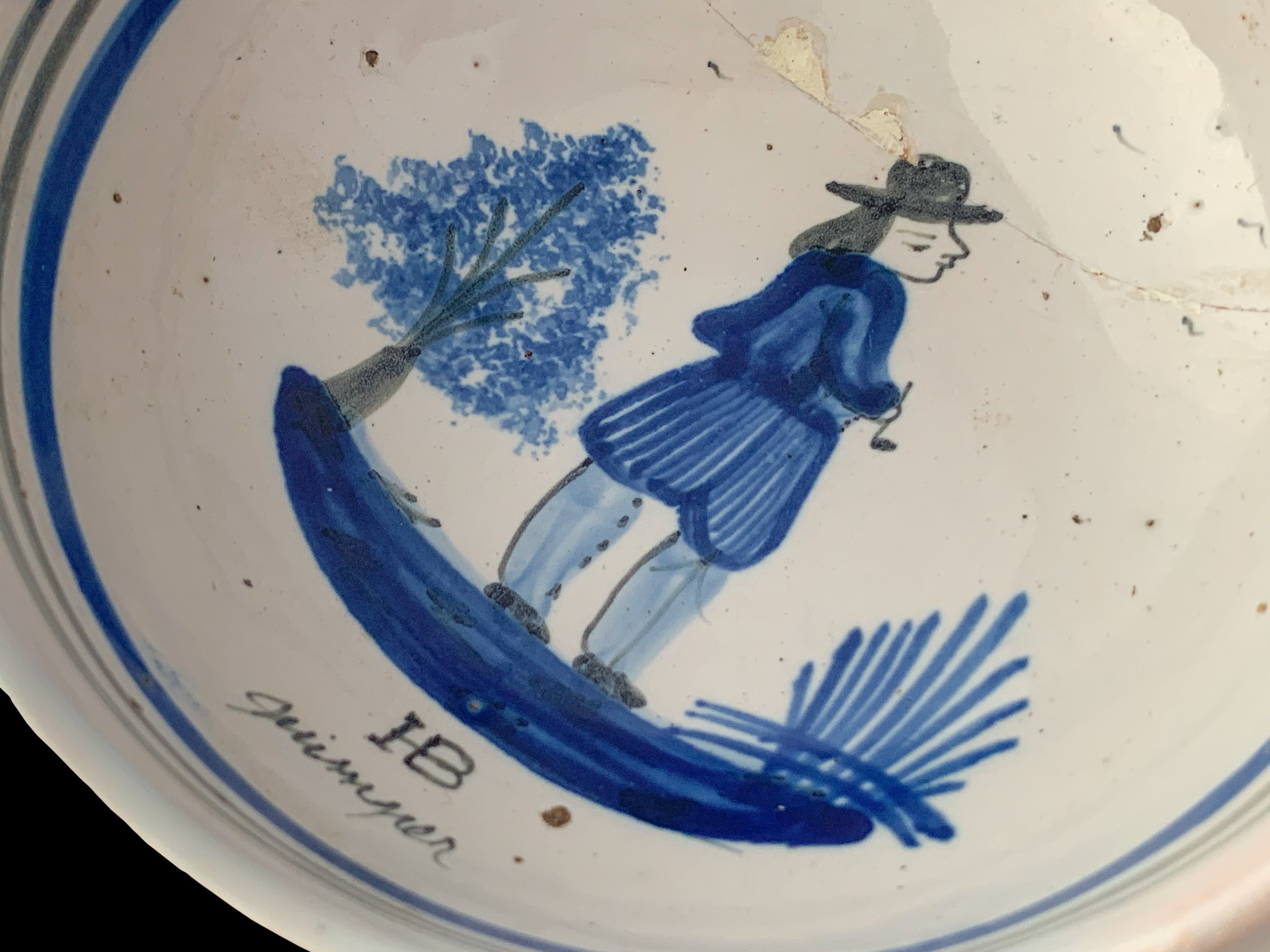 カンペール焼きの耳付きボウルになります。フランスブルターニュ地方の遺産のひとつと言われる「カンペール」は、ルイ14世の時代に王家により設立、現存するフランス最古のメーカーとして知られ、フランス陶磁器業界で芸術品として認められています。生み出される陶器は、代々受け継がれる華麗なる技法で、ひとつひとつ「カンペール焼伝統のタッチ」で制作されています。手作業である為、隅々まで入念に制作されています。HB-Henriot(アシュべー・アンリオ)のサイン入りです。ポッテリとした質感と絵柄が愛らしく、深みのあるブルーが美しいですね。※上部が割れていた為、直してあります。
