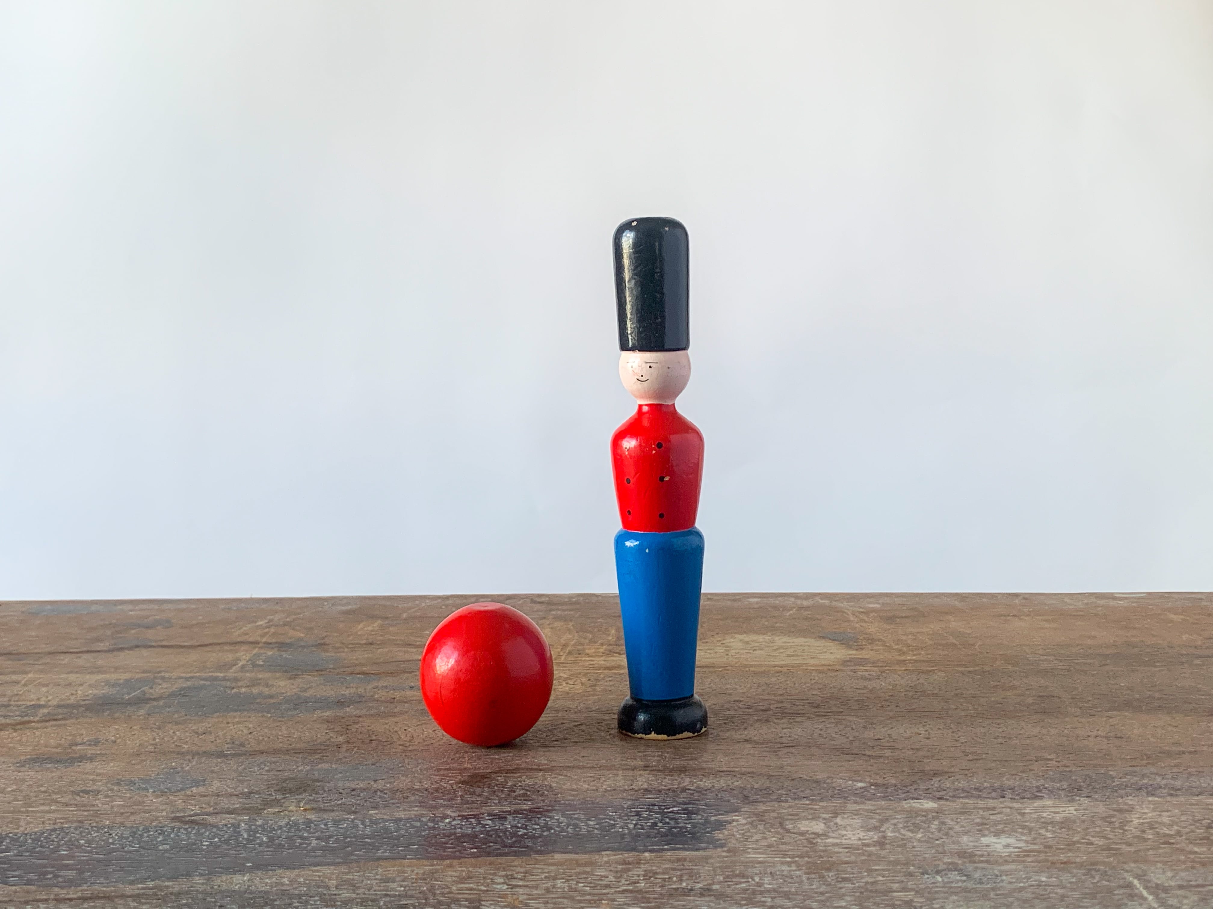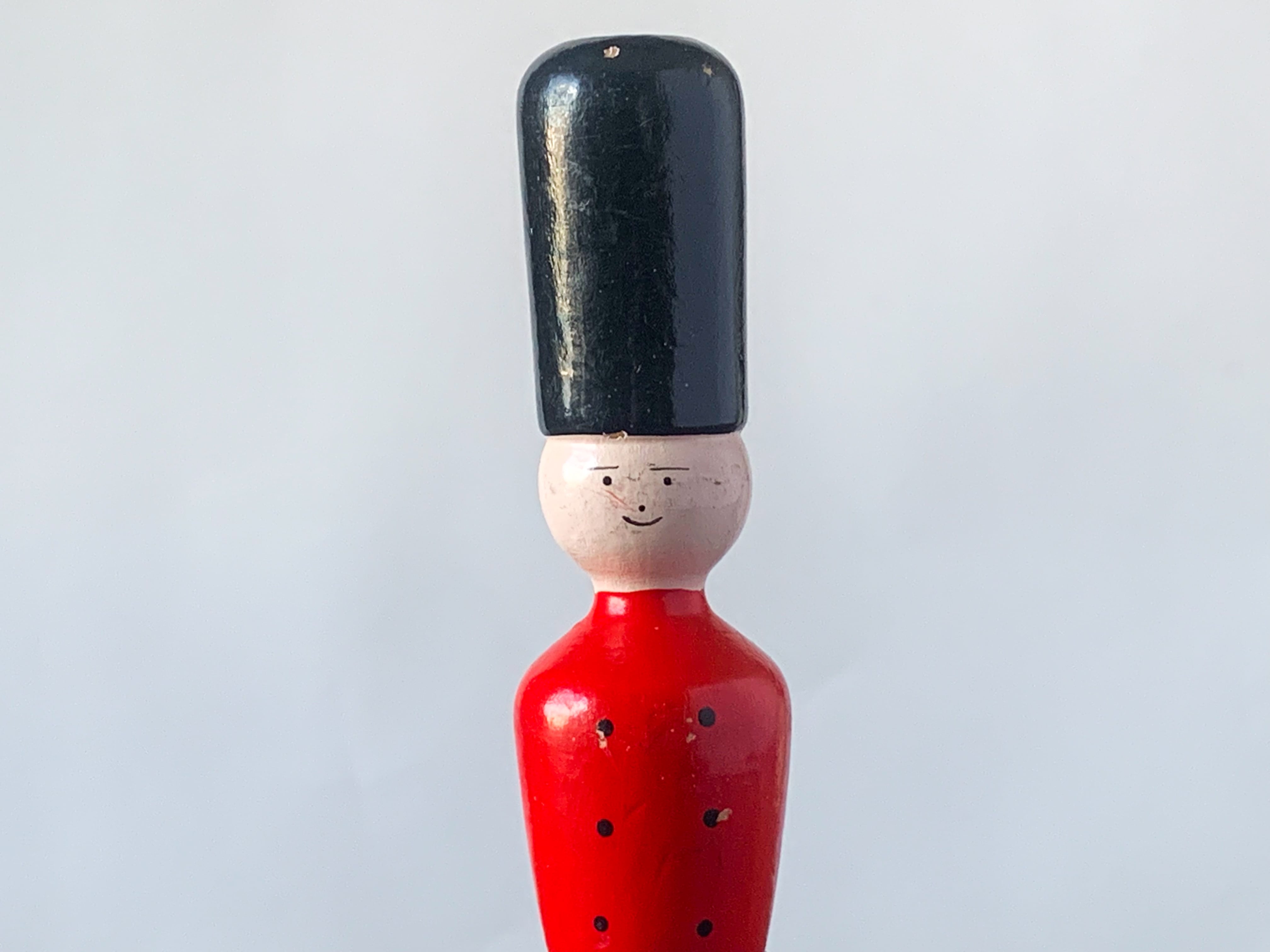 木製の兵隊(ボーリングのピン)になります。ちょっと大きめサイズなのが良いです。立ち姿は凛々しいですが、お顔は可愛らしいです。色味も鮮やかで目を惹きます。