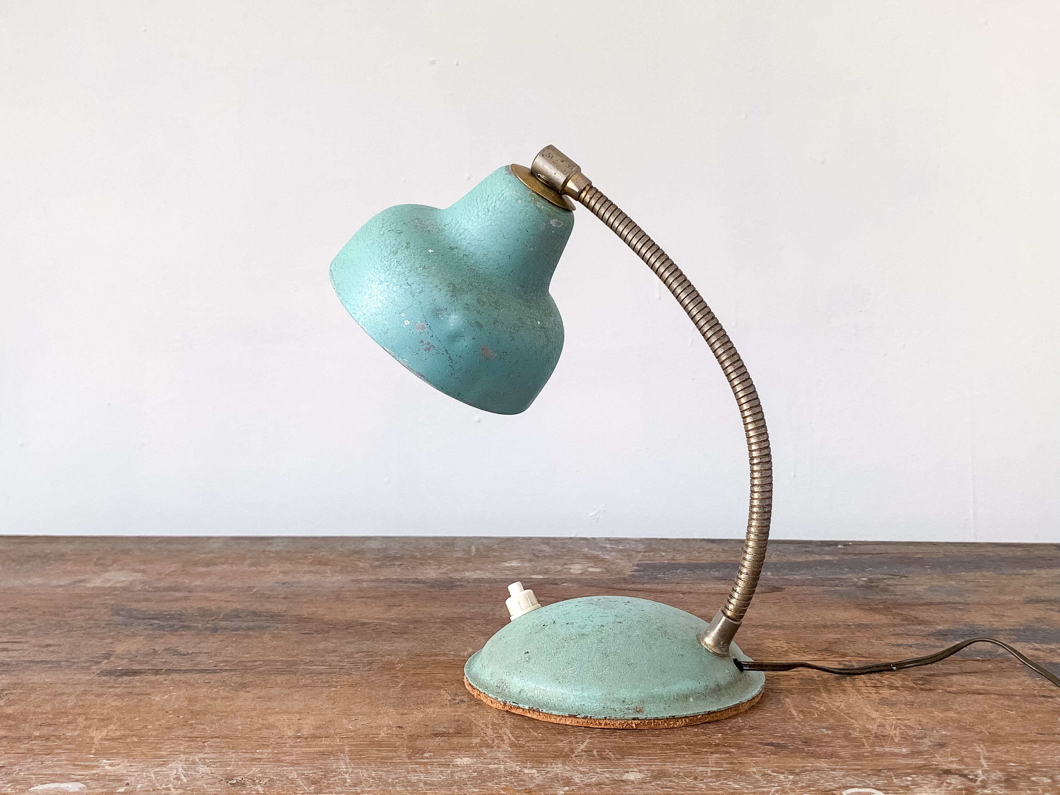 小さなデスクライト。薄いきれいなグリーン色です。ベース部分に小さな入切スイッチが付いています。小振りなデスクライトで可愛い物は、久しぶりに見つけました。アームの角度が変えられます。