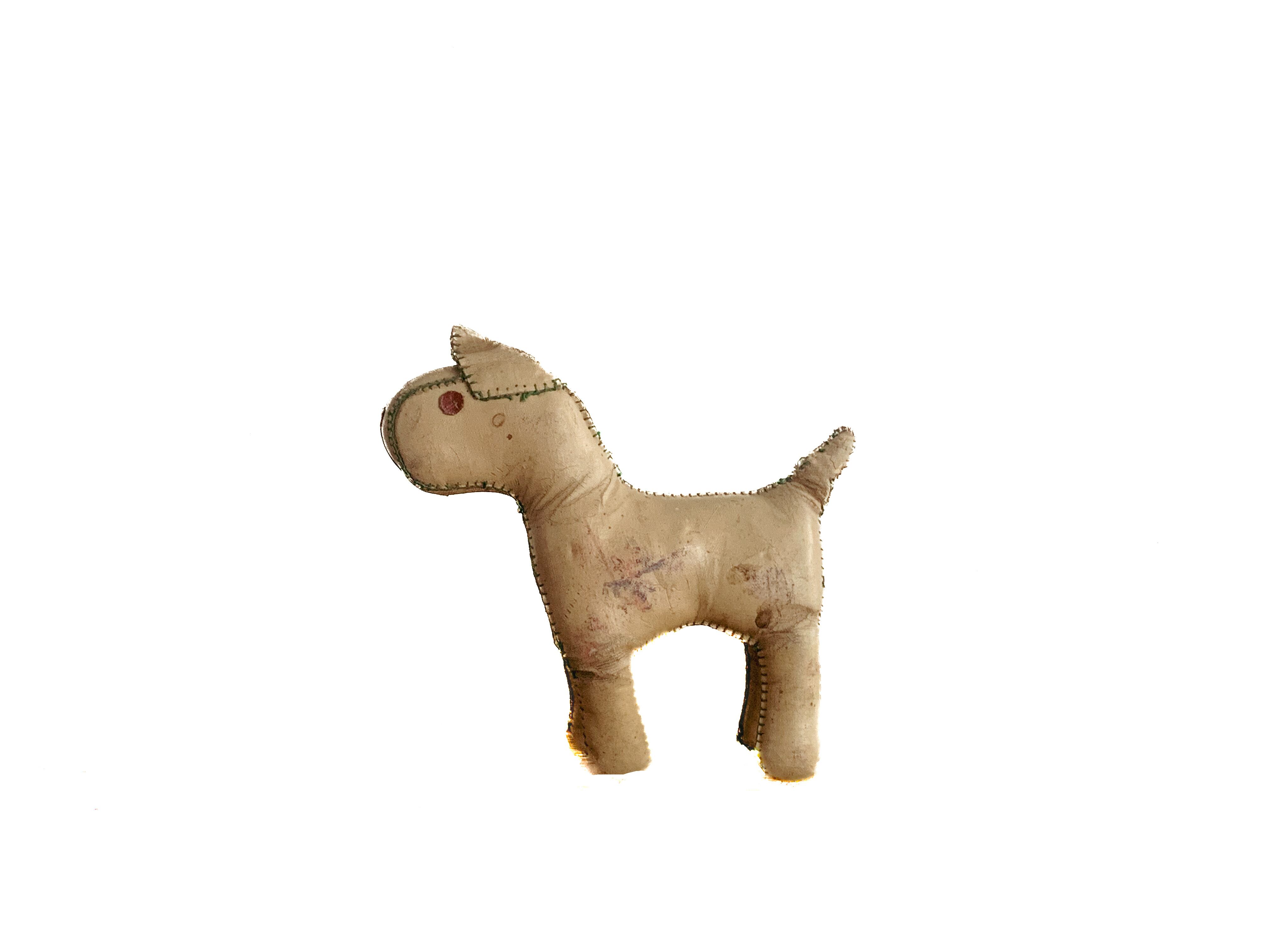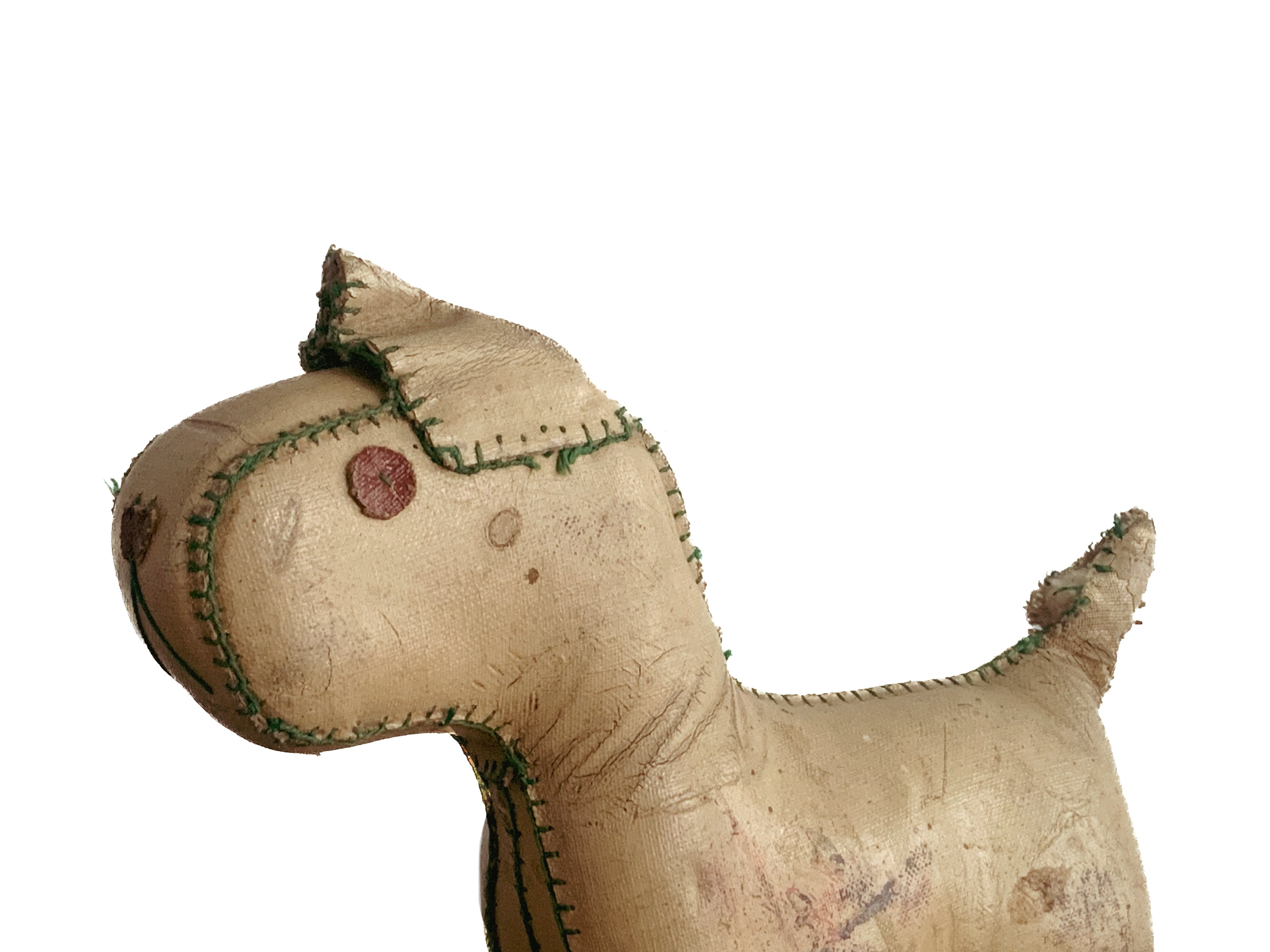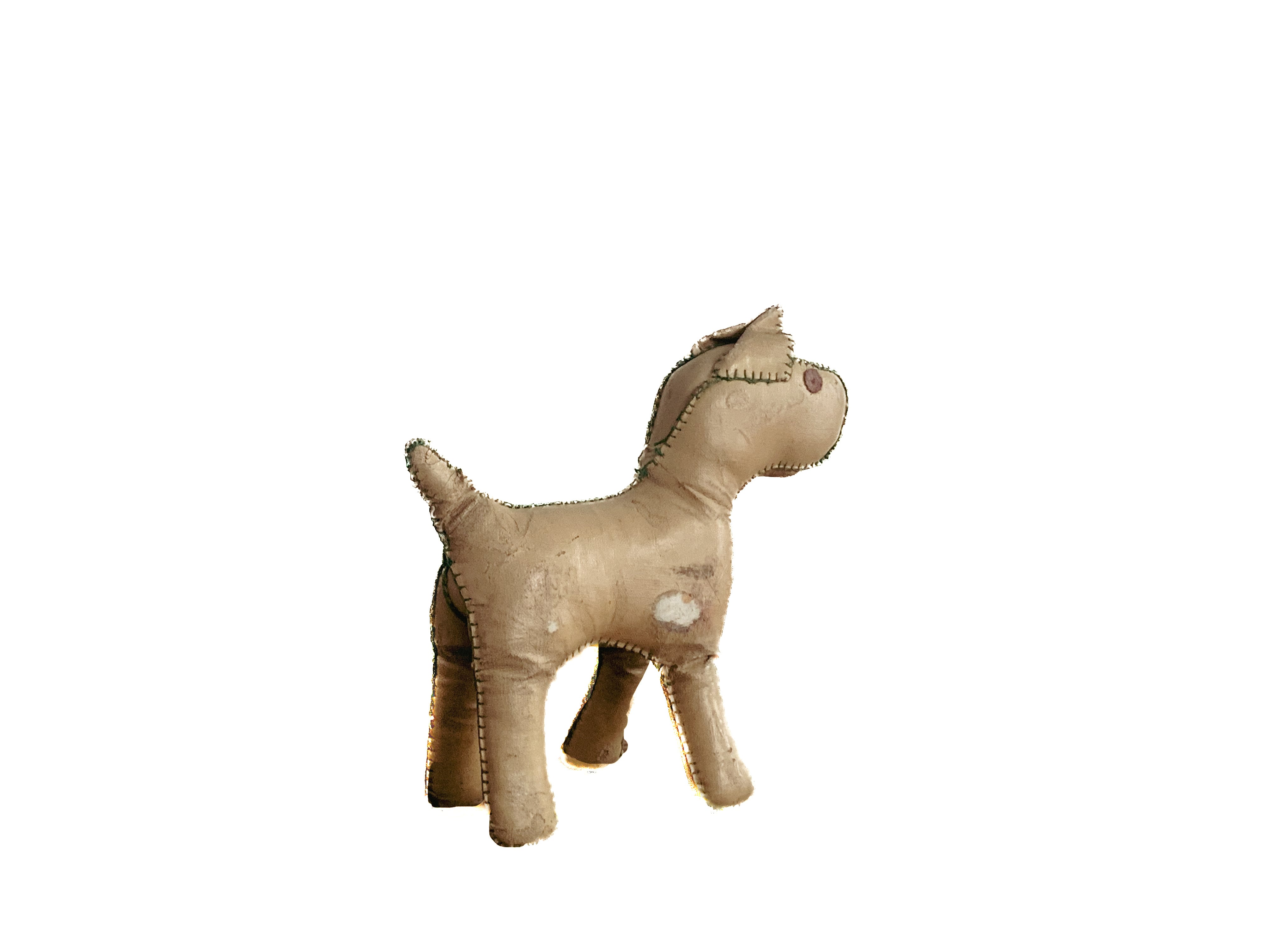 個人的にとても好きなレザー(合皮)のワンコです。何でしょう、この哀愁。ボロ感が愛おしく、グリーンのステッチが、この子にとても似合っています。安定は少し悪いですが、足をグッと開いて立たせれば、ちゃんと立ちます。