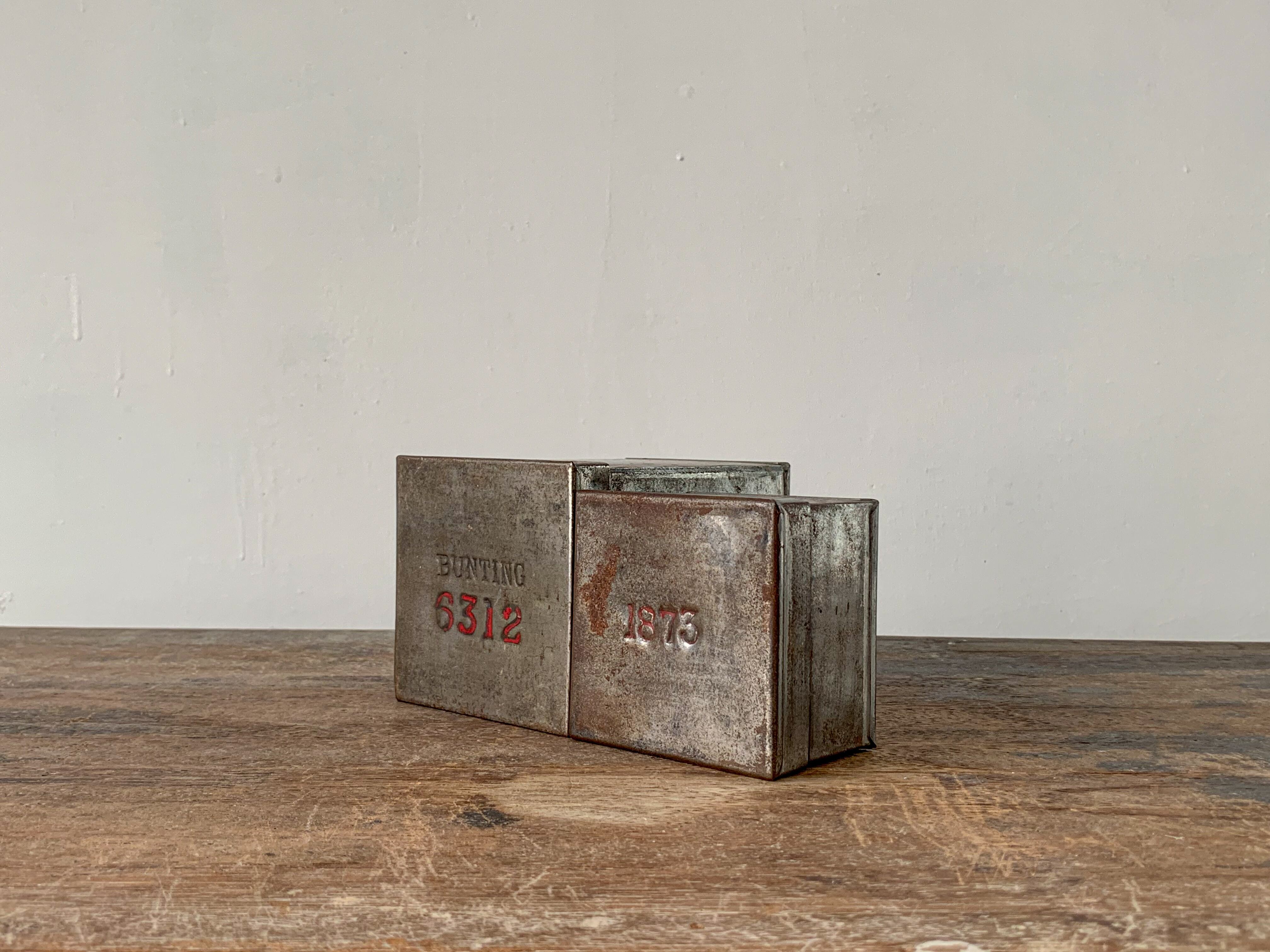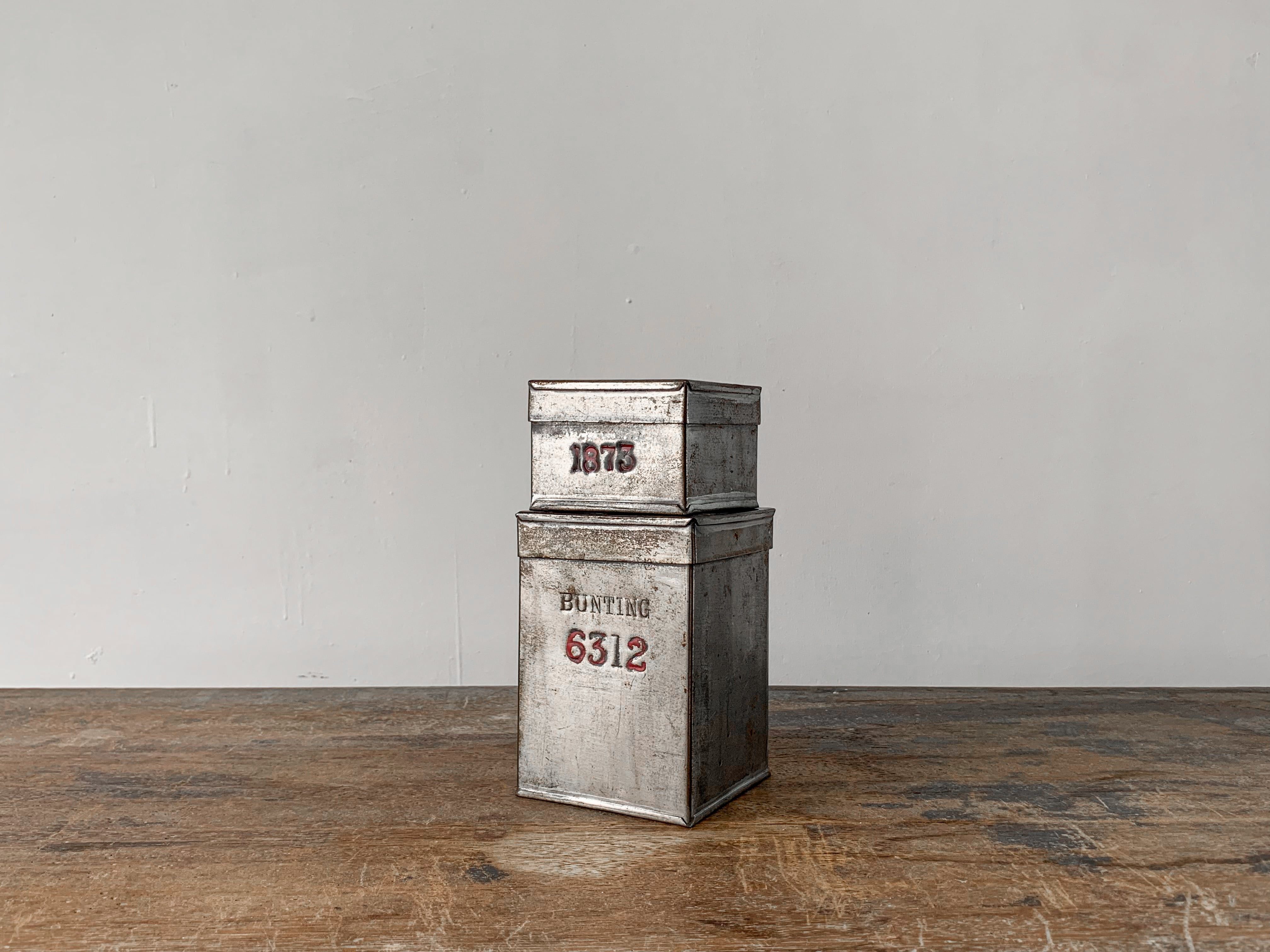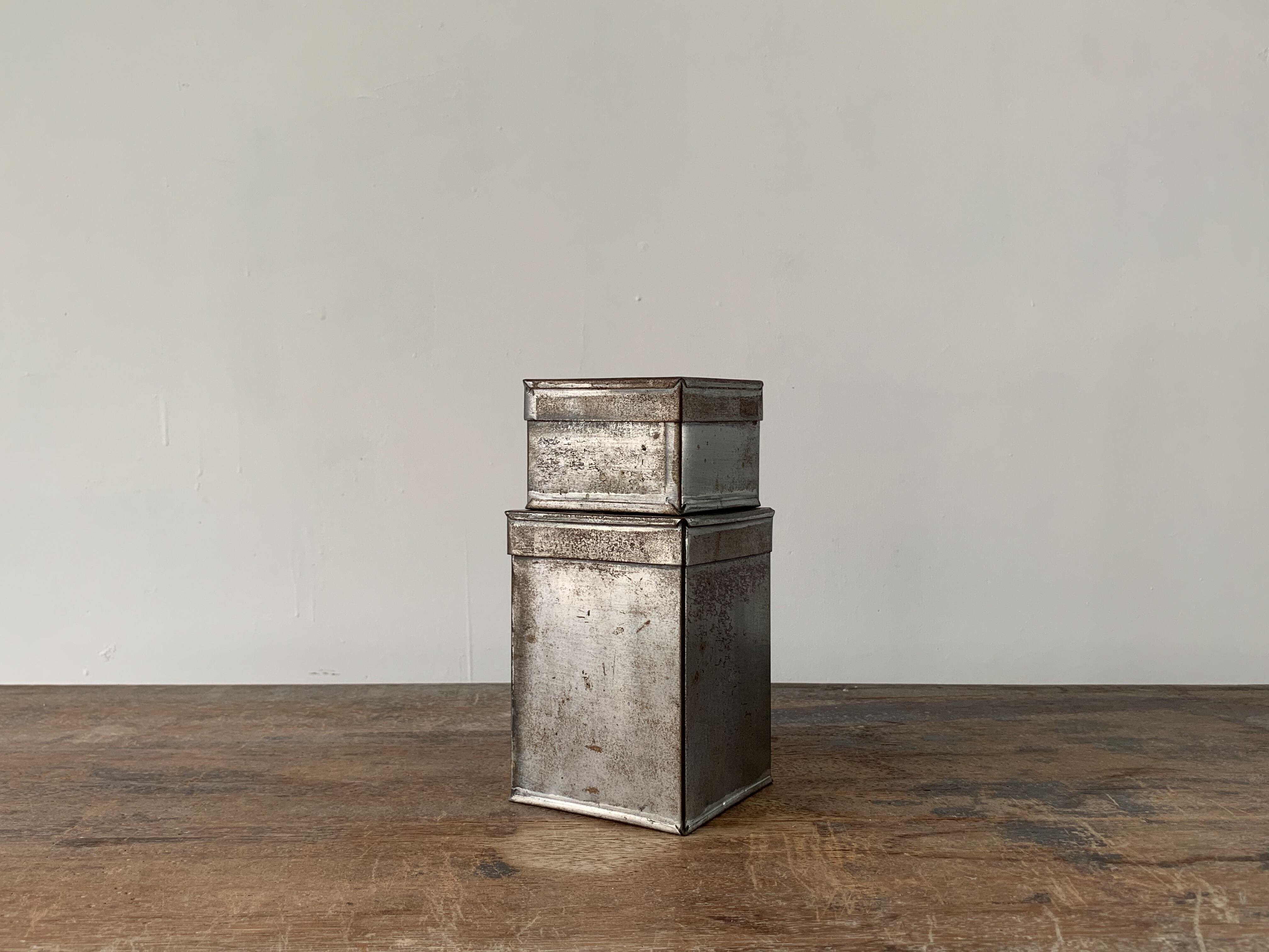 1920-30年頃、イギリスの紅茶のサンプル缶です。こちらは表面を焼いて磨いてを繰り返し、通常の紅茶缶より渋みのあるピューターの様な風合いになっています。かなりカッコいいです。ナンバーは濃い赤色に塗られています。こちらは小さいサイズになります。