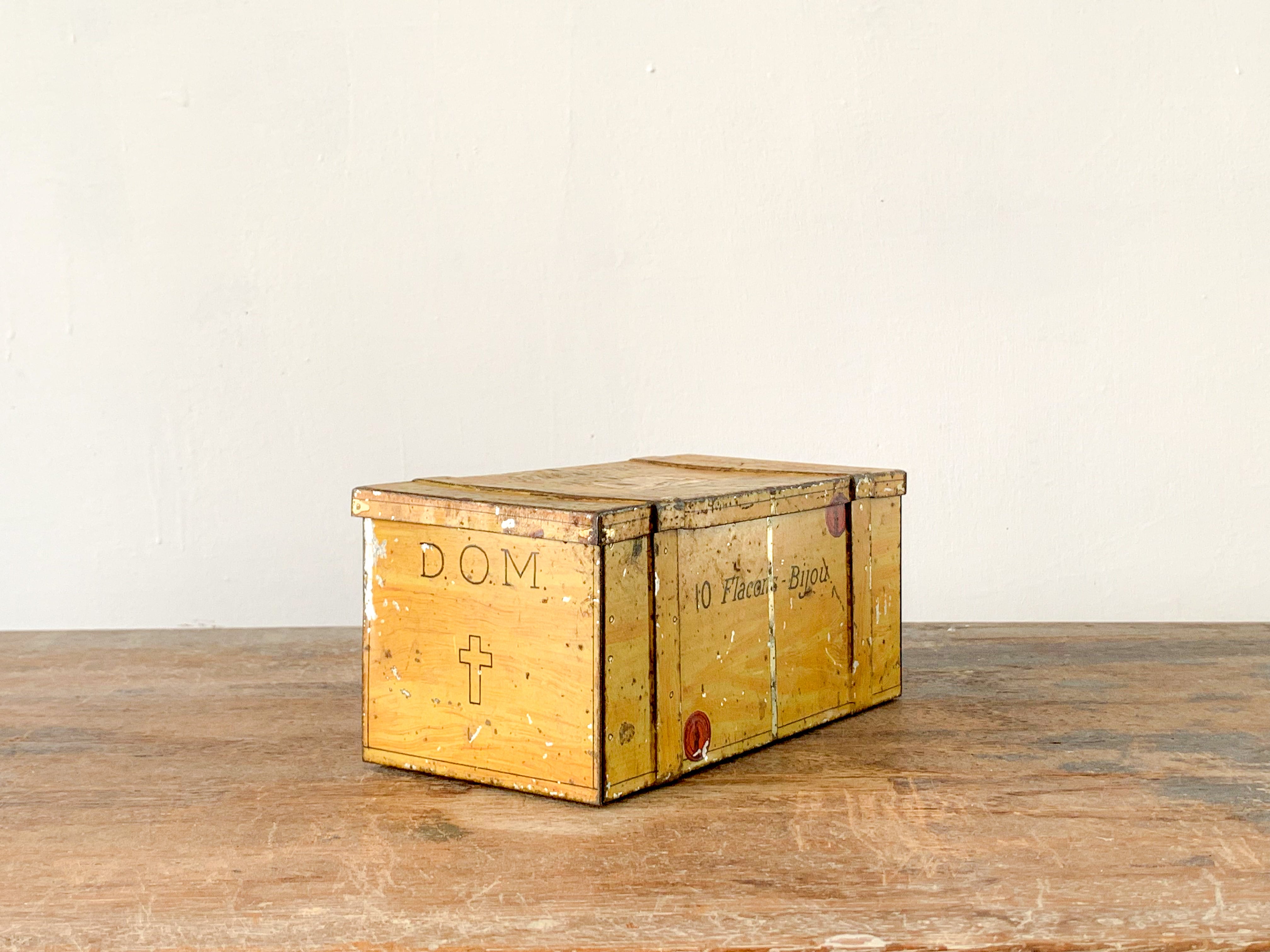 フランスで一目惚れしたブリキのボックス。シーリングが押された木箱をイメージした様なデザイン。Benedictine Liqueurとあります。ベネディクト修道院で作られた世界最古の薬草系リキュールの事の様です。リキュールの小さいボトルを、この箱に入れていたのでしょうか。調べると面白いですね。全てにおいてとても珍しいお品だと思います。