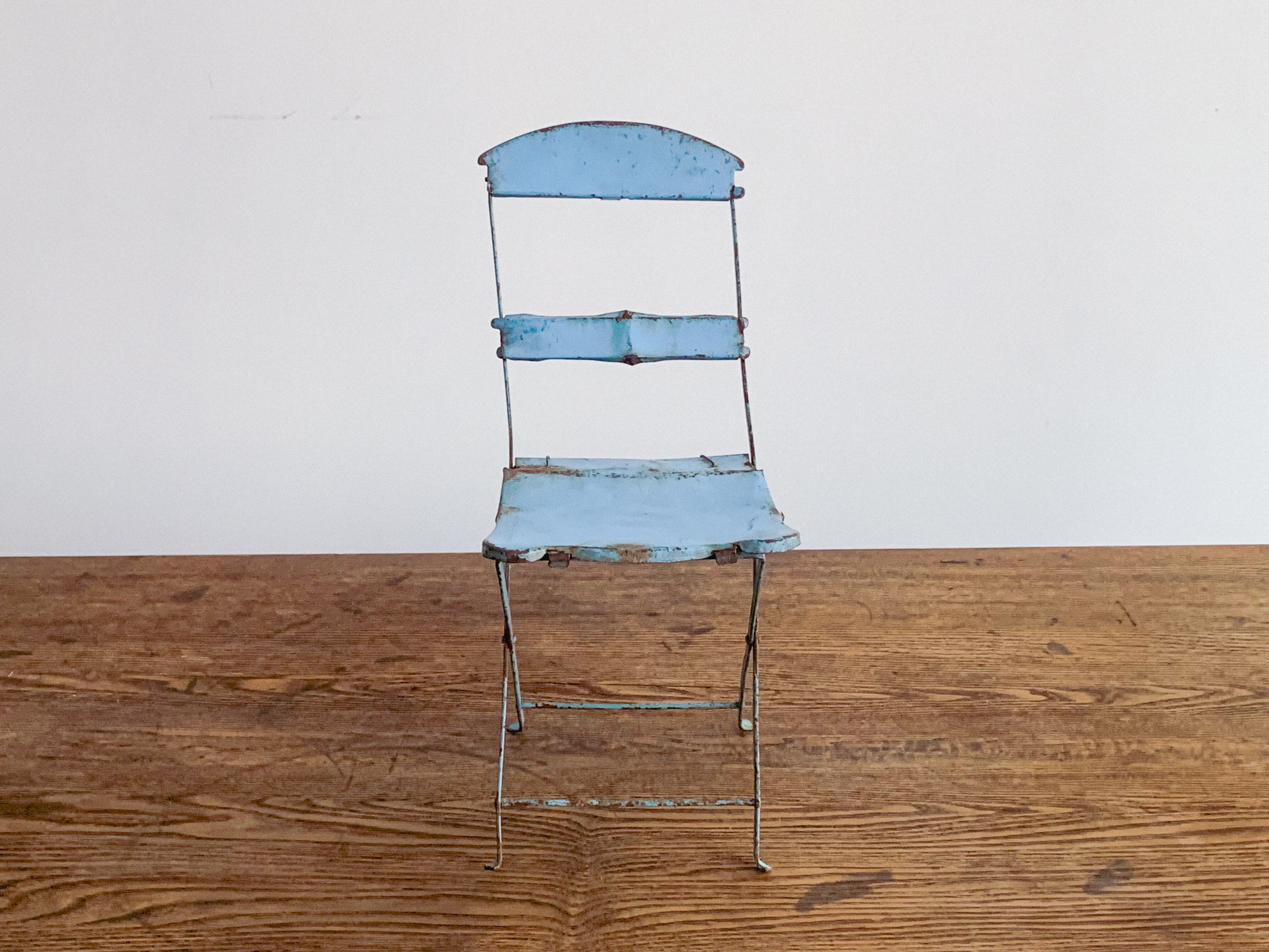 小さなブルーのフォールディングチェア。可愛らしいサイズと色とポンコツ感。この椅子に合う小さなお人形を座らせてあげたい。