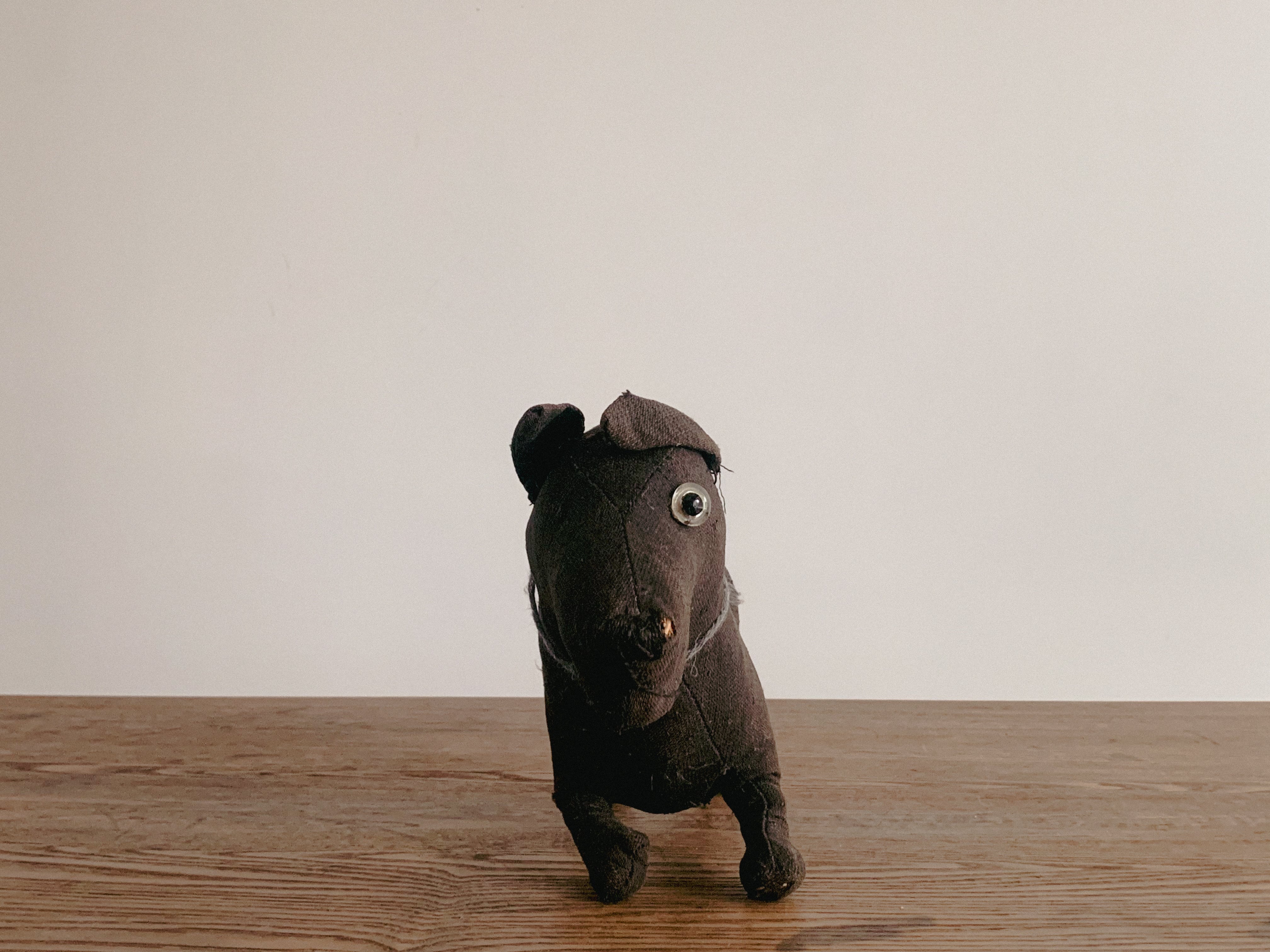 大きな目をした黒いワンコ。嬉しくて、尻尾振って飛びついて来る瞬間に見えます。足の短さも愛おしいです。片目がありませんが、意外に無い側のお顔も可愛いんです。