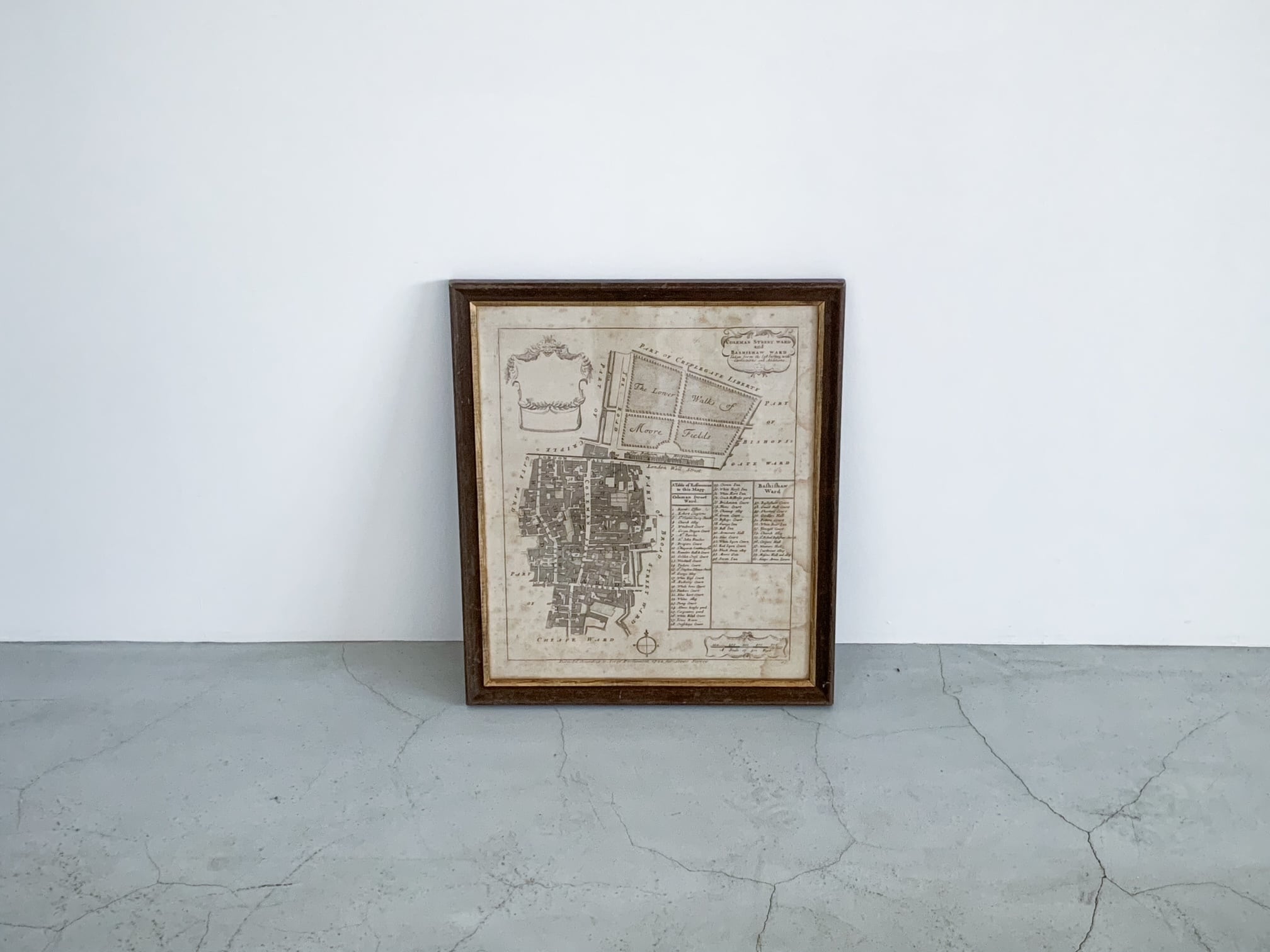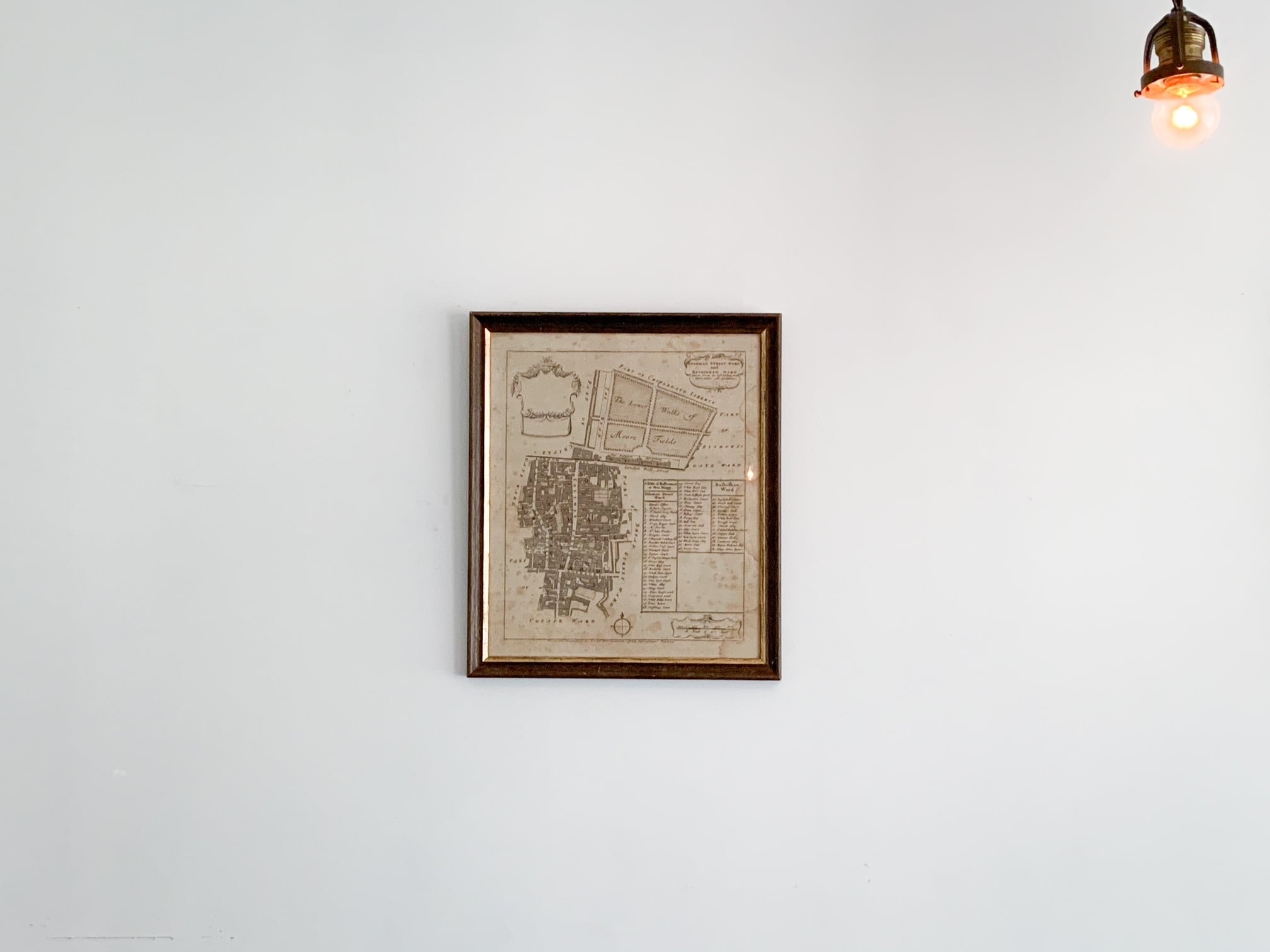 1754年頃の大変古い銅版画の地図になります。貴重なお品であると共に、デザイン的に、とても美しいです。ゴールドの縁取りのあるアンティークフレームと雰囲気が良く合っています。
