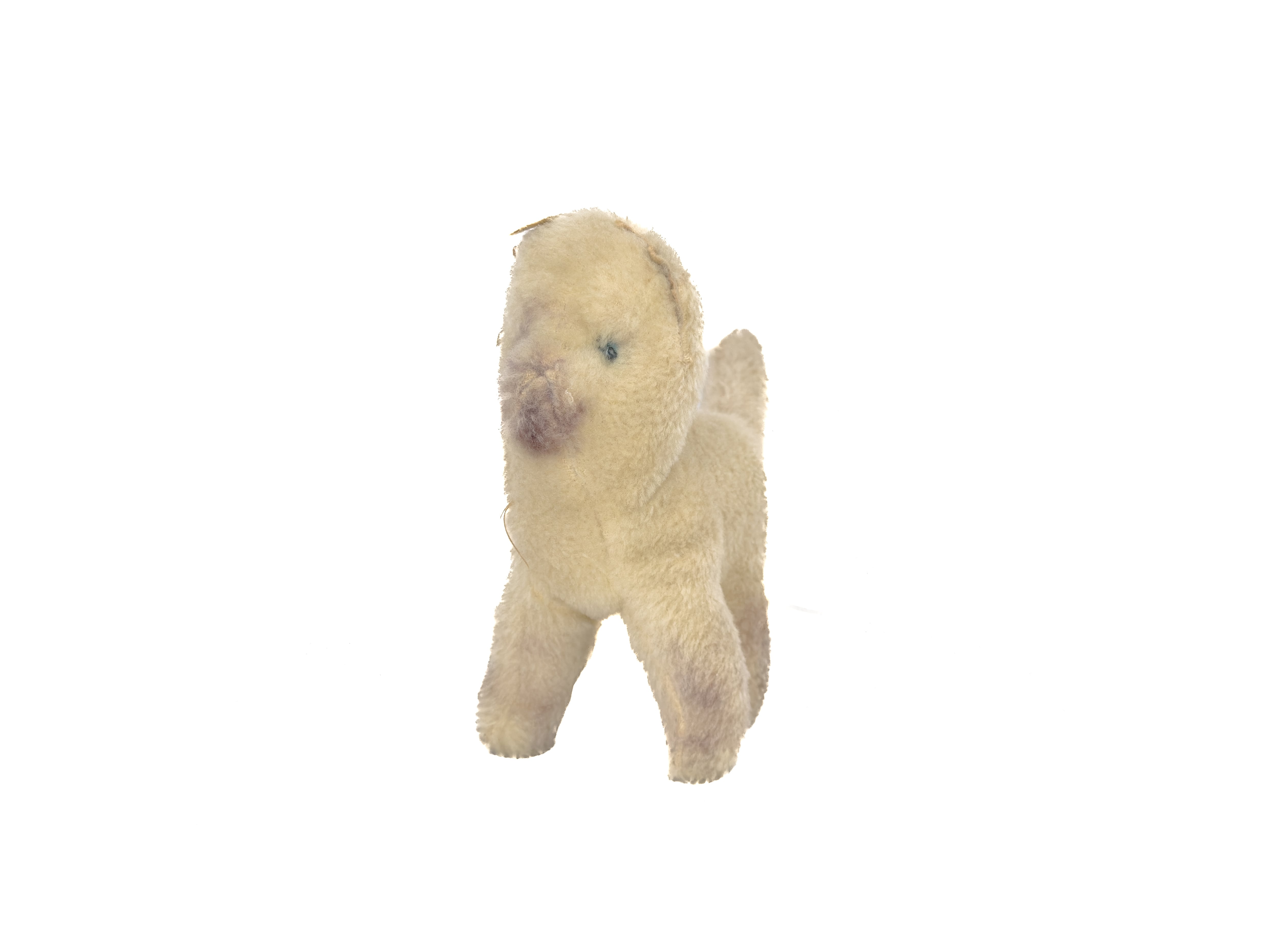 こう見えてネコです。一部残っていますが、耳が取れています。つるんとしていて(何だか大豆みたいに見えます…)、それが愛おしさを募らせます。シャム猫でしょうか?綺麗なブルーの瞳をしています。足をしっかり広げれば自立します。