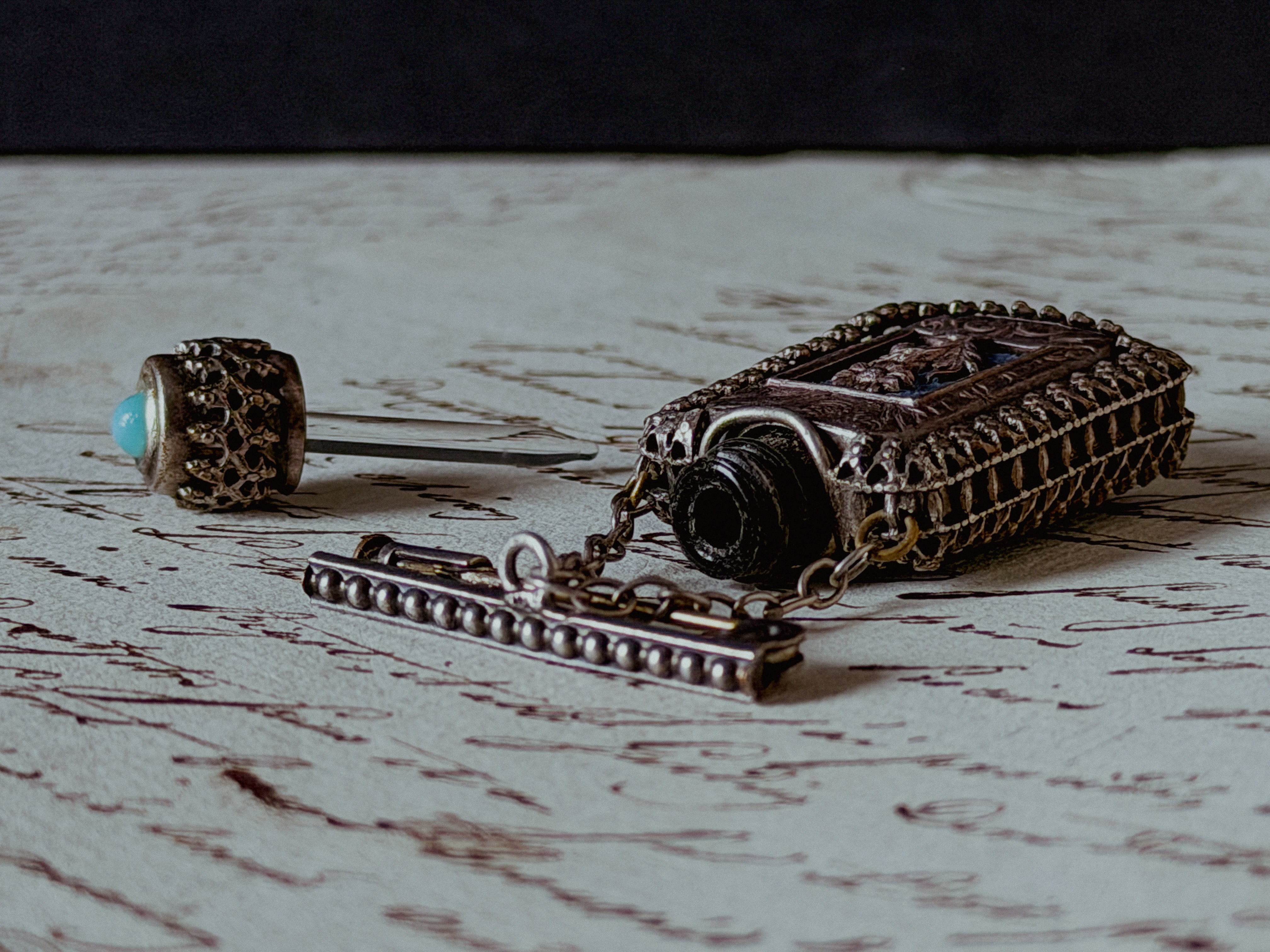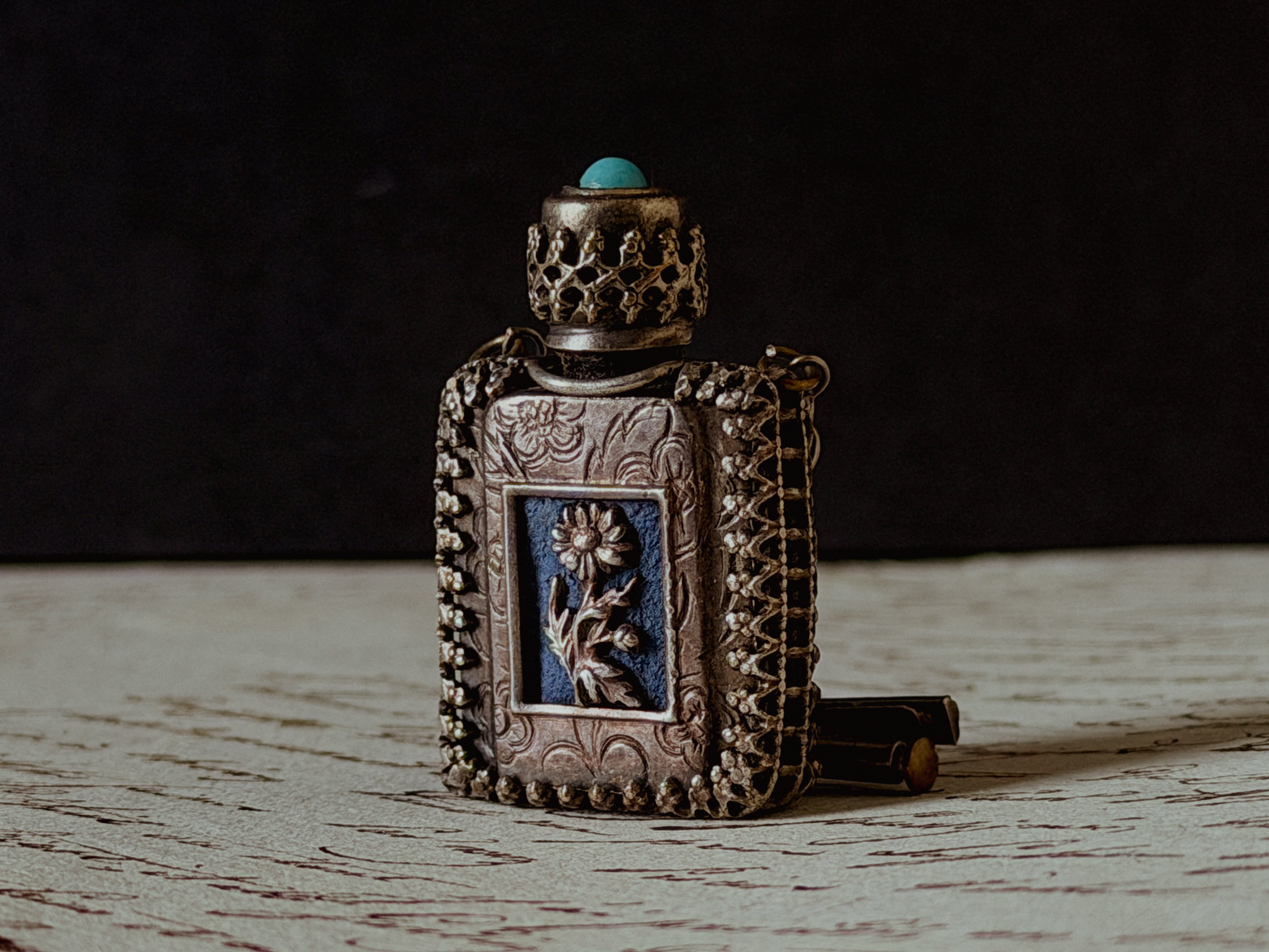 小さな香水瓶のブローチになります。細工の美しさに溜息が出ます。素材はシルバーとガラス(ガラスは黒色)、蓋にはターコイズが付けられています。蓋をとると小さな細いスティックが付いていて、香水をつけやすくなっています。仄かに香水の香りが残っているのが、何だか嬉しい気持ちにさせてくれます。クオリティが高く、なかなか出会う事のない貴重なコレクターアイテムになります。