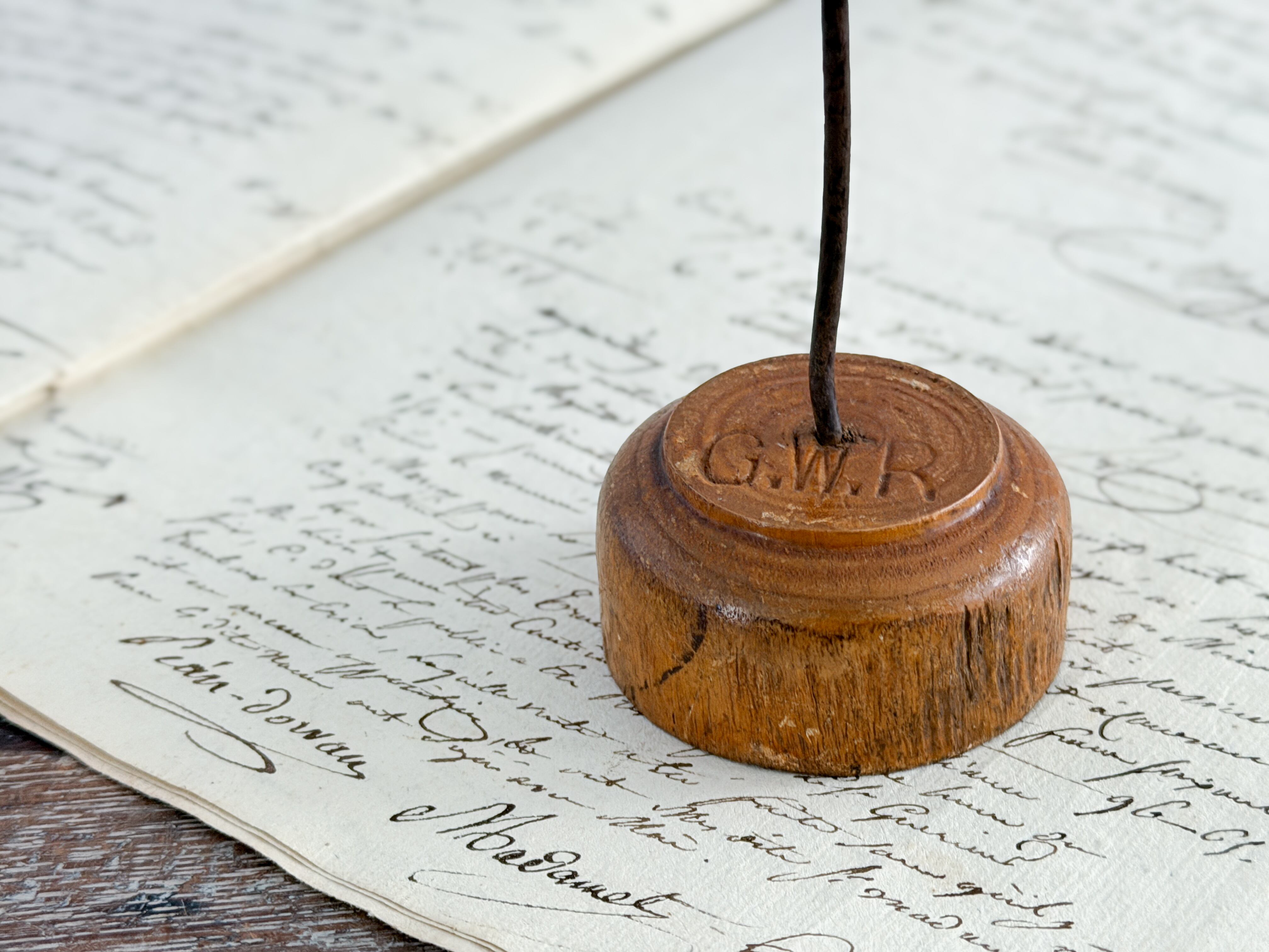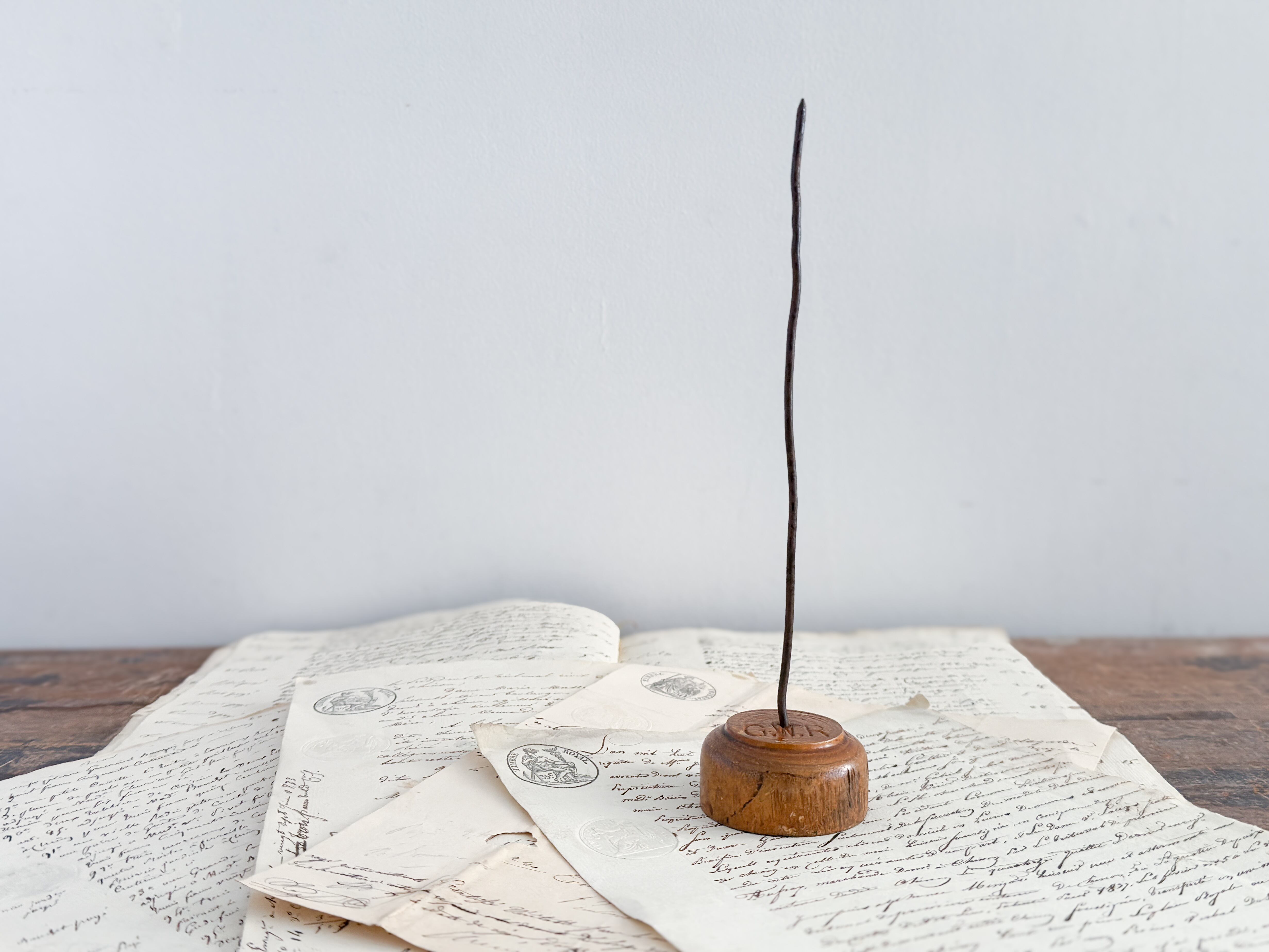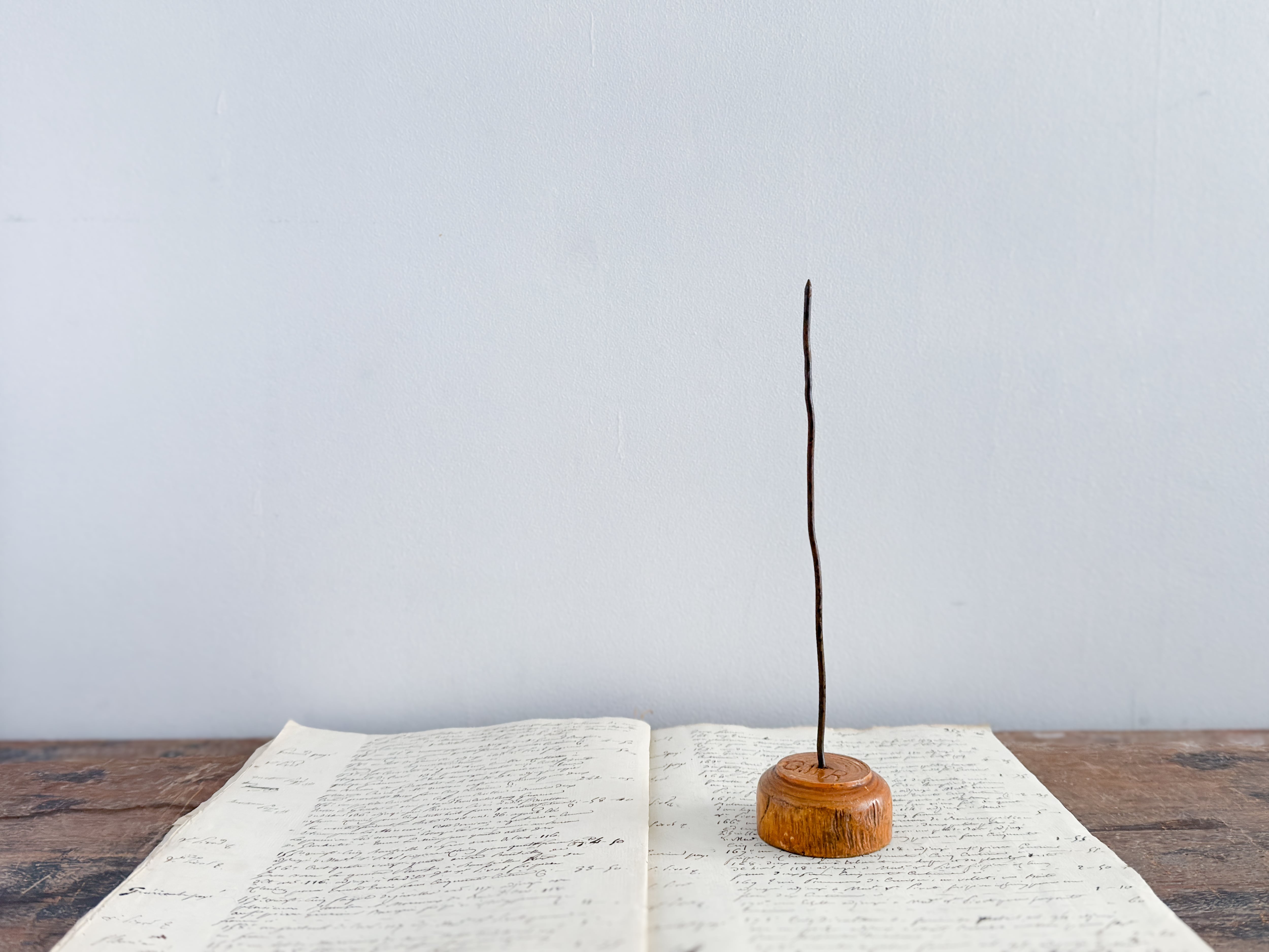 なかなか良いレシートホルダーは意外と少ないですが、こちらは素材感と経年の表情がとても魅力的なお品です。木の色味や枯れ具合、鉄部分の歪みなど、どの要素も雰囲気があり、全体としてバランスの取れた佇まい。