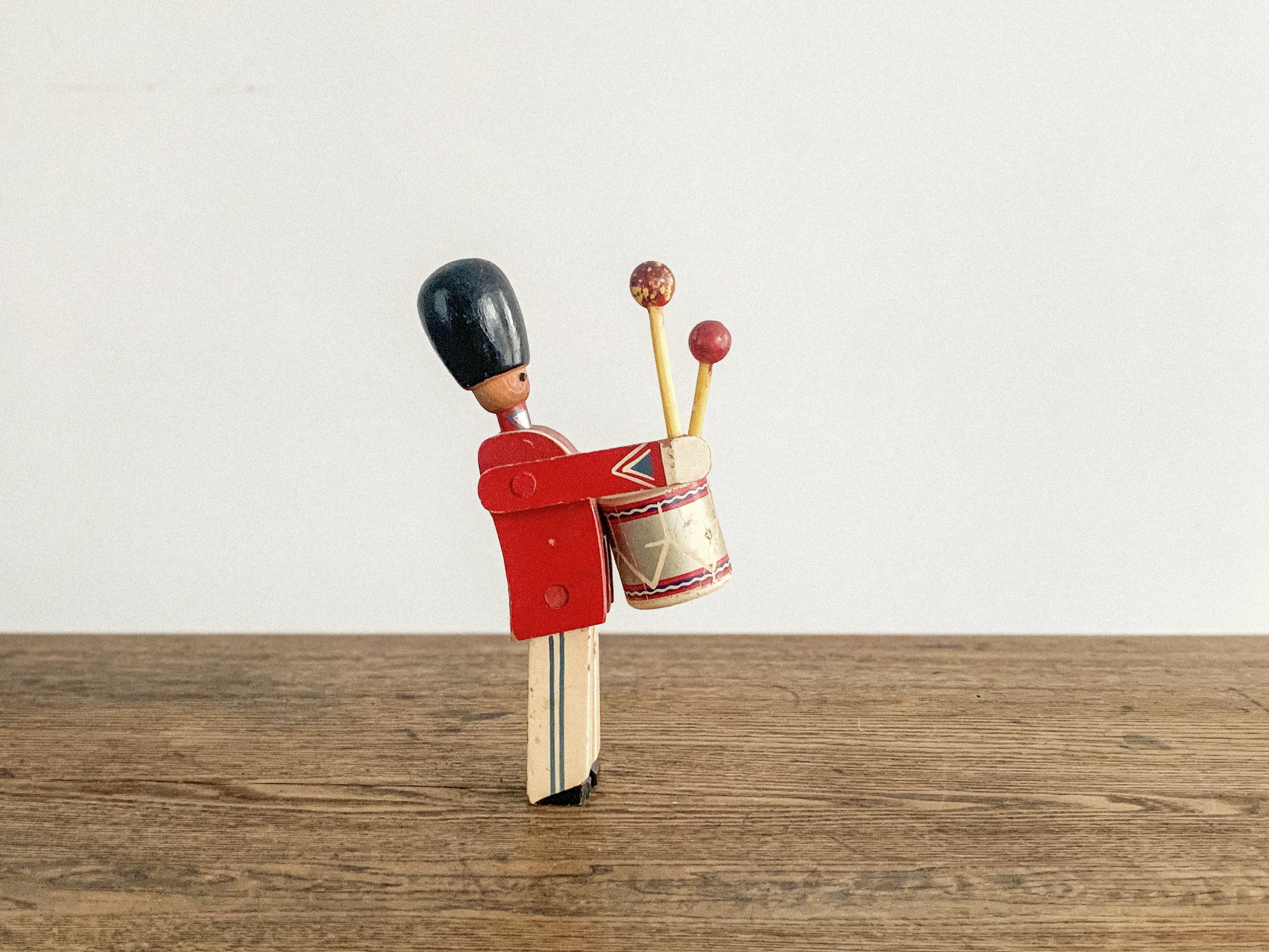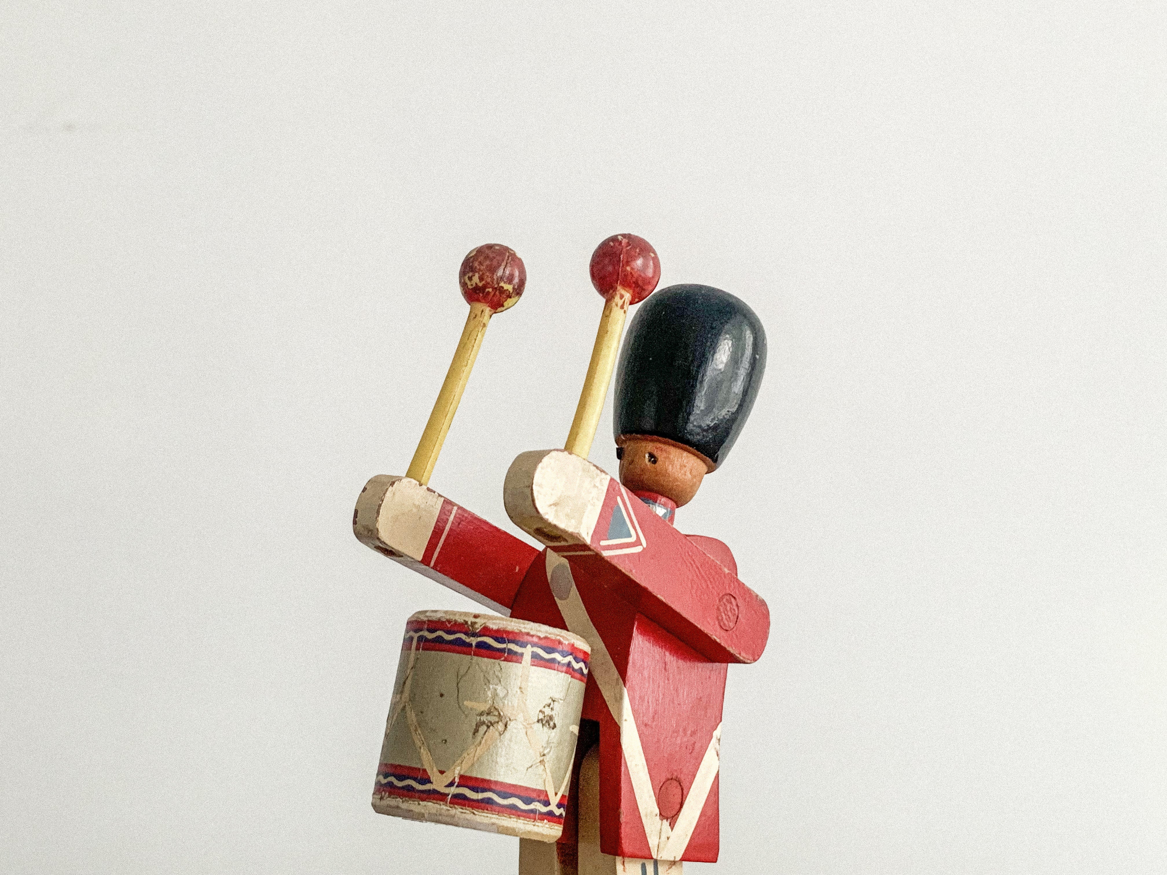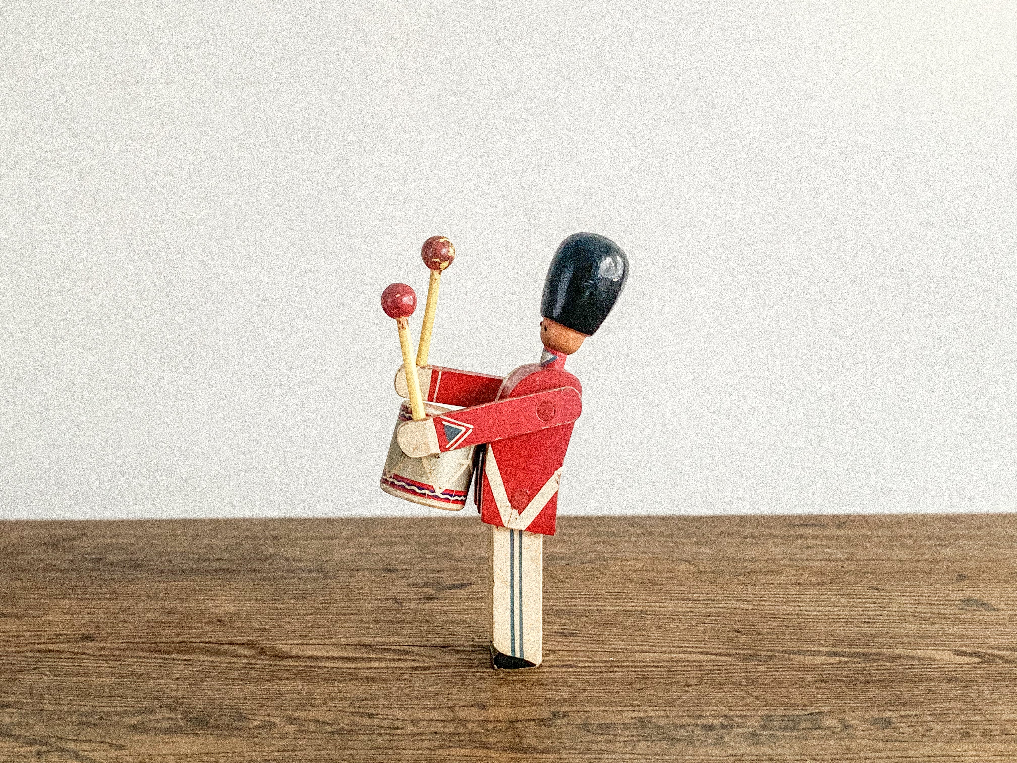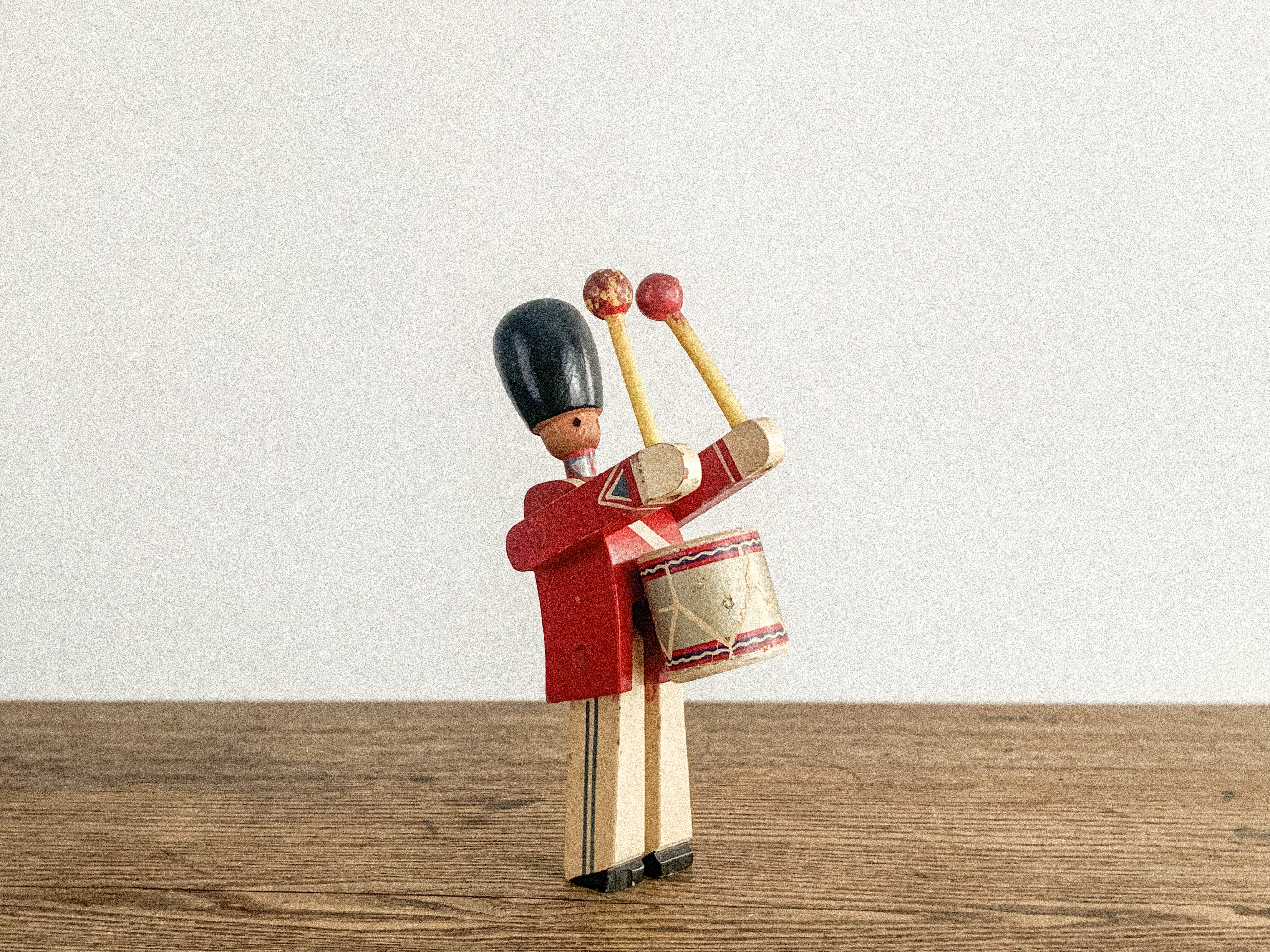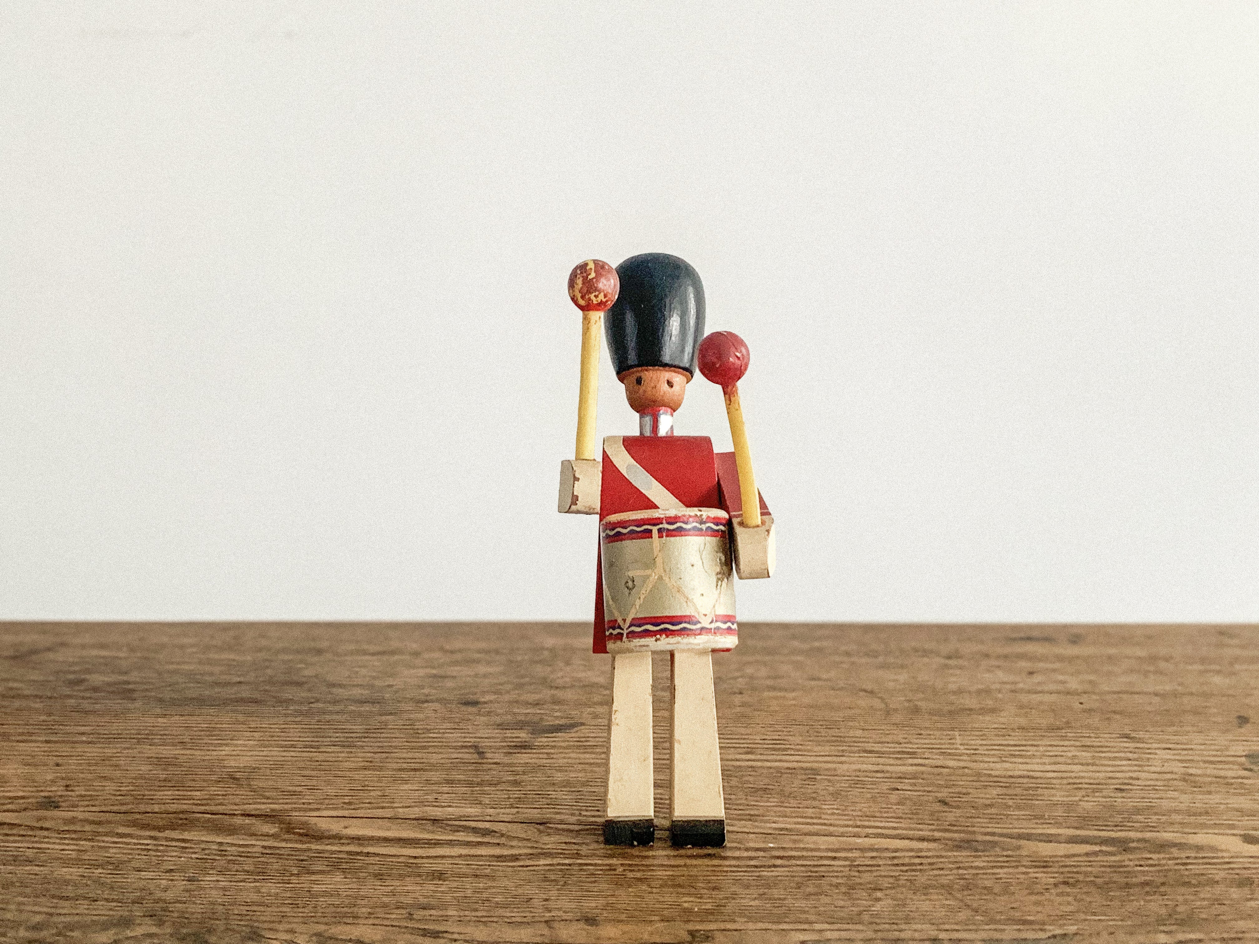 太鼓を叩く木の兵隊。「KAY BOJESEN(カイ・ボイスン)」1942年頃のものかと思われます。太鼓のバチを振り上げ、真剣な表情で太鼓を叩く姿がとても愛らしいです。全体の色合わせも良く、どこに飾っても目を引く存在感があります。手足が可動しますので、いろんなポーズが作れます。復刻版とは異なる、ビンテージならではの良い雰囲気が出ています。少し見難いですが足にKAY BOJESENの刻印があります。