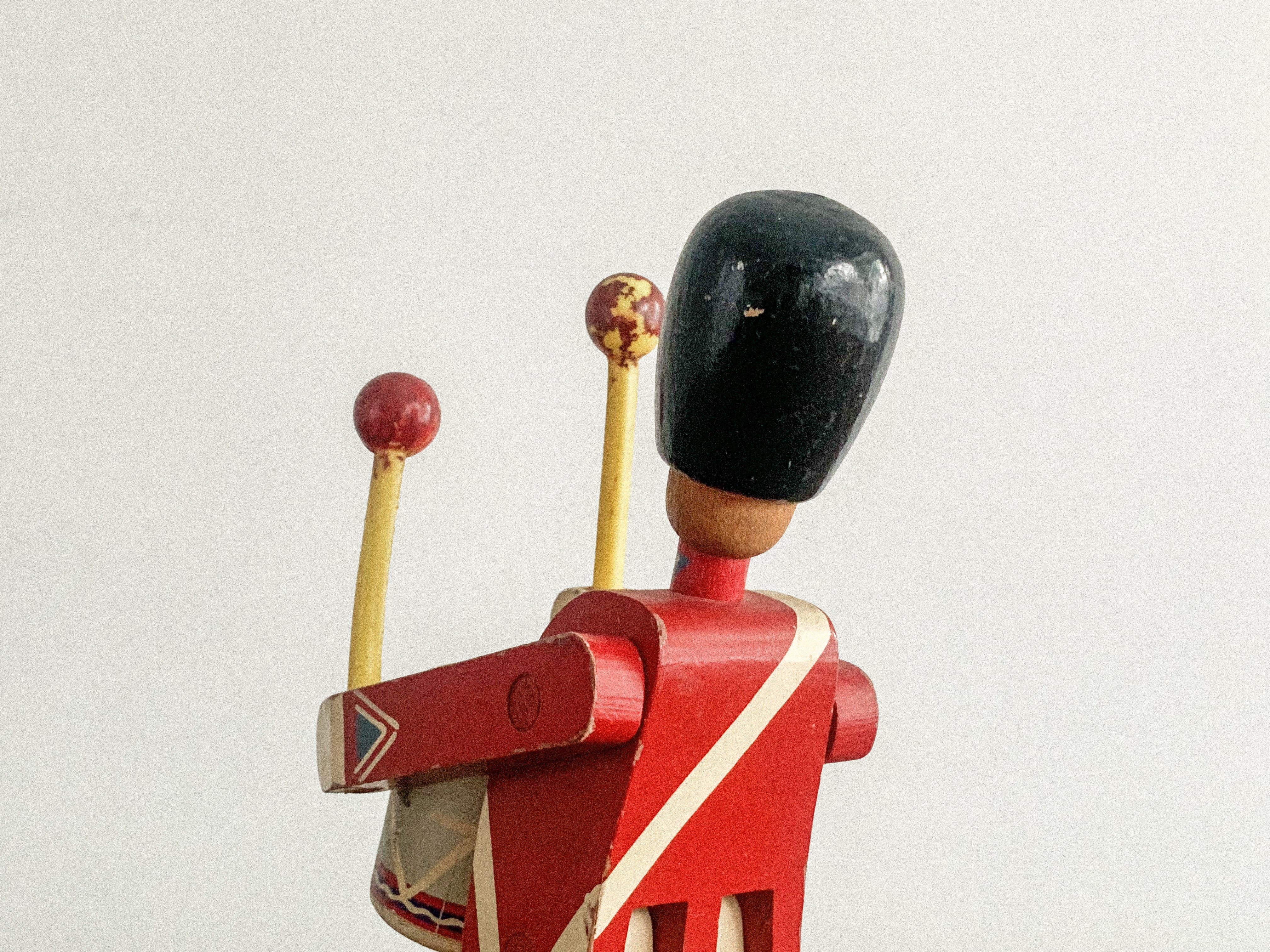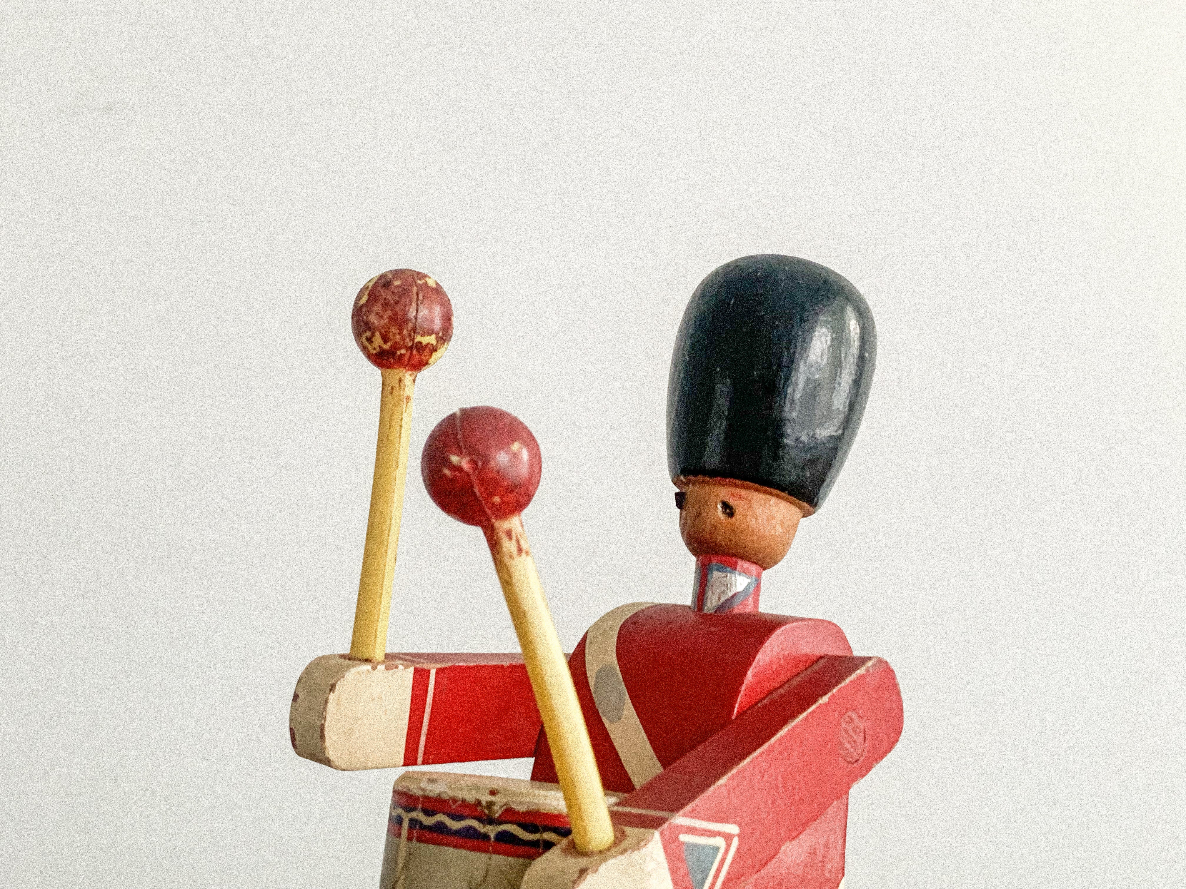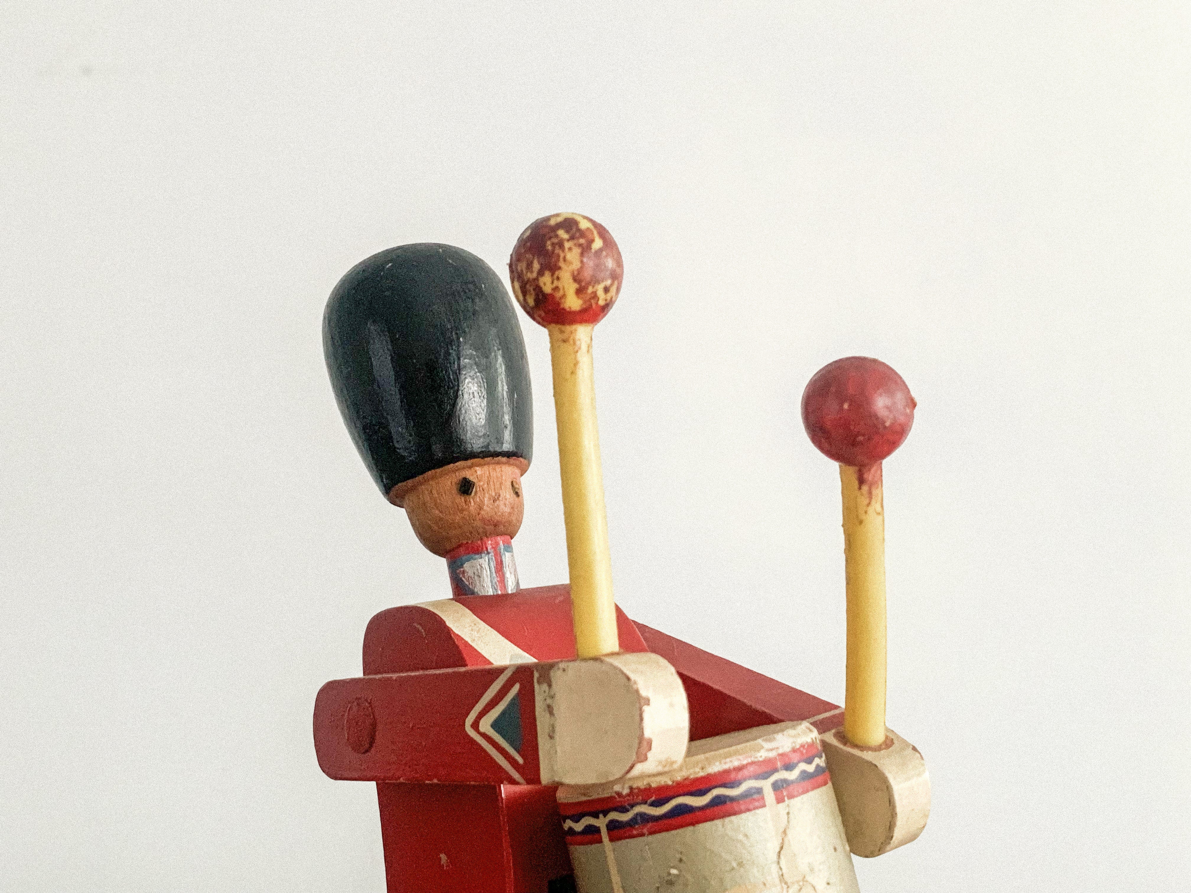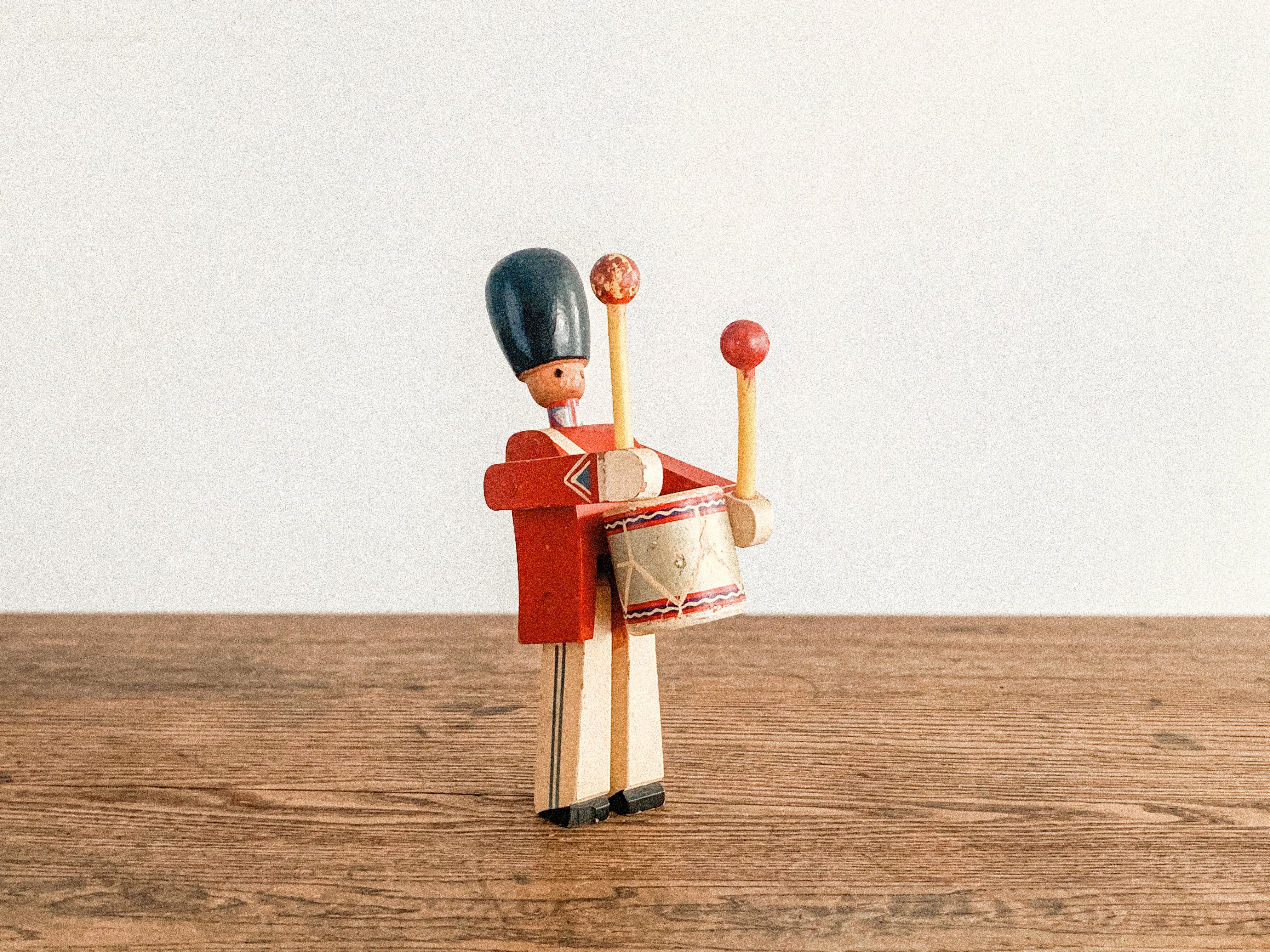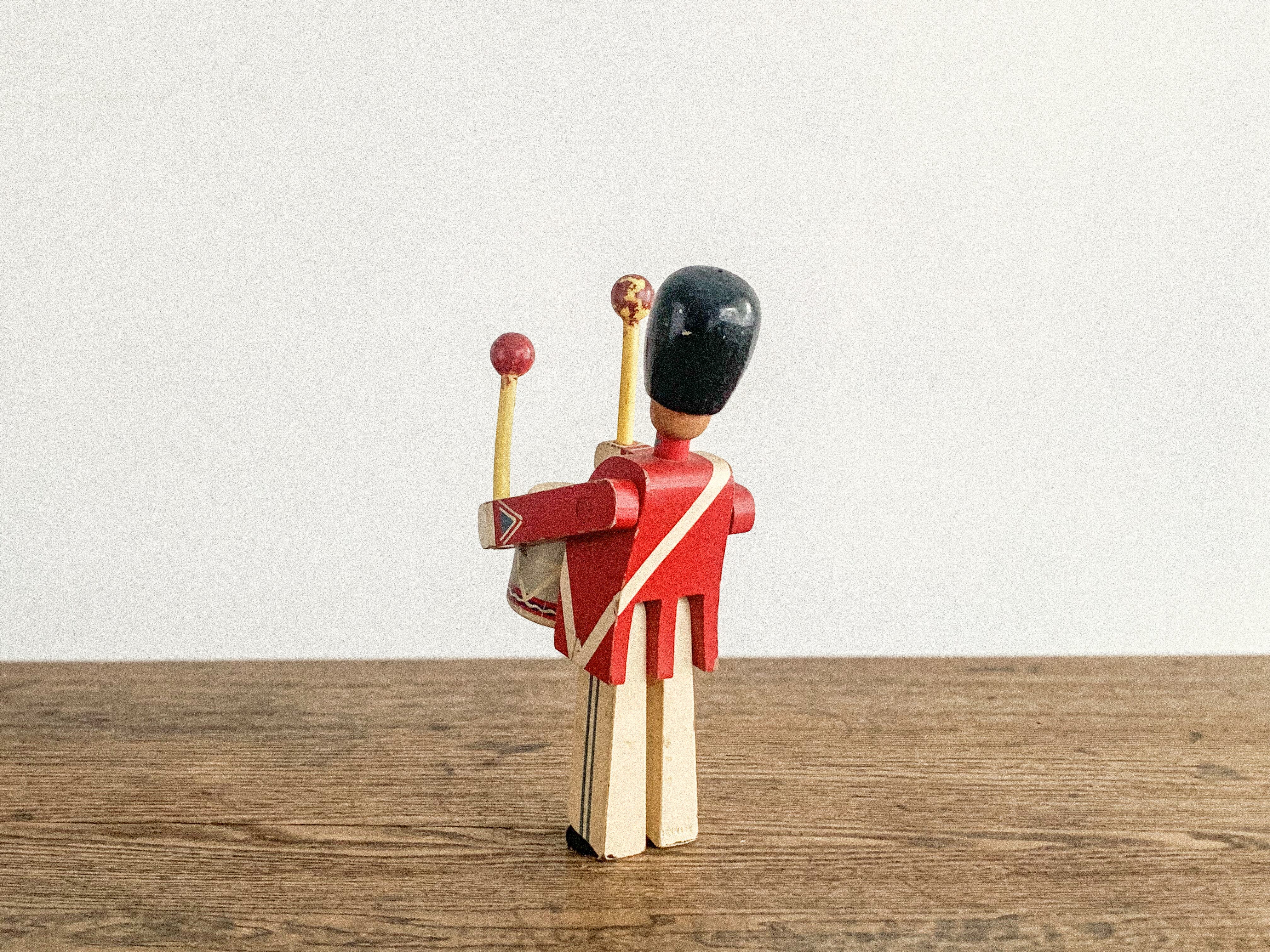 太鼓を叩く木の兵隊。「KAY BOJESEN(カイ・ボイスン)」1942年頃のものかと思われます。太鼓のバチを振り上げ、真剣な表情で太鼓を叩く姿がとても愛らしいです。全体の色合わせも良く、どこに飾っても目を引く存在感があります。手足が可動しますので、いろんなポーズが作れます。復刻版とは異なる、ビンテージならではの良い雰囲気が出ています。少し見難いですが足にKAY BOJESENの刻印があります。