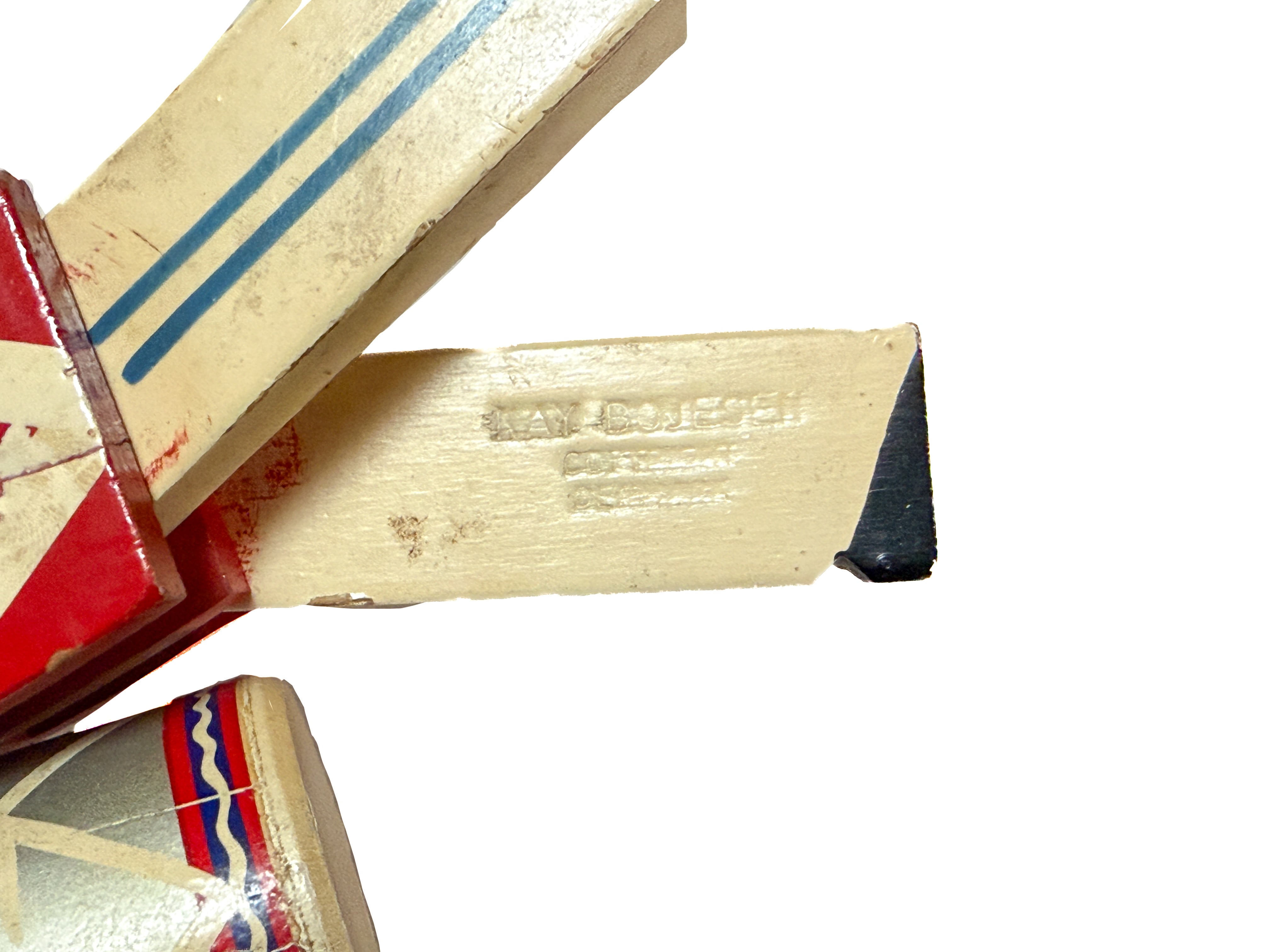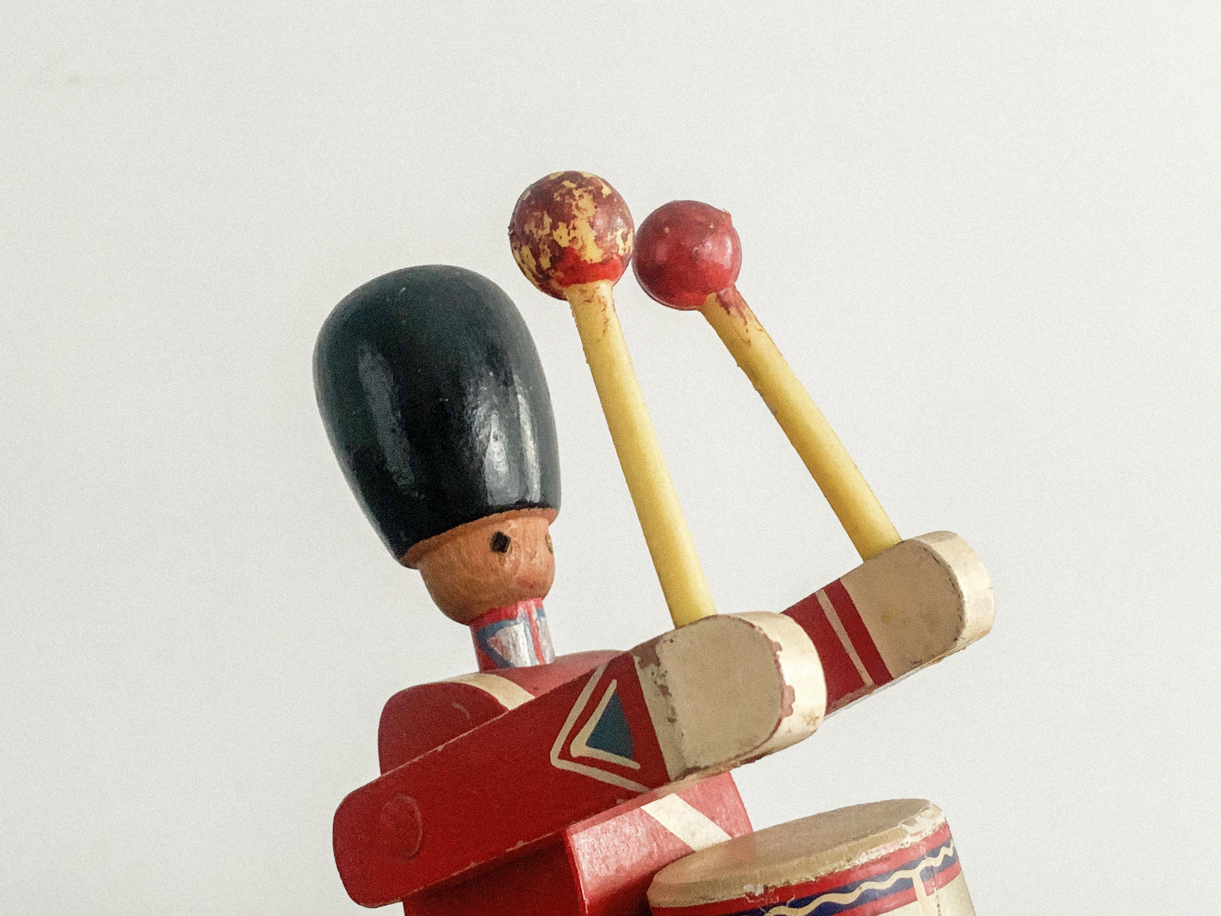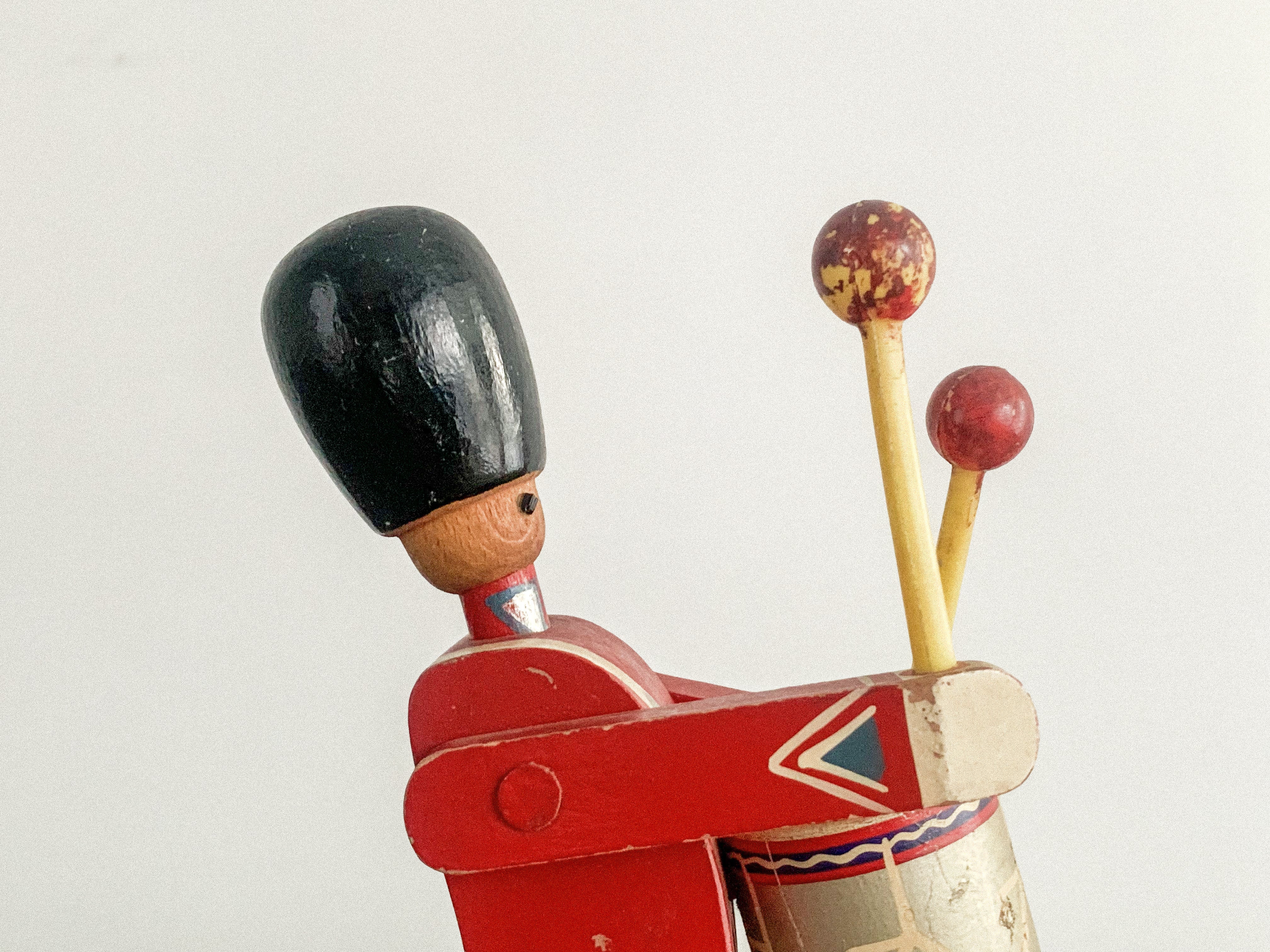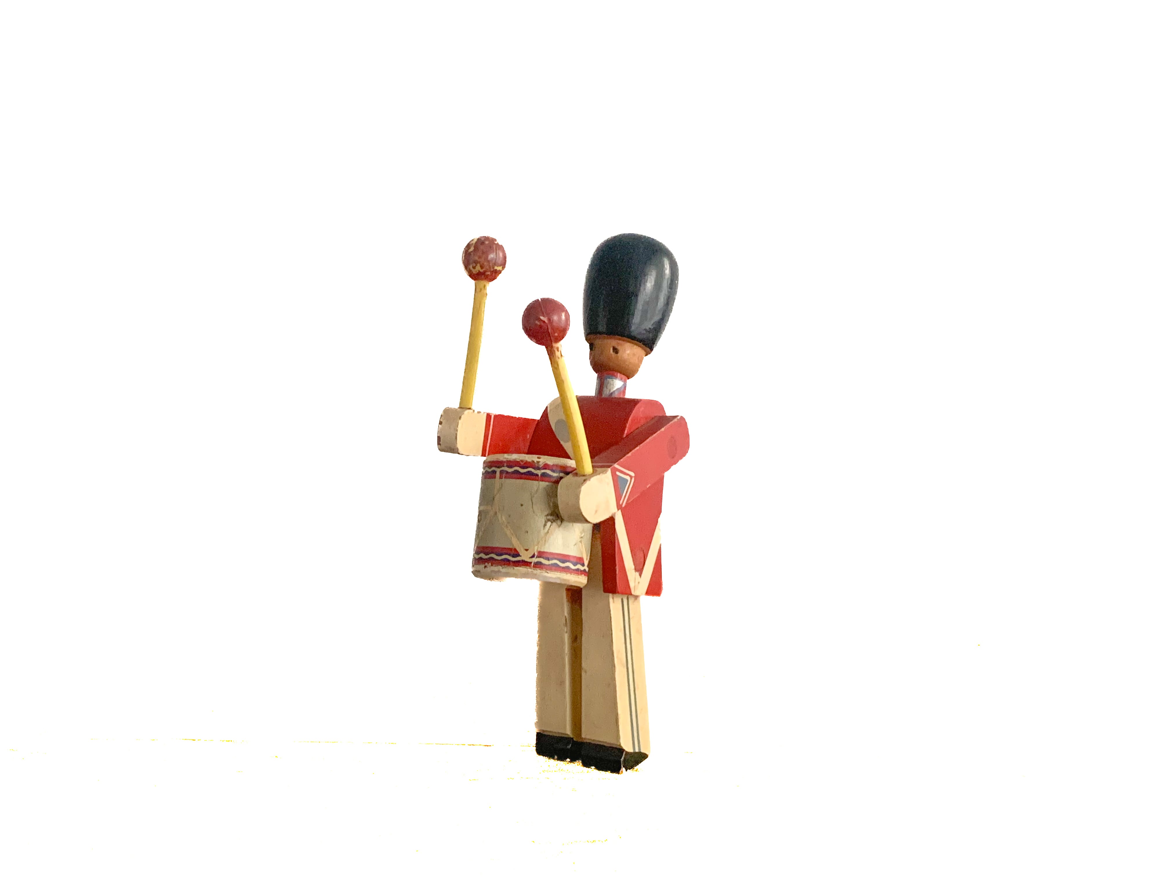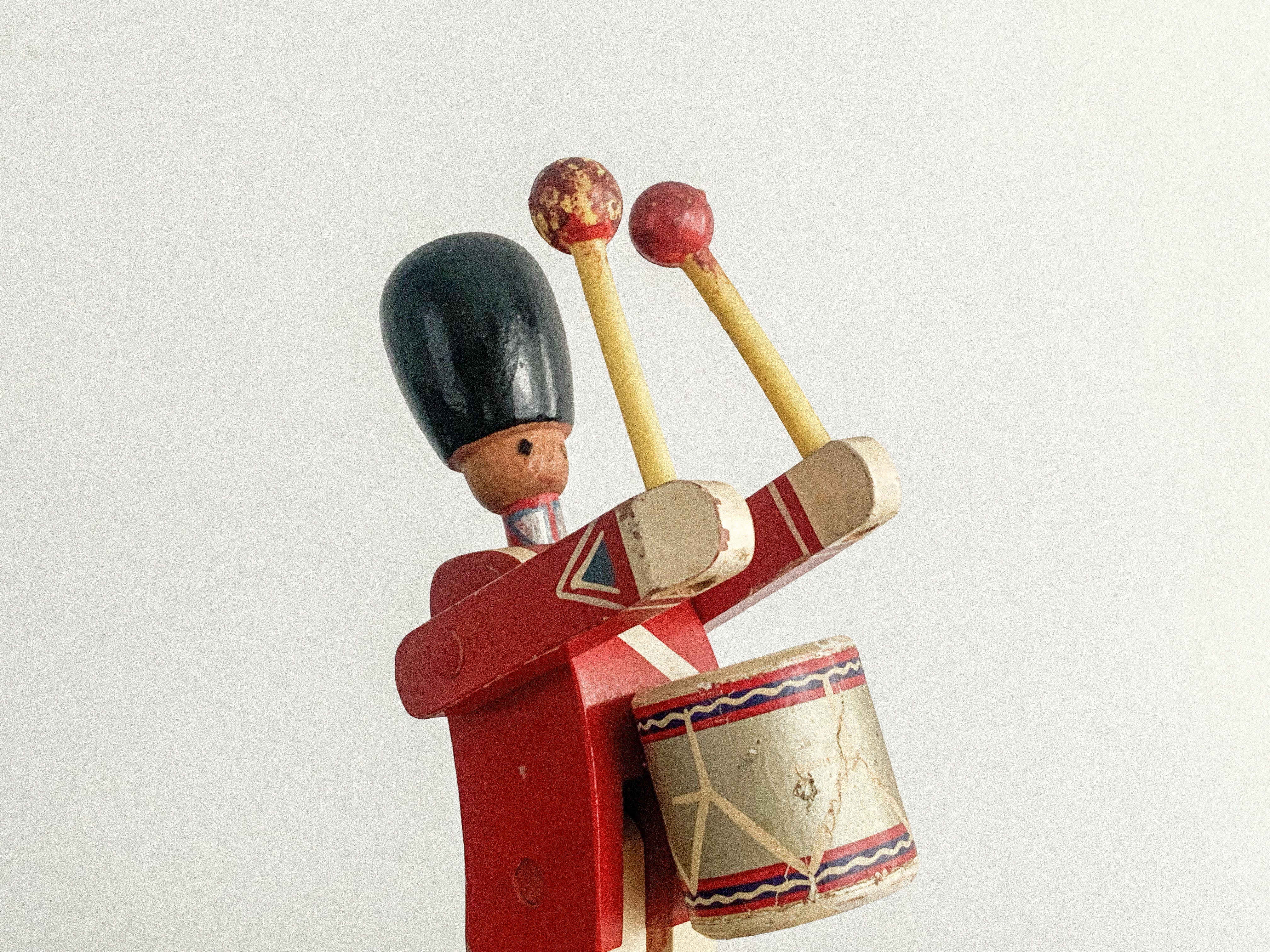 太鼓を叩く木の兵隊。「KAY BOJESEN(カイ・ボイスン)」1942年頃のものかと思われます。太鼓のバチを振り上げ、真剣な表情で太鼓を叩く姿がとても愛らしいです。全体の色合わせも良く、どこに飾っても目を引く存在感があります。手足が可動しますので、いろんなポーズが作れます。復刻版とは異なる、ビンテージならではの良い雰囲気が出ています。少し見難いですが足にKAY BOJESENの刻印があります。