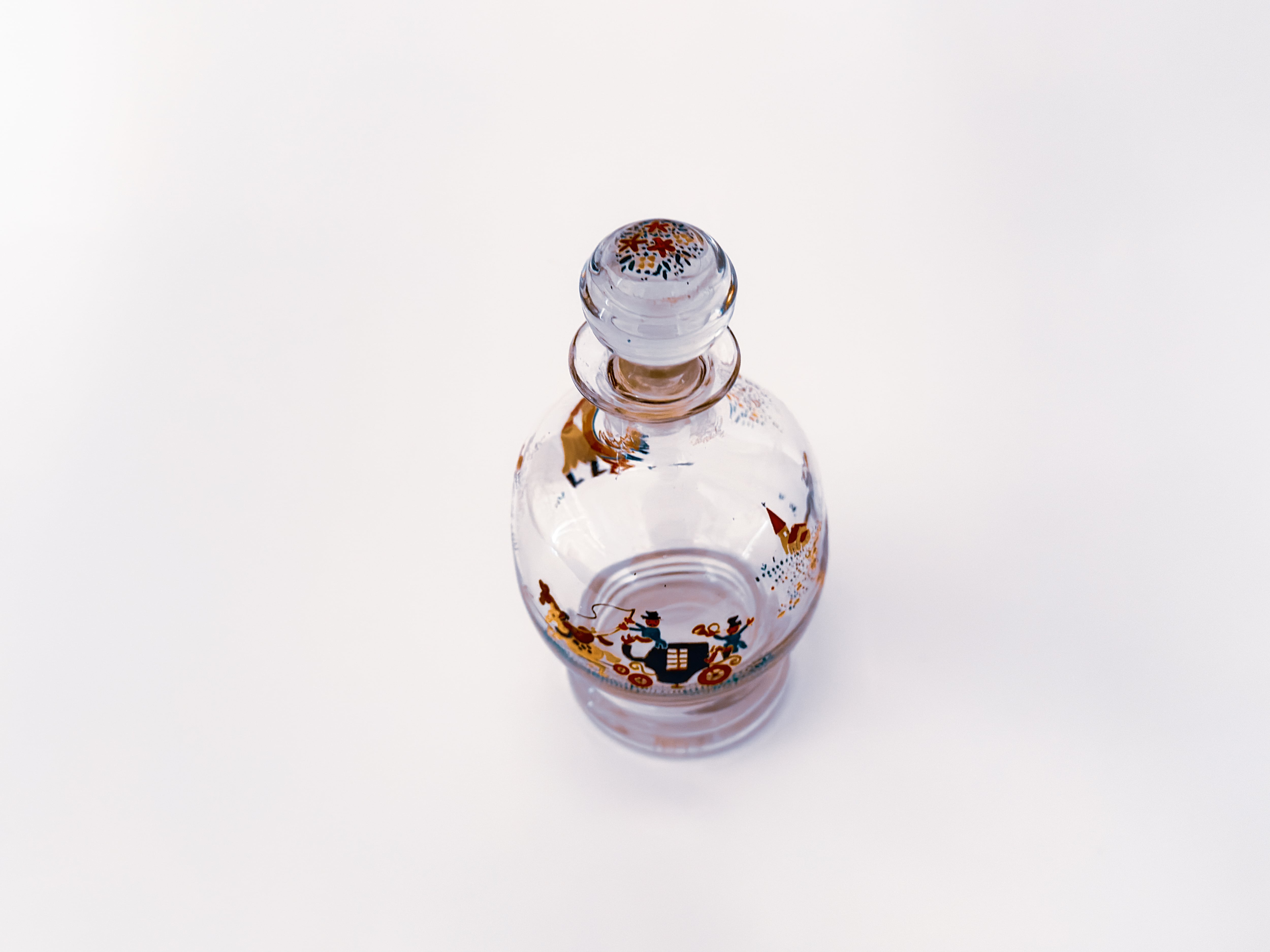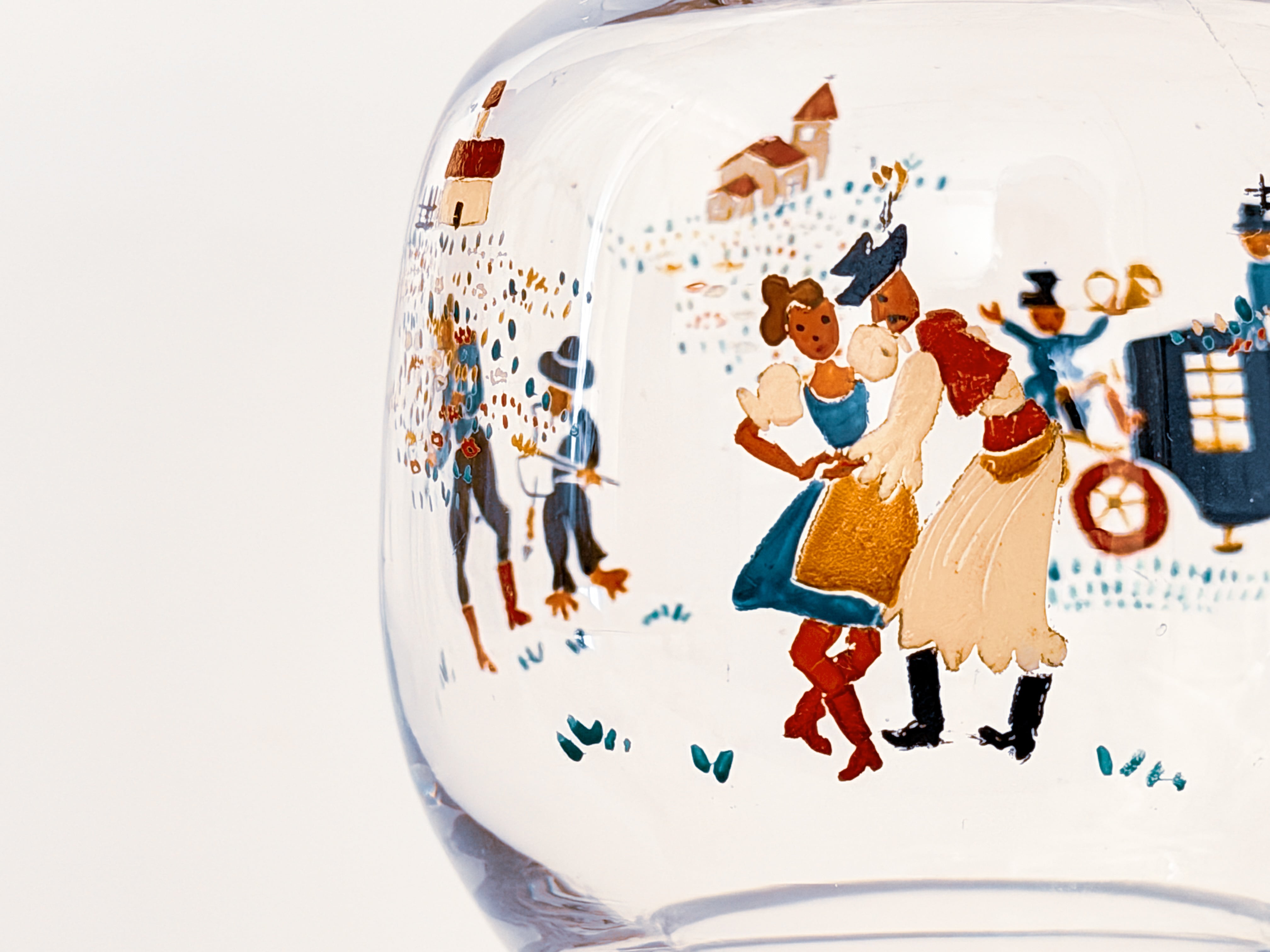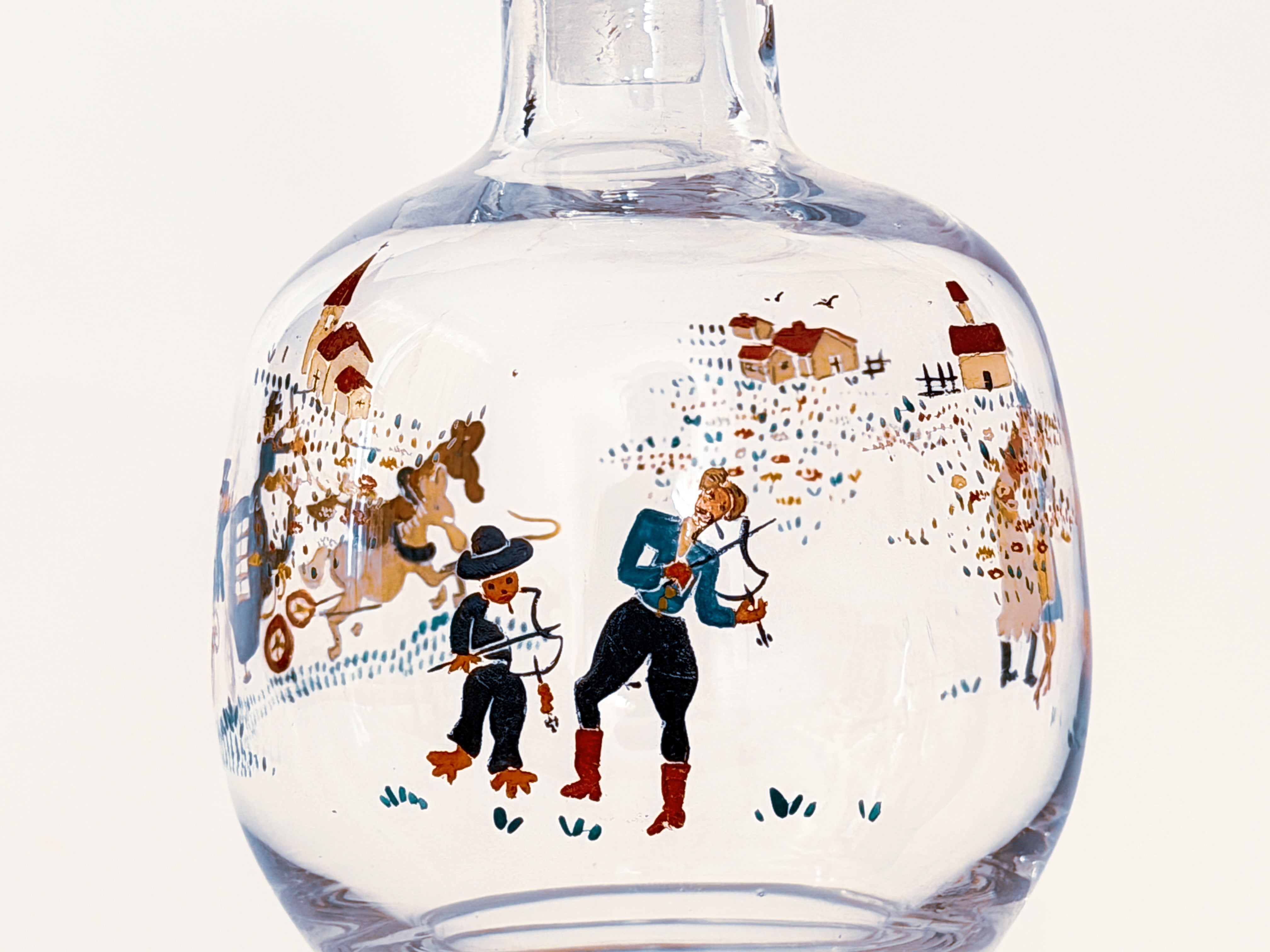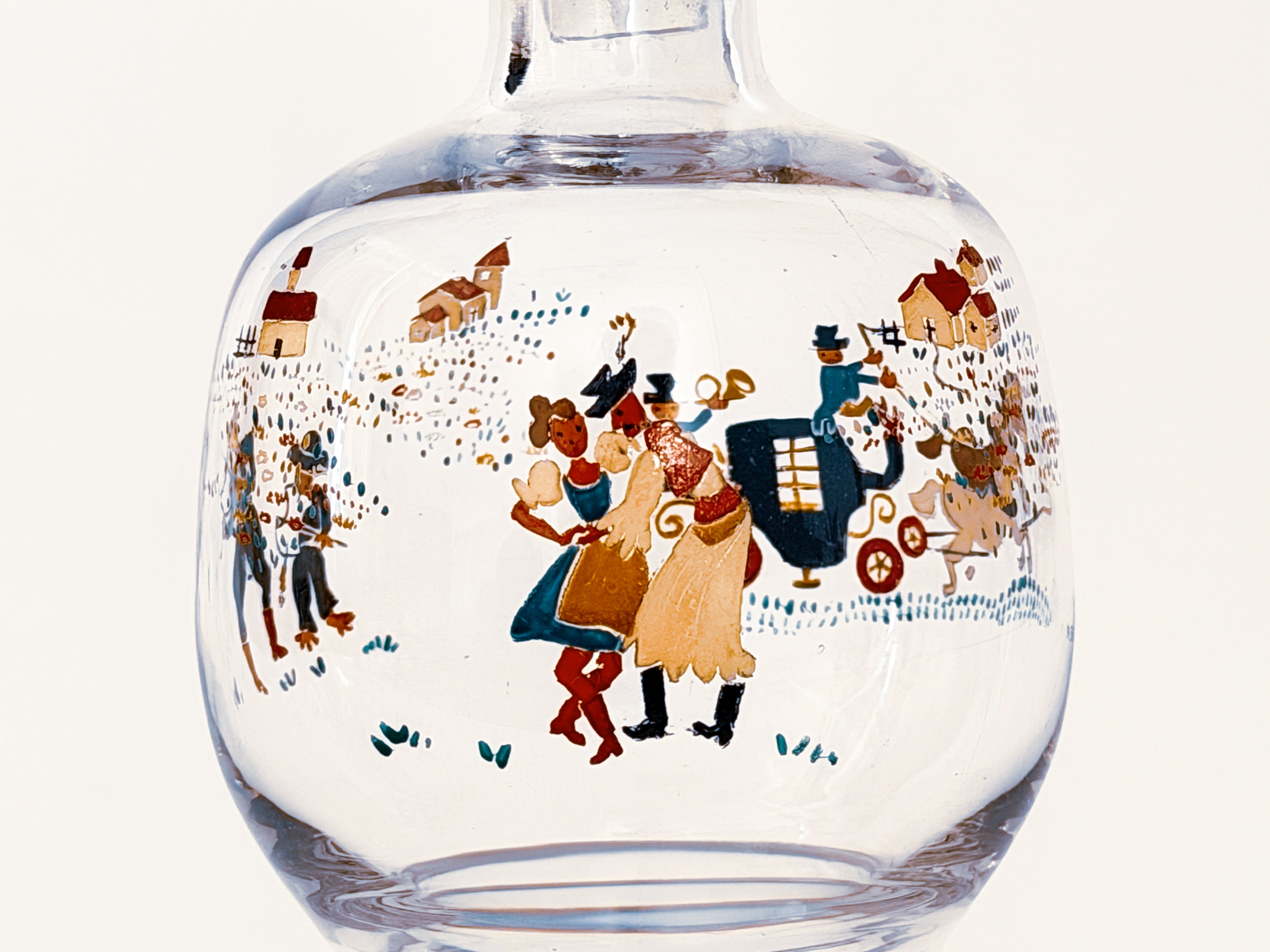 フランスで見つけた古いガラスのデキャンタ。エナメル彩で描かれた絵がとても可愛らしいです。踊る人、音楽隊、馬車、お花畑に赤い屋根の家々。フランスの小さな村でのお祭りが描かれています。ぐるりと一周描かれた絵は、どこから眺めても楽しく、飾ってあるだけでも幸せな気持ちになります。丸い栓の形も美しいです。食前酒やリキュールに用に、花瓶としても使えます。同じシリーズの小さなグラスもあり、並べるとひとつの世界が広がります。アンティークのガラスコレクションとしても、おすすめのお品です。