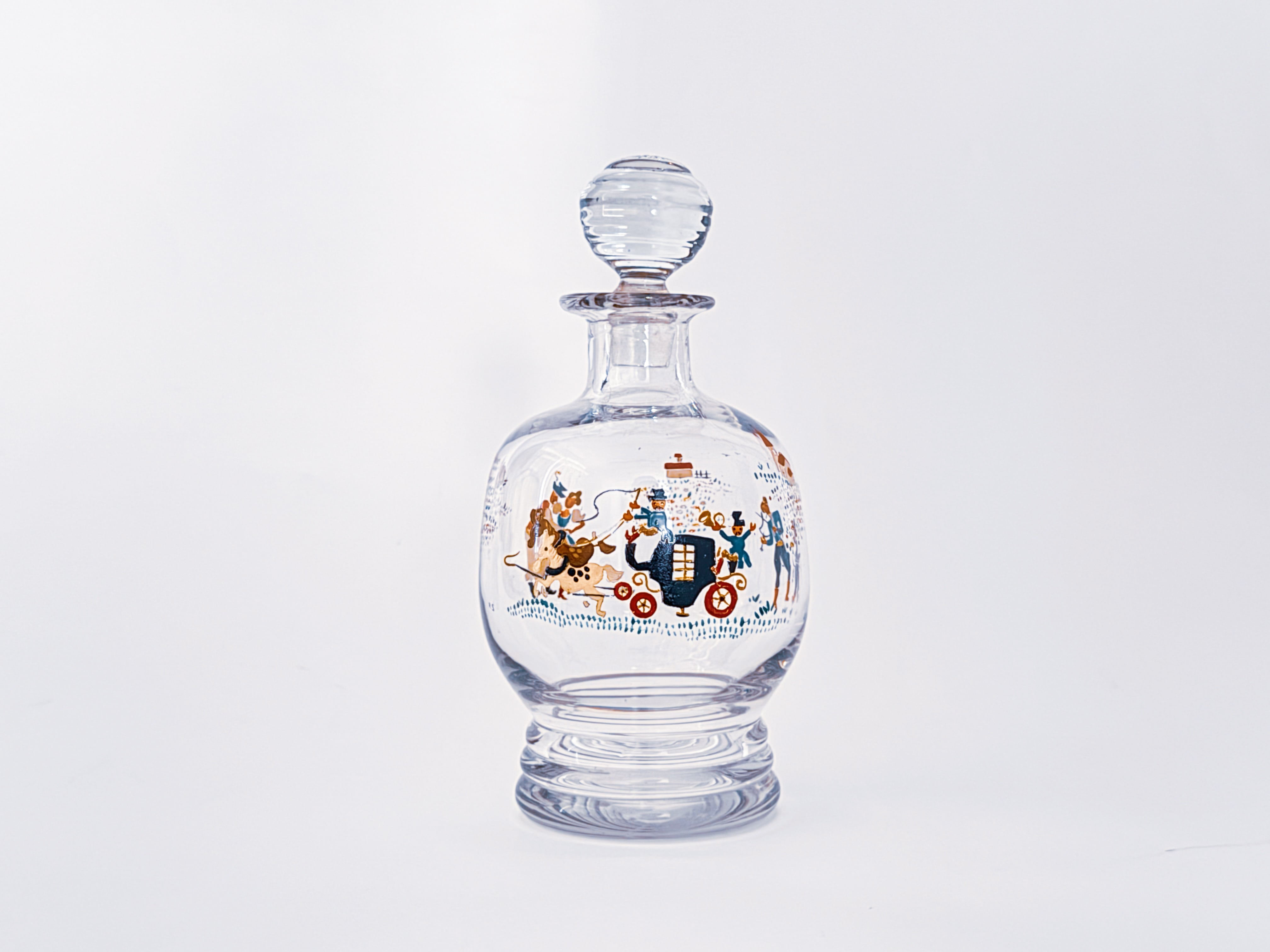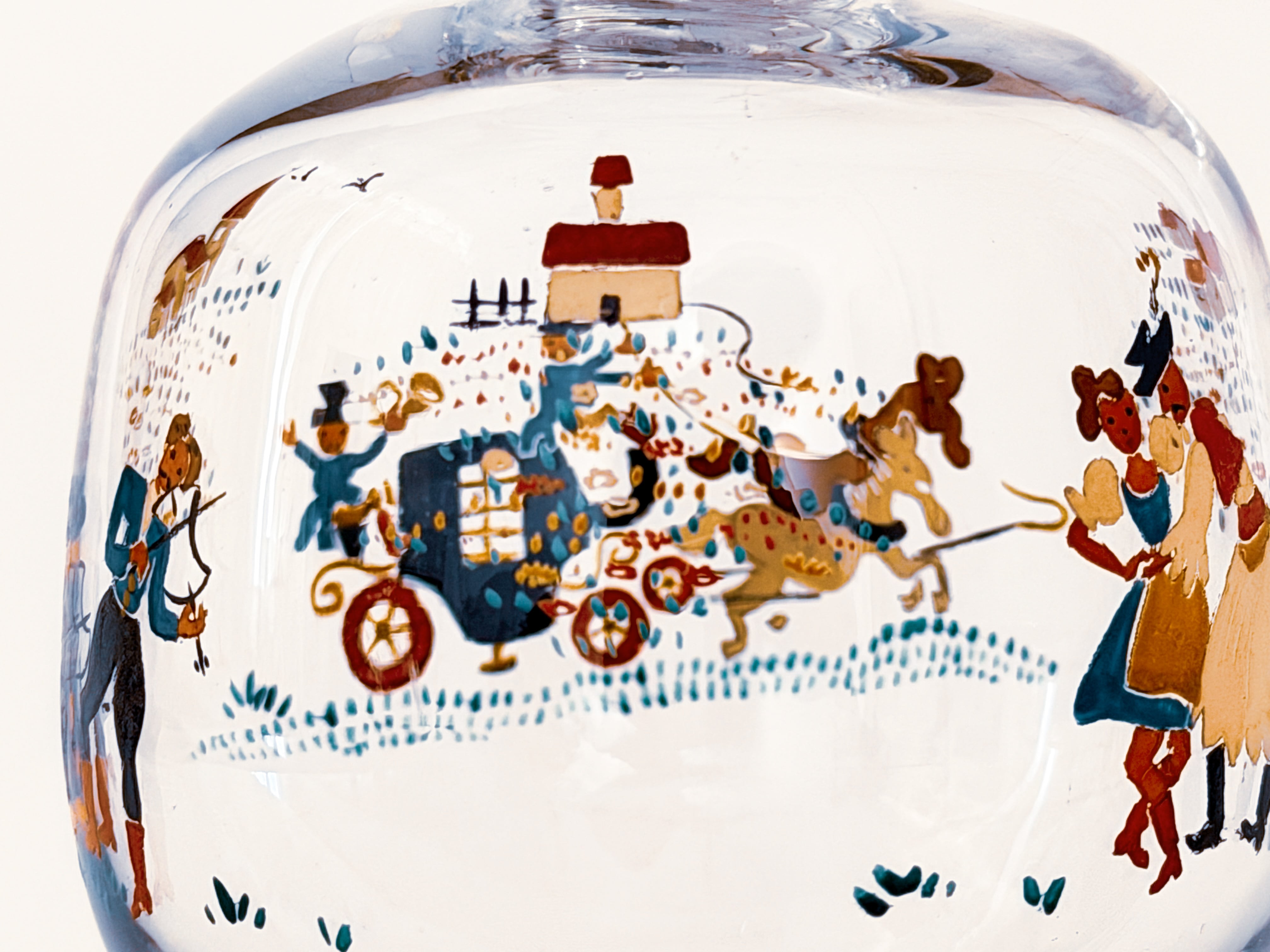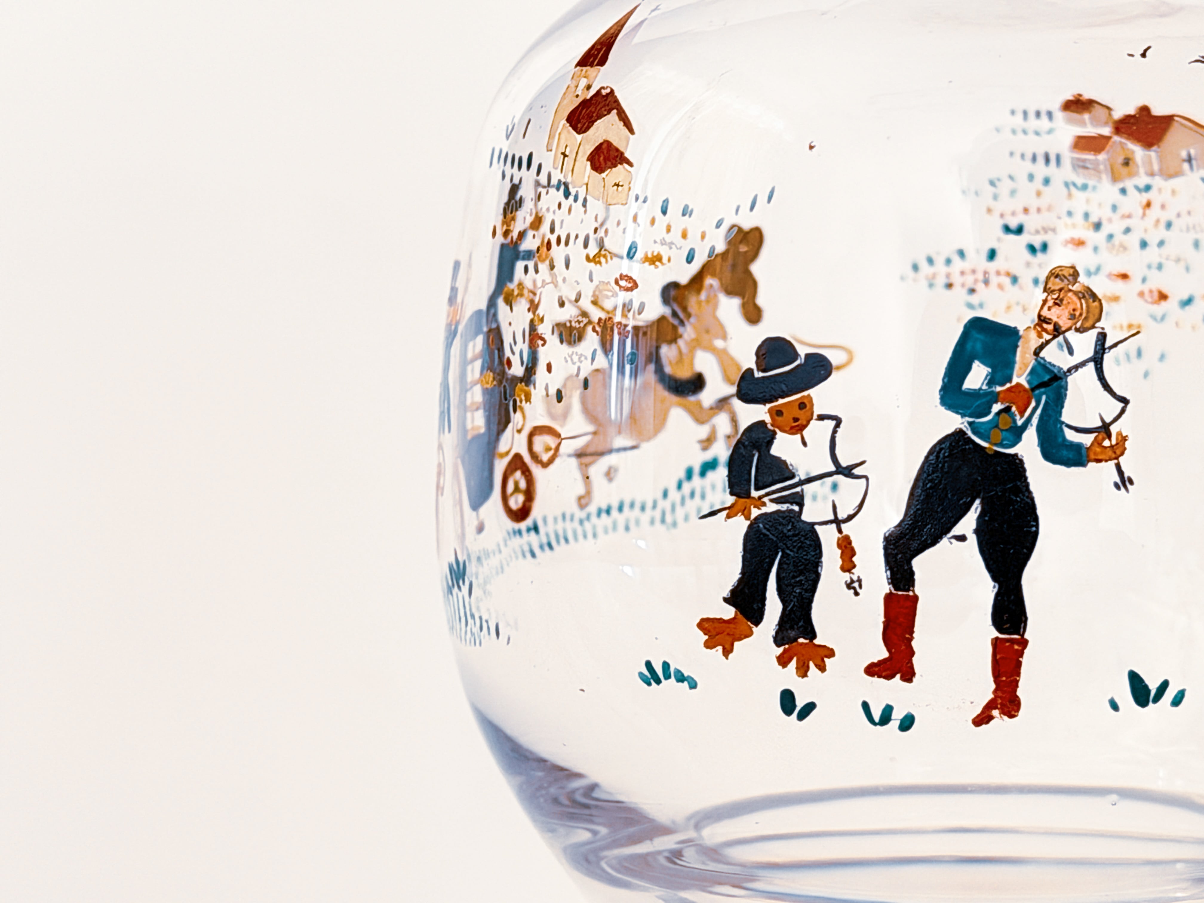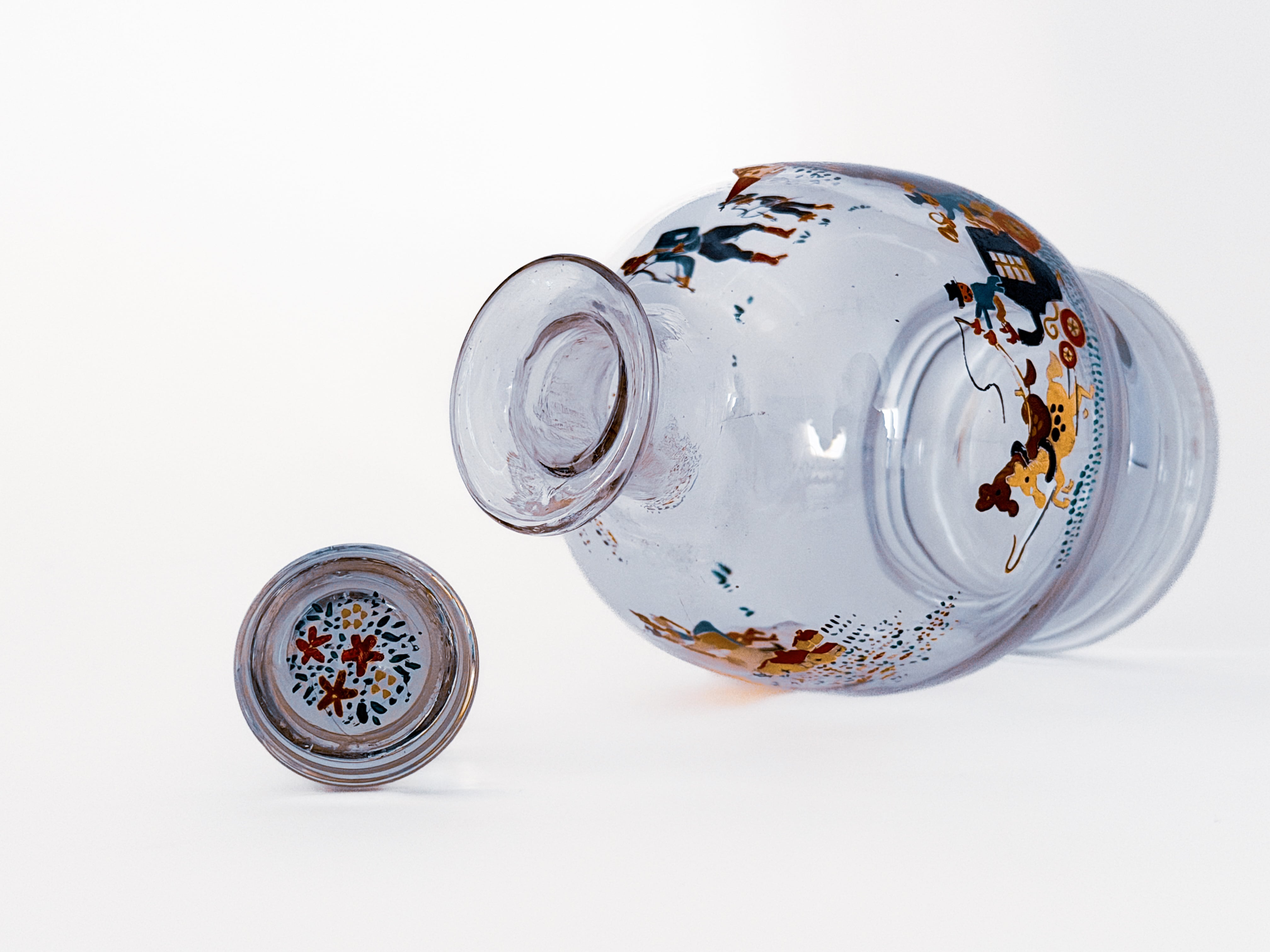 フランスで見つけた古いガラスのデキャンタ。エナメル彩で描かれた絵がとても可愛らしいです。踊る人、音楽隊、馬車、お花畑に赤い屋根の家々。フランスの小さな村でのお祭りが描かれています。ぐるりと一周描かれた絵は、どこから眺めても楽しく、飾ってあるだけでも幸せな気持ちになります。丸い栓の形も美しいです。食前酒やリキュールに用に、花瓶としても使えます。同じシリーズの小さなグラスもあり、並べるとひとつの世界が広がります。アンティークのガラスコレクションとしても、おすすめのお品です。