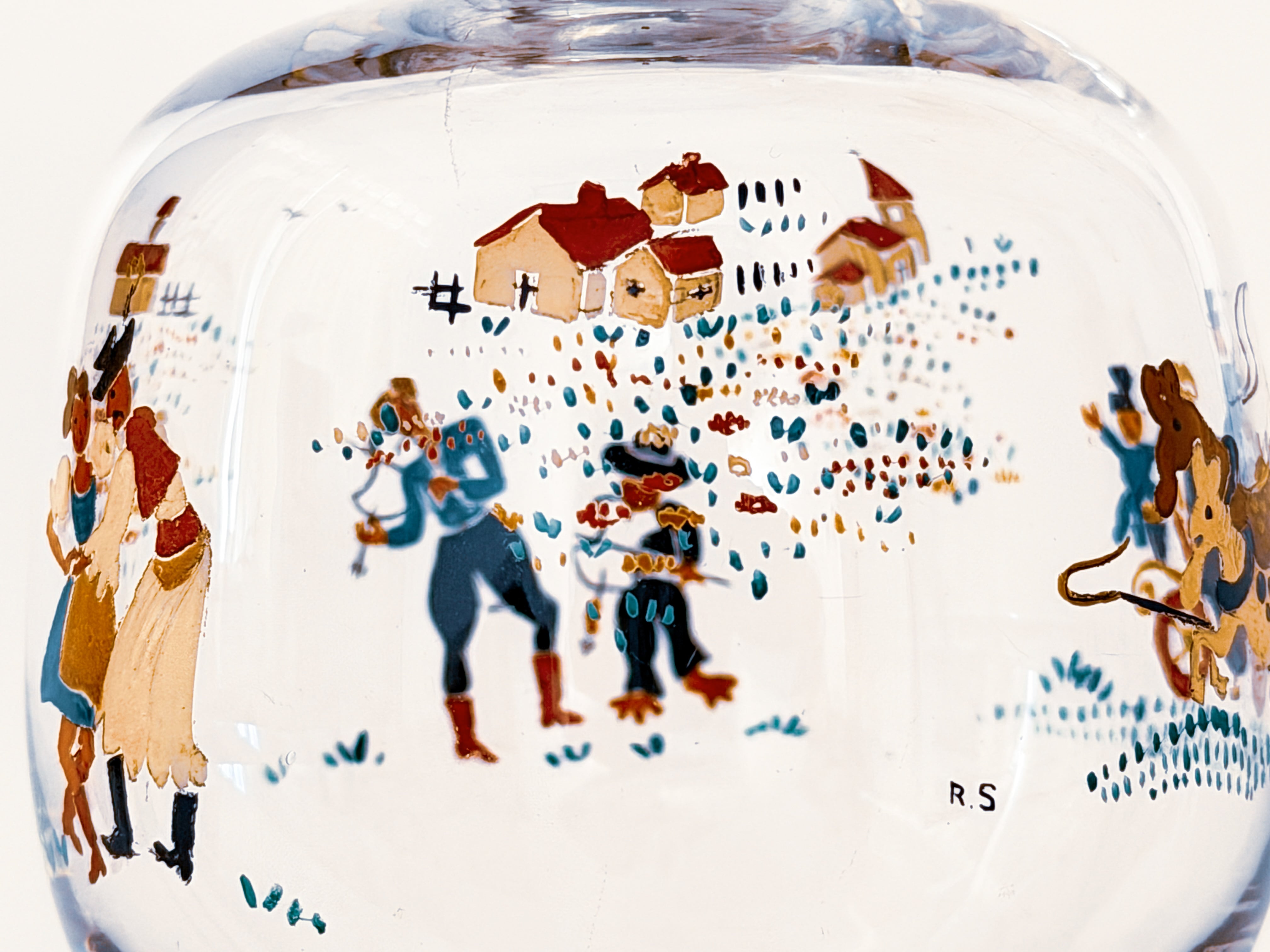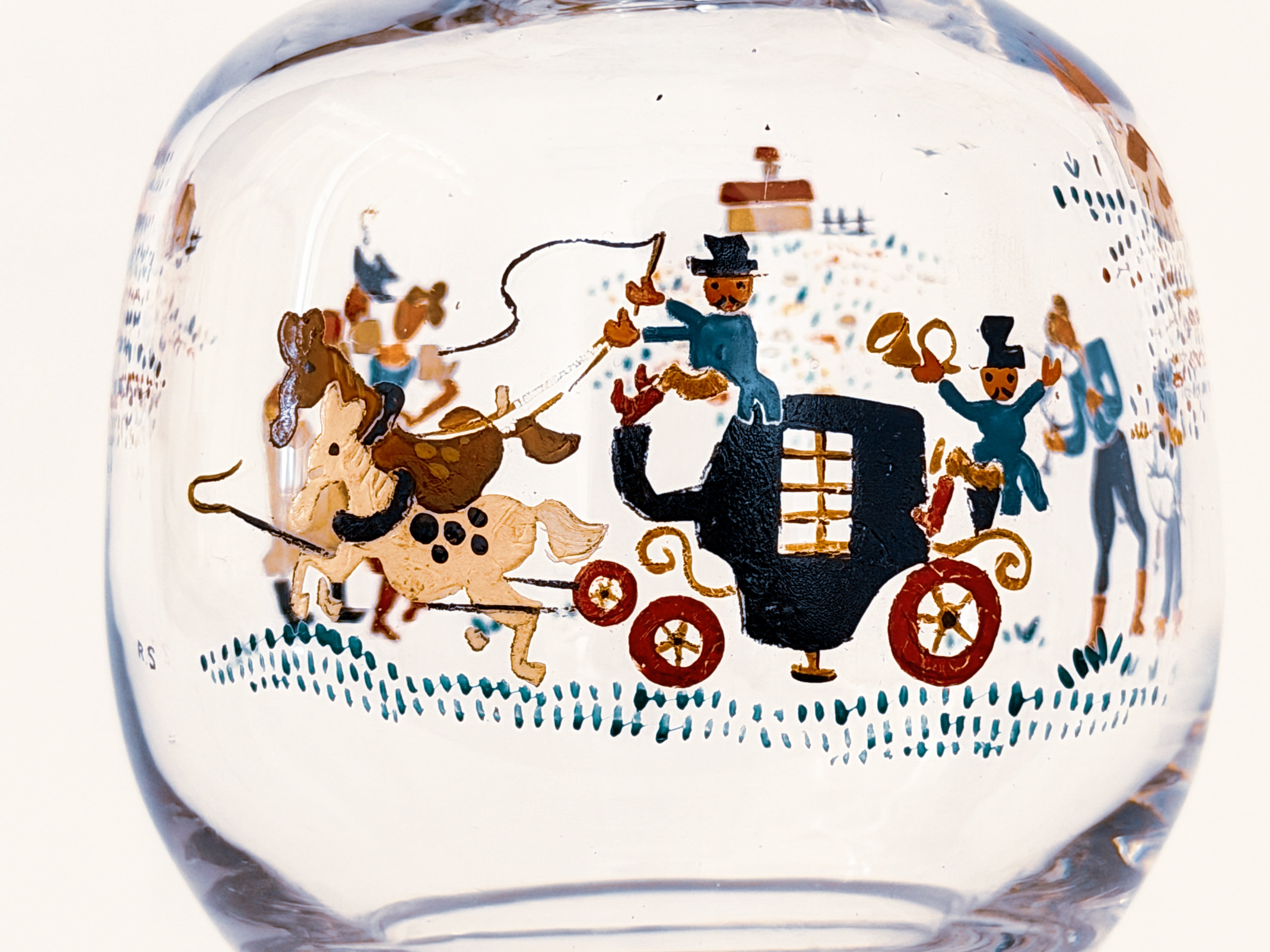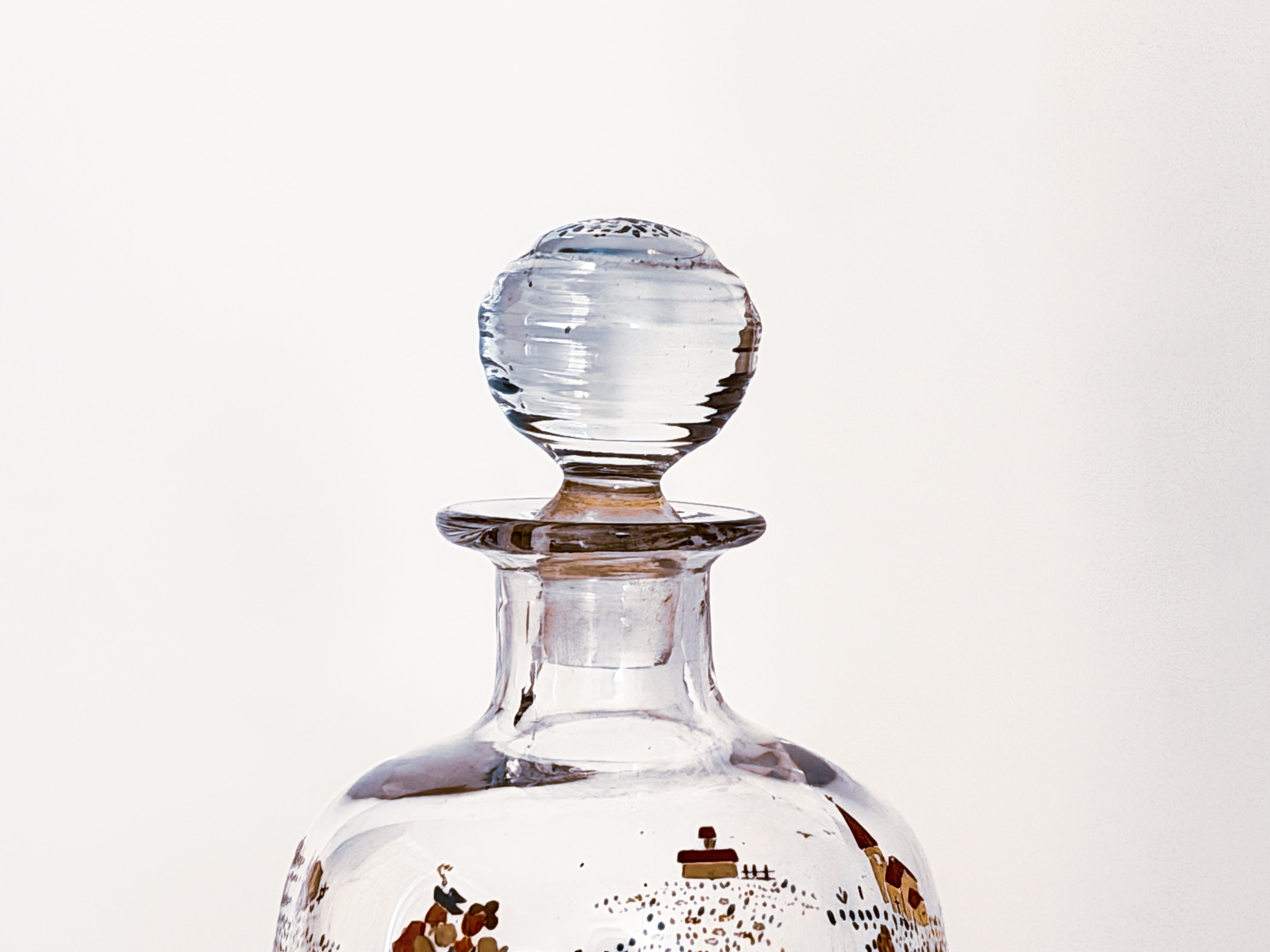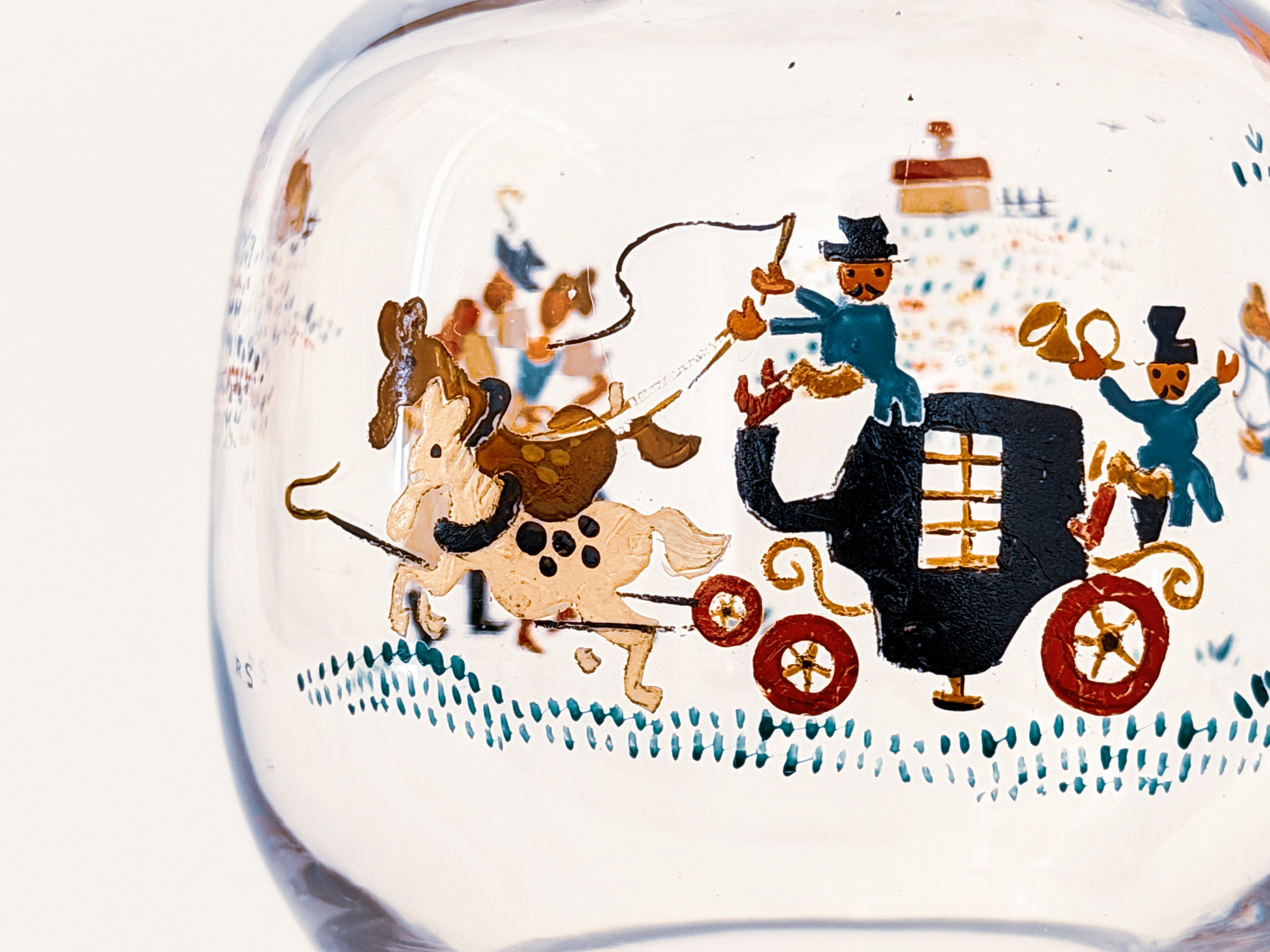 フランスで見つけた古いガラスのデキャンタ。エナメル彩で描かれた絵がとても可愛らしいです。踊る人、音楽隊、馬車、お花畑に赤い屋根の家々。フランスの小さな村でのお祭りが描かれています。ぐるりと一周描かれた絵は、どこから眺めても楽しく、飾ってあるだけでも幸せな気持ちになります。丸い栓の形も美しいです。食前酒やリキュールに用に、花瓶としても使えます。同じシリーズの小さなグラスもあり、並べるとひとつの世界が広がります。アンティークのガラスコレクションとしても、おすすめのお品です。