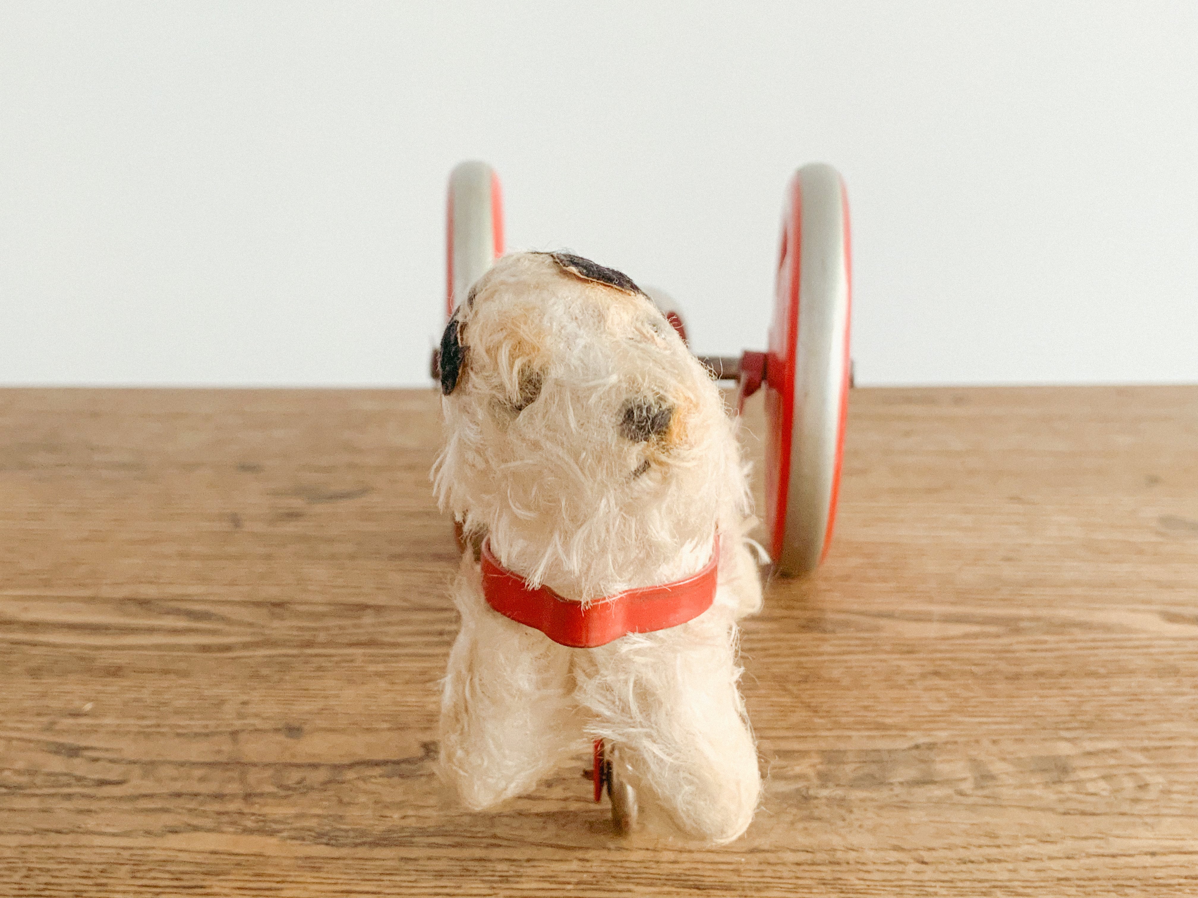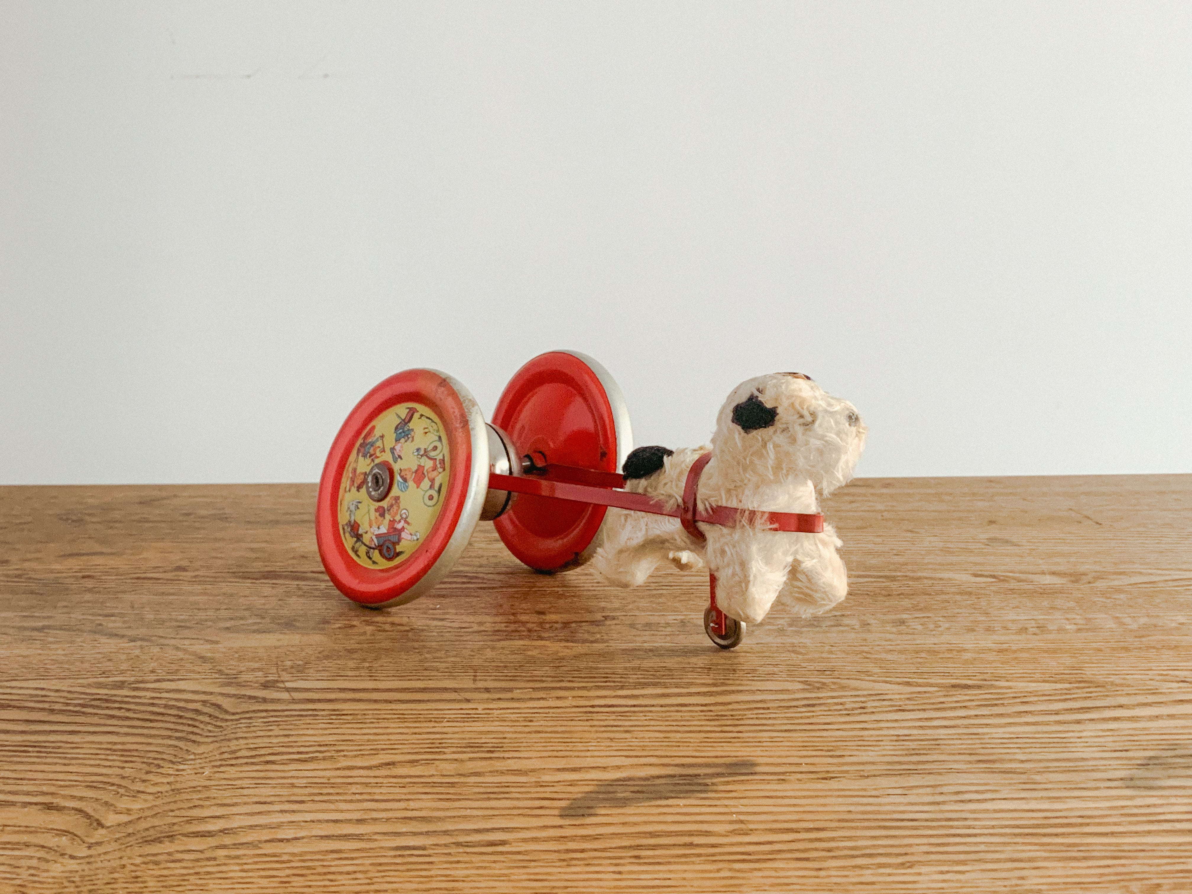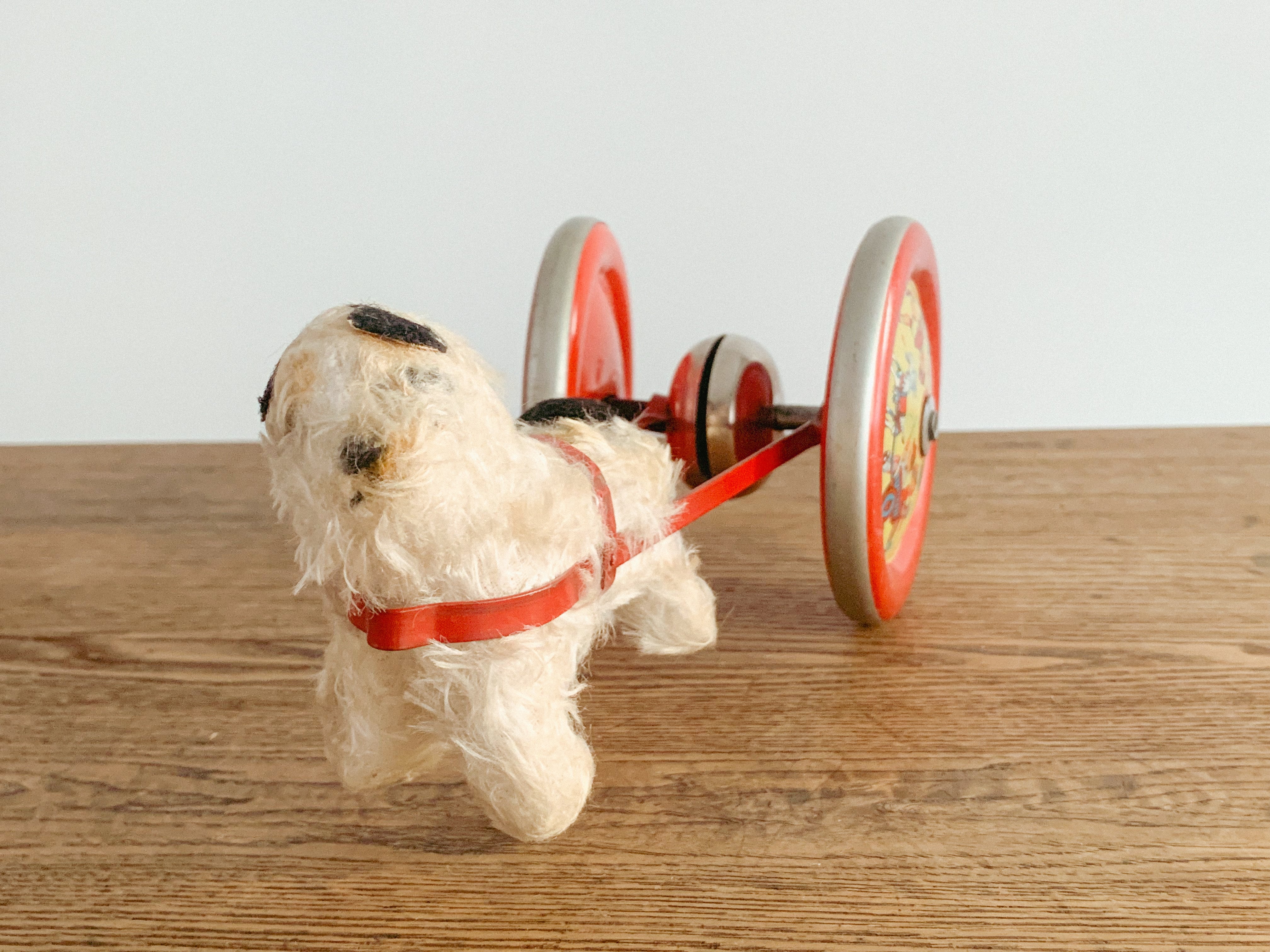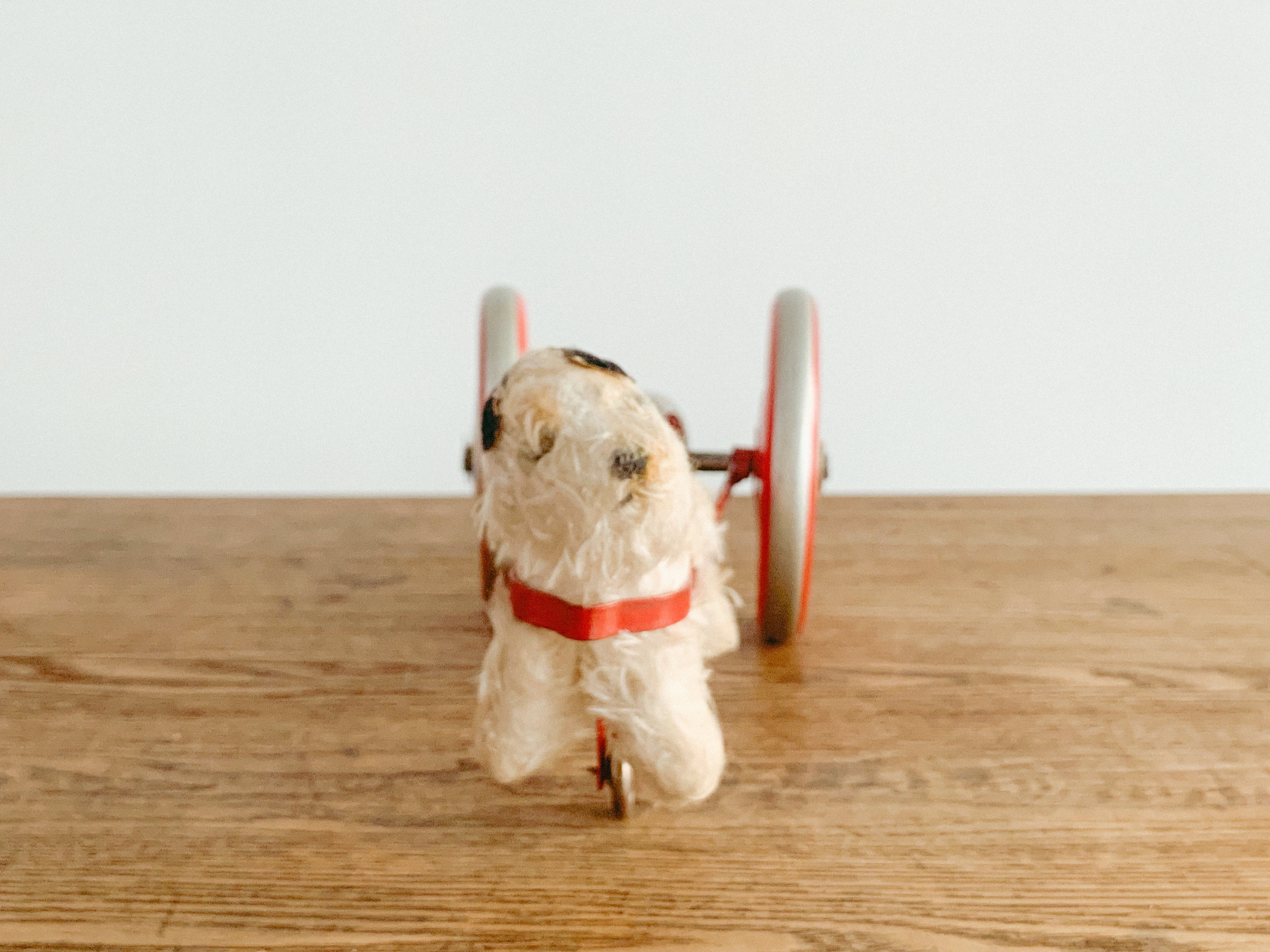 リンリンリンリン。小さなワンコが走ると、軽やかな鈴の音が響きます。自分の体よりも大きなタイヤを、楽しそうに一生懸命引いている姿がたまりません。前に進もうとすると体が少し浮いてしまう感じも愛おしいです。ブリキのタイヤの絵柄や色合いも可愛いですね。古いおもちゃならではの風合いが感じられます。動かすと鈴が鳴る仕組みになっています。飾っても、時々動かしても楽しいおもちゃです。