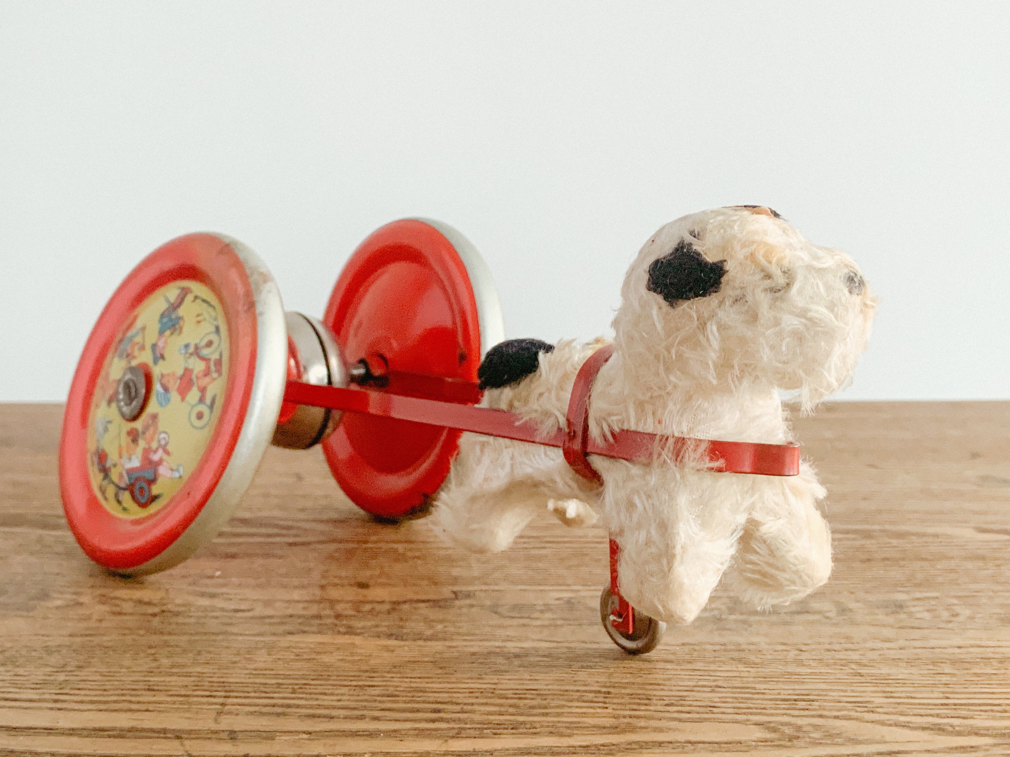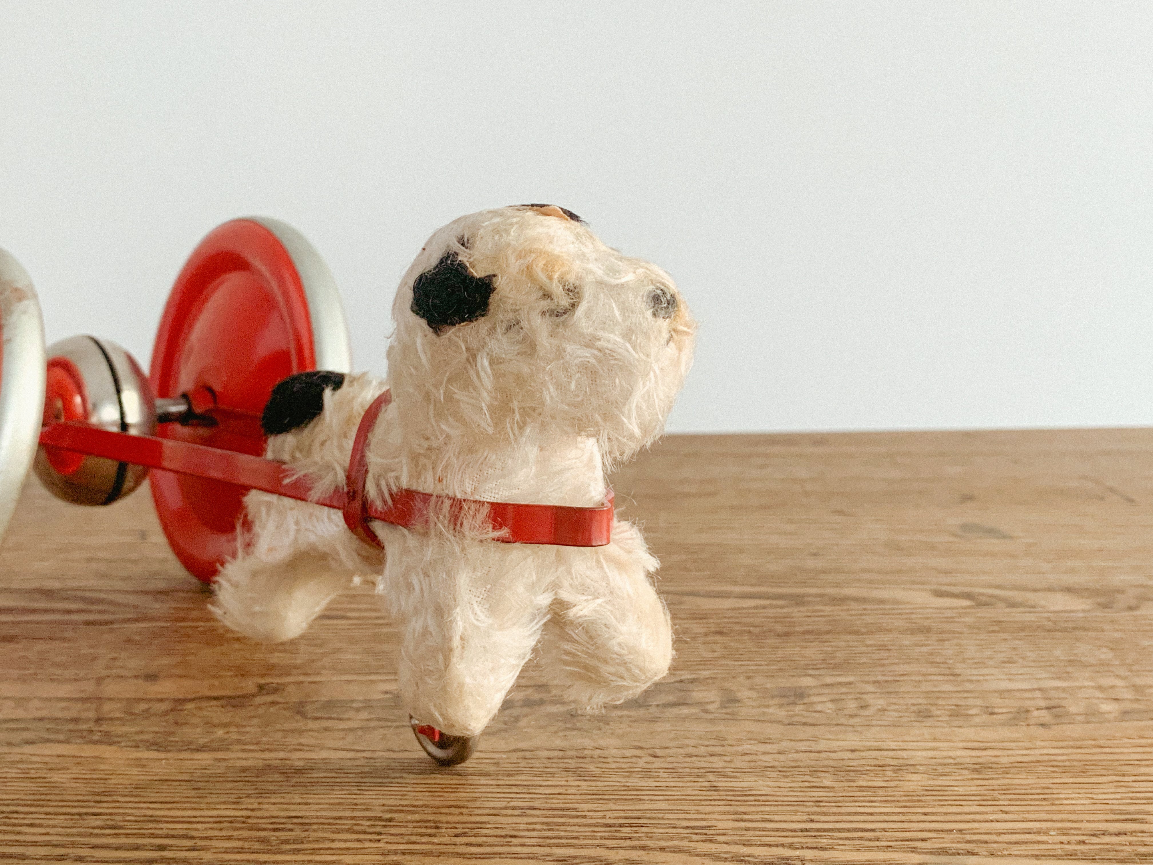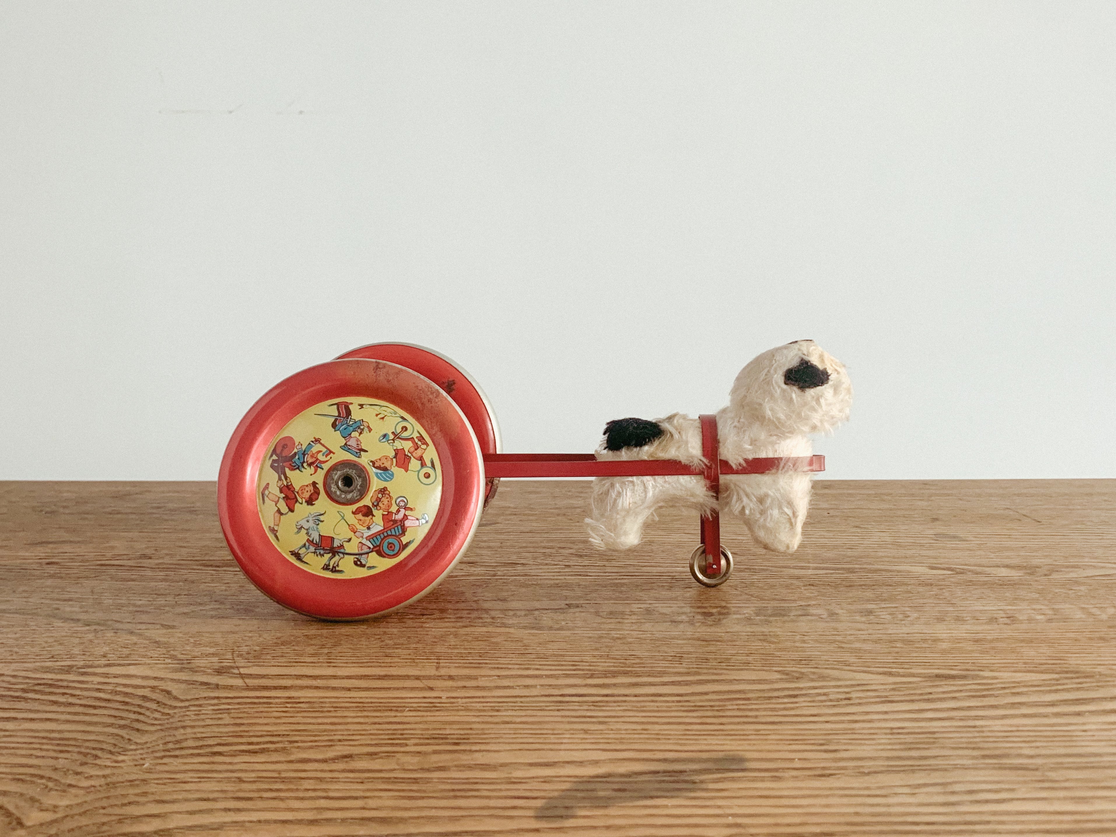 リンリンリンリン。小さなワンコが走ると、軽やかな鈴の音が響きます。自分の体よりも大きなタイヤを、楽しそうに一生懸命引いている姿がたまりません。前に進もうとすると体が少し浮いてしまう感じも愛おしいです。ブリキのタイヤの絵柄や色合いも可愛いですね。古いおもちゃならではの風合いが感じられます。動かすと鈴が鳴る仕組みになっています。飾っても、時々動かしても楽しいおもちゃです。