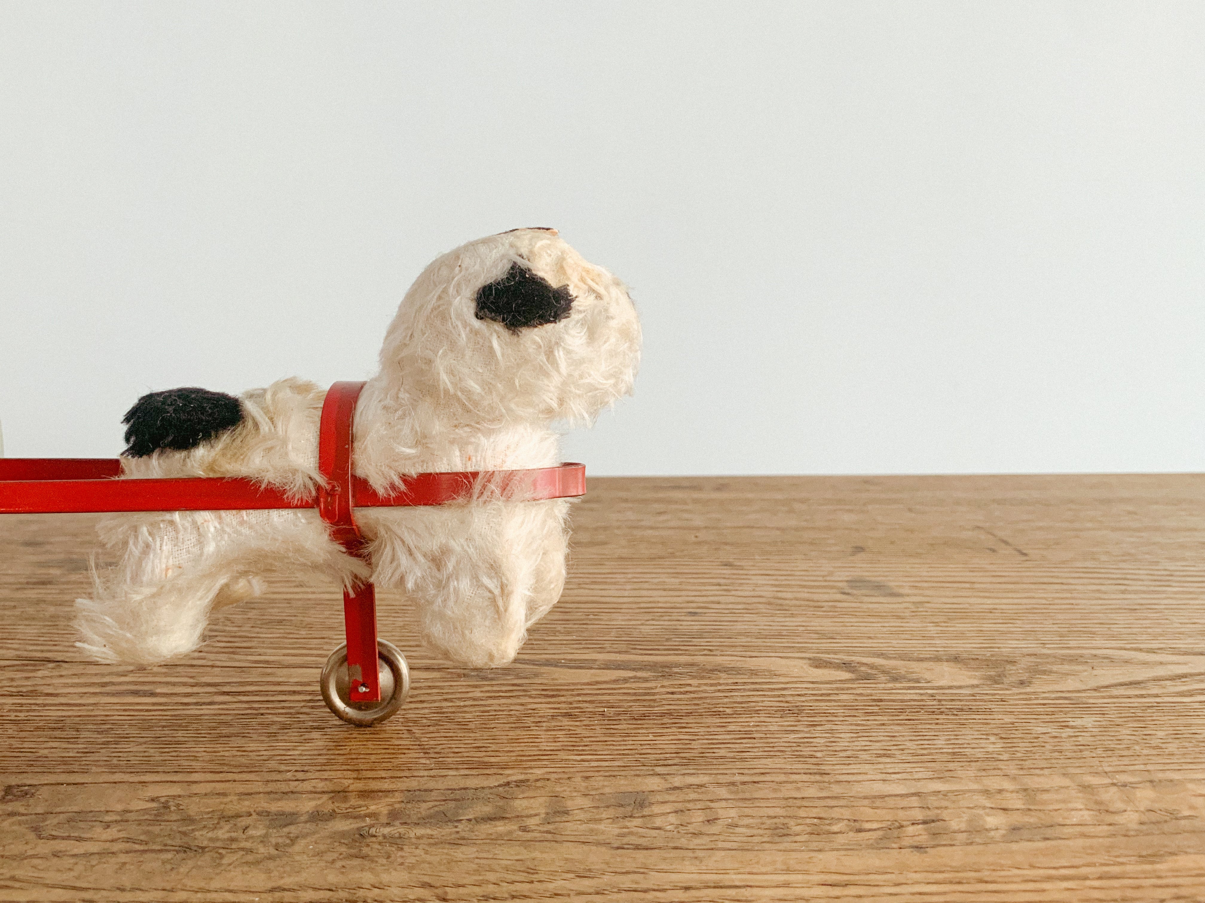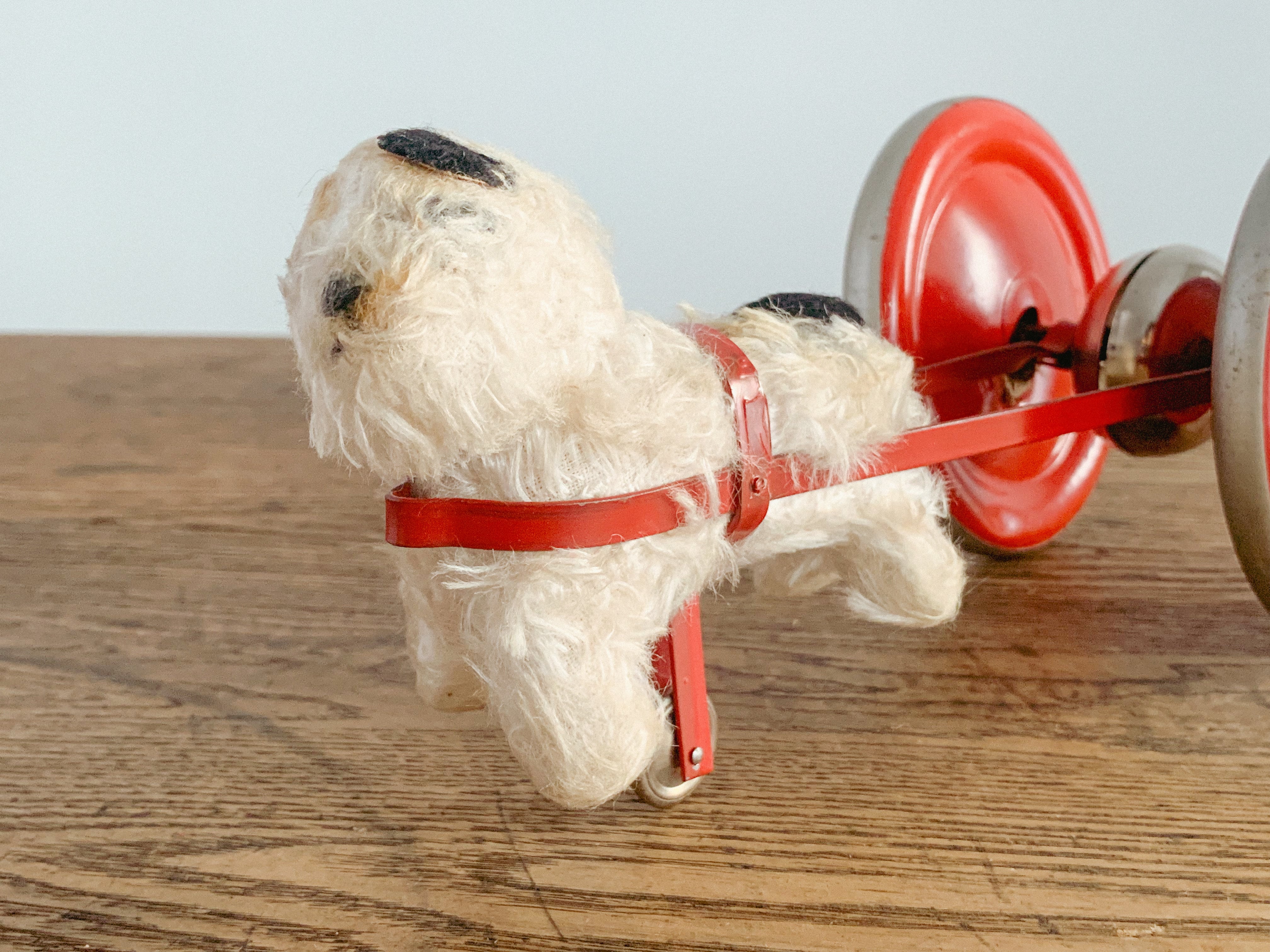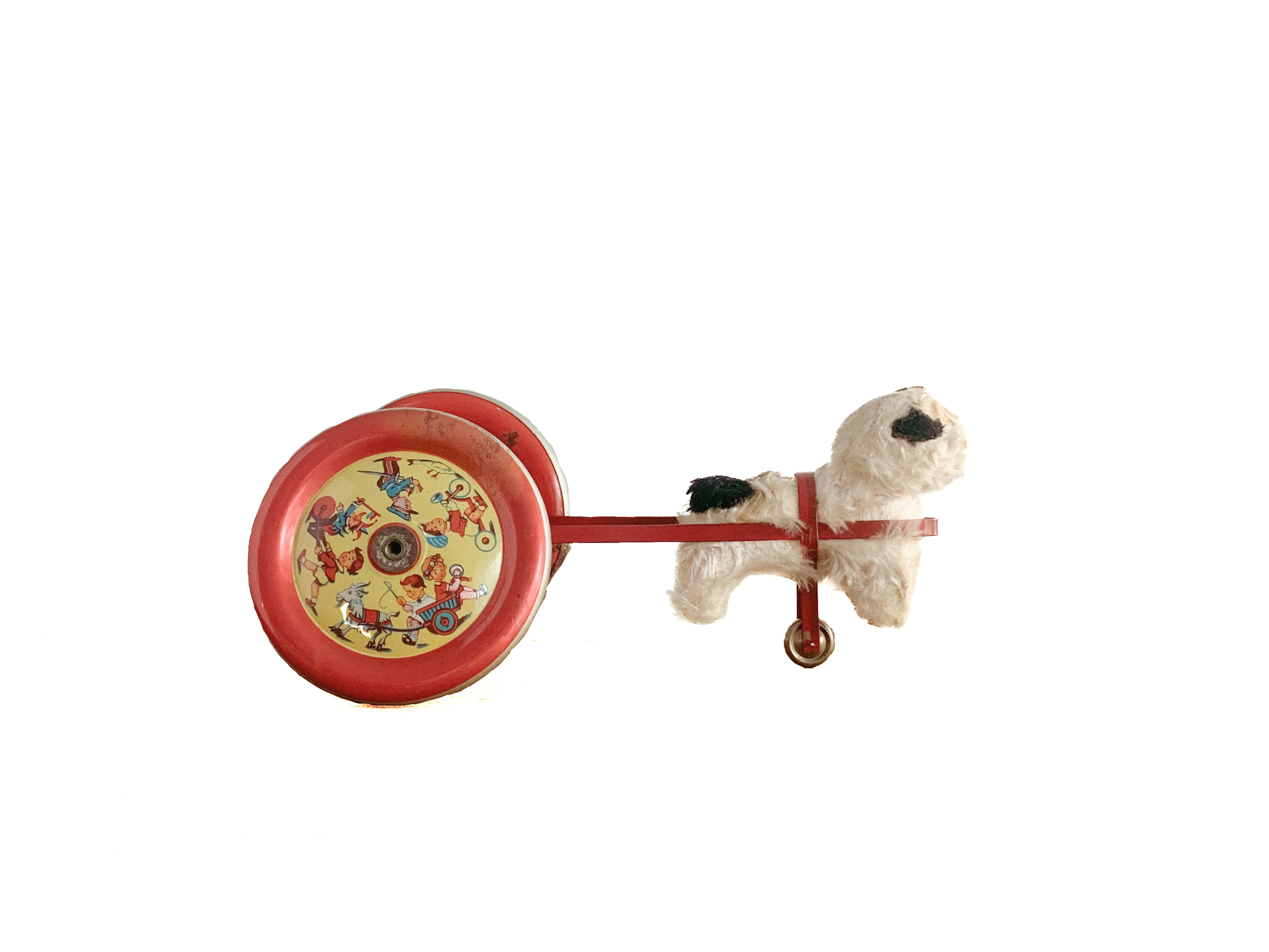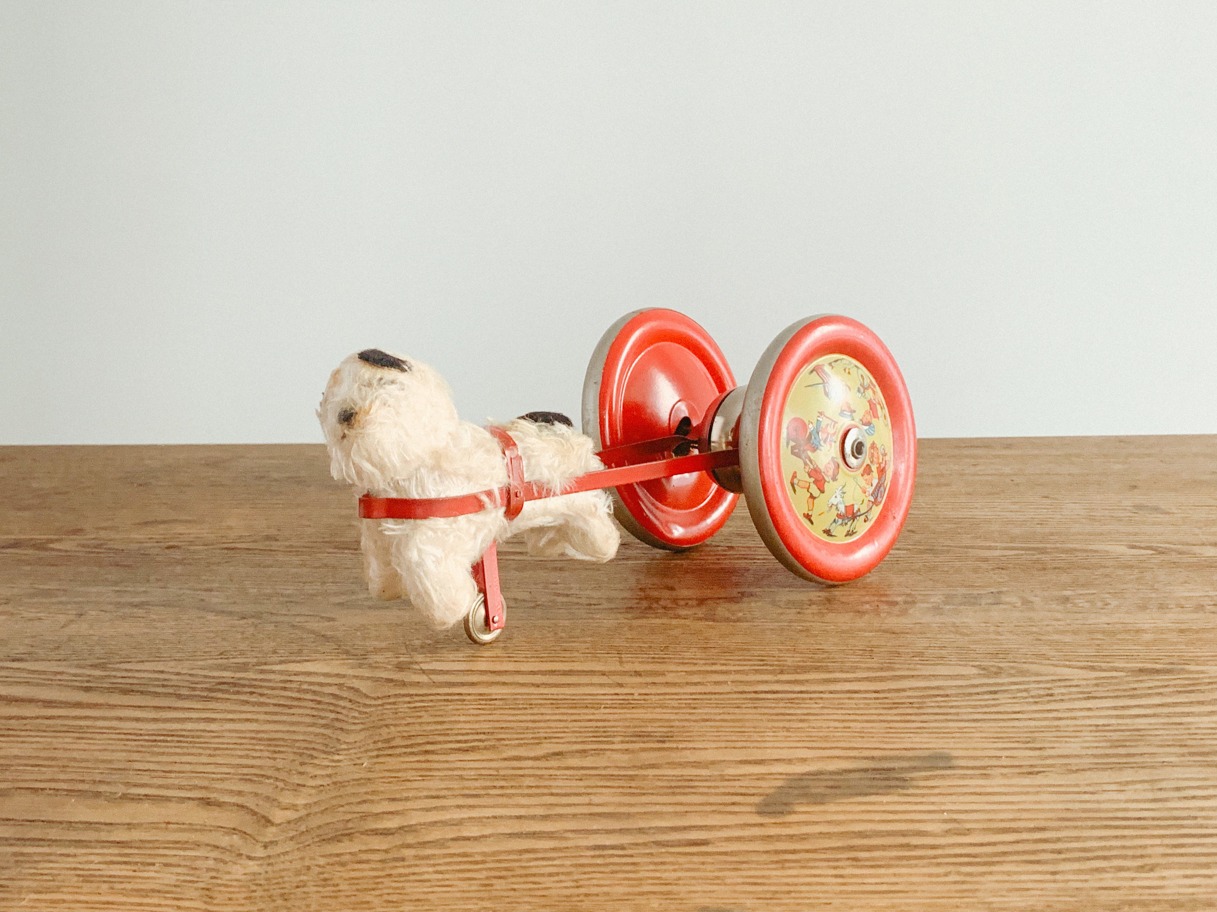リンリンリンリン。小さなワンコが走ると、軽やかな鈴の音が響きます。自分の体よりも大きなタイヤを、楽しそうに一生懸命引いている姿がたまりません。前に進もうとすると体が少し浮いてしまう感じも愛おしいです。ブリキのタイヤの絵柄や色合いも可愛いですね。古いおもちゃならではの風合いが感じられます。動かすと鈴が鳴る仕組みになっています。飾っても、時々動かしても楽しいおもちゃです。