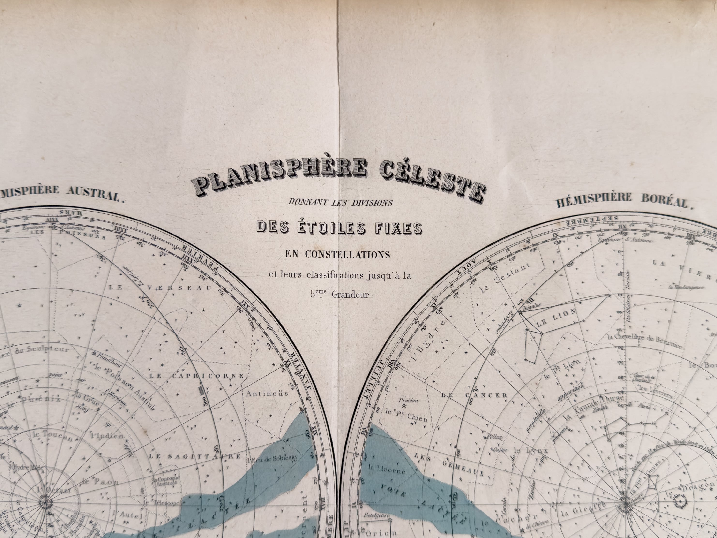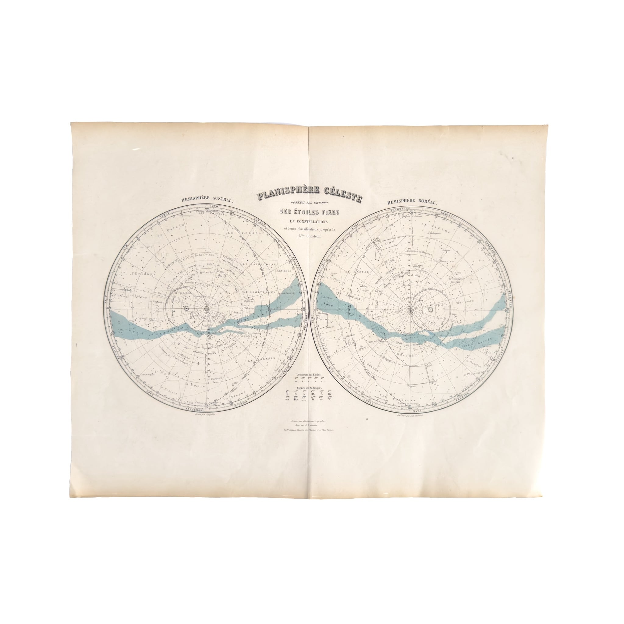 フランス語表記の天体図(星図)「PLANISPHÈRE CÉLESTE」。1800年頃のものになります。南半球と北半球、それぞれの星座配置が緻密な線描で正確に記された、当時の天文学資料です。星の等級や名称まで丁寧に描かれ、整然とした構成には学術資料ならではの端正な美しさがあります。淡く引かれたブルーの色彩は静かな宇宙の流れを思わせます。遠い夜空の気配を宿す一枚です。