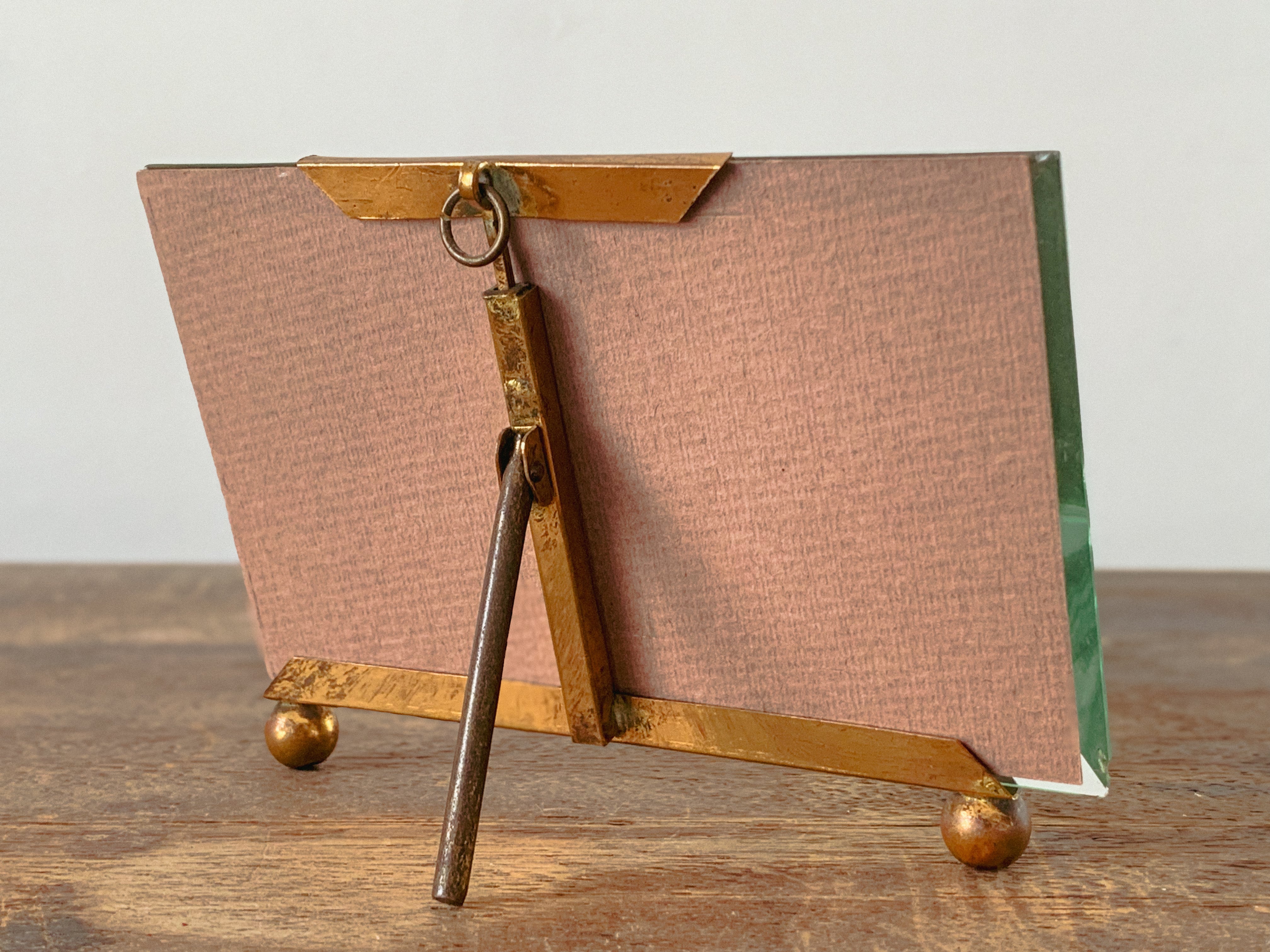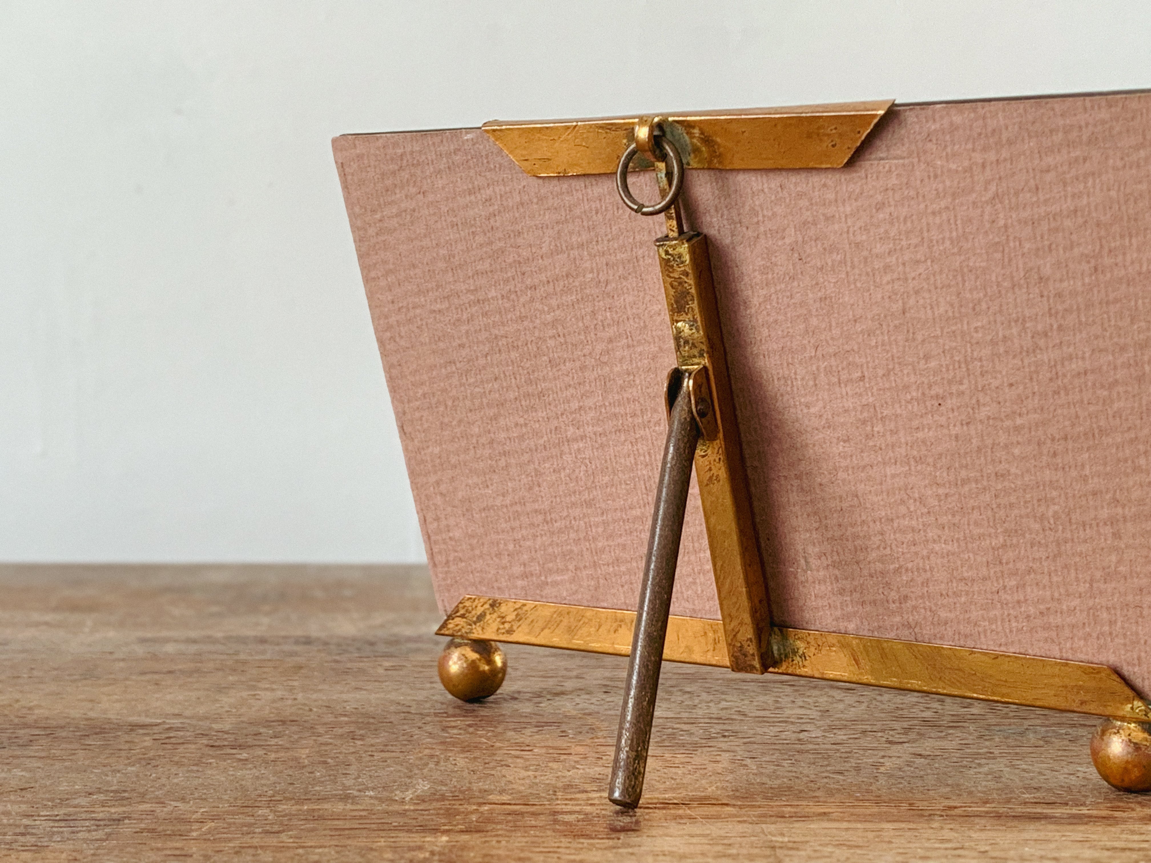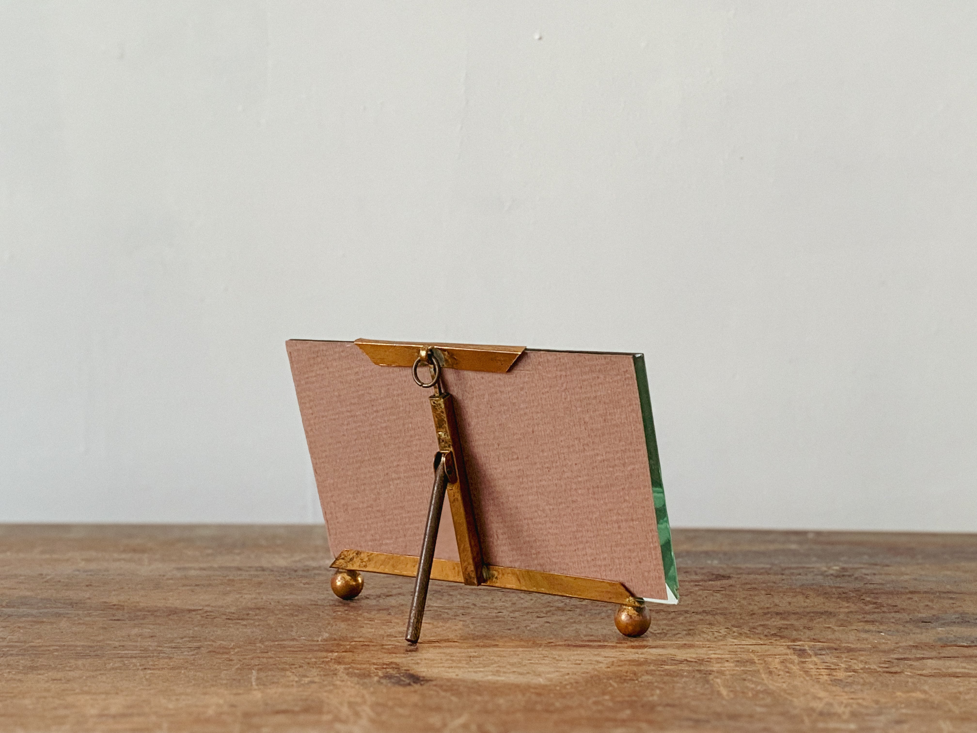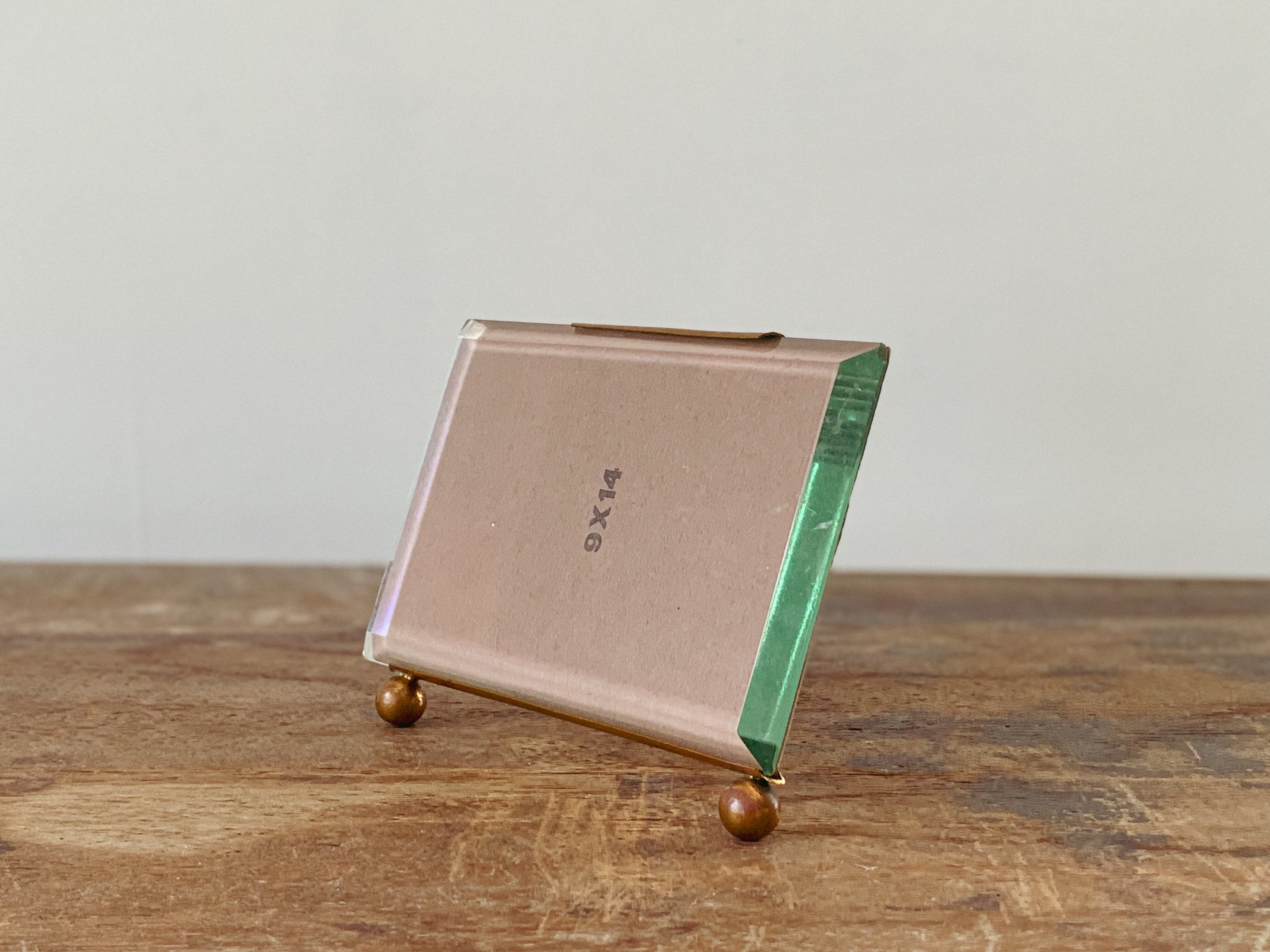 フランスの古い真鍮とガラスのフォトフレームになります。1900年代初期のものと思われます。横長タイプののフレームは意外と数が少なく、なかなか出会えません。真鍮の落ち着いた色味と、厚みのあるガラスが美しく、丸い脚の部分も可愛いです。シンプルながらも存在感があります。スタンドとしても壁掛けとしても使えます。写真やポストカード、古い紙物などを入れてお楽しみ頂けますし、あえて何も入れず、フレームそのものをオブジェとして飾って頂くのもおすすめです。