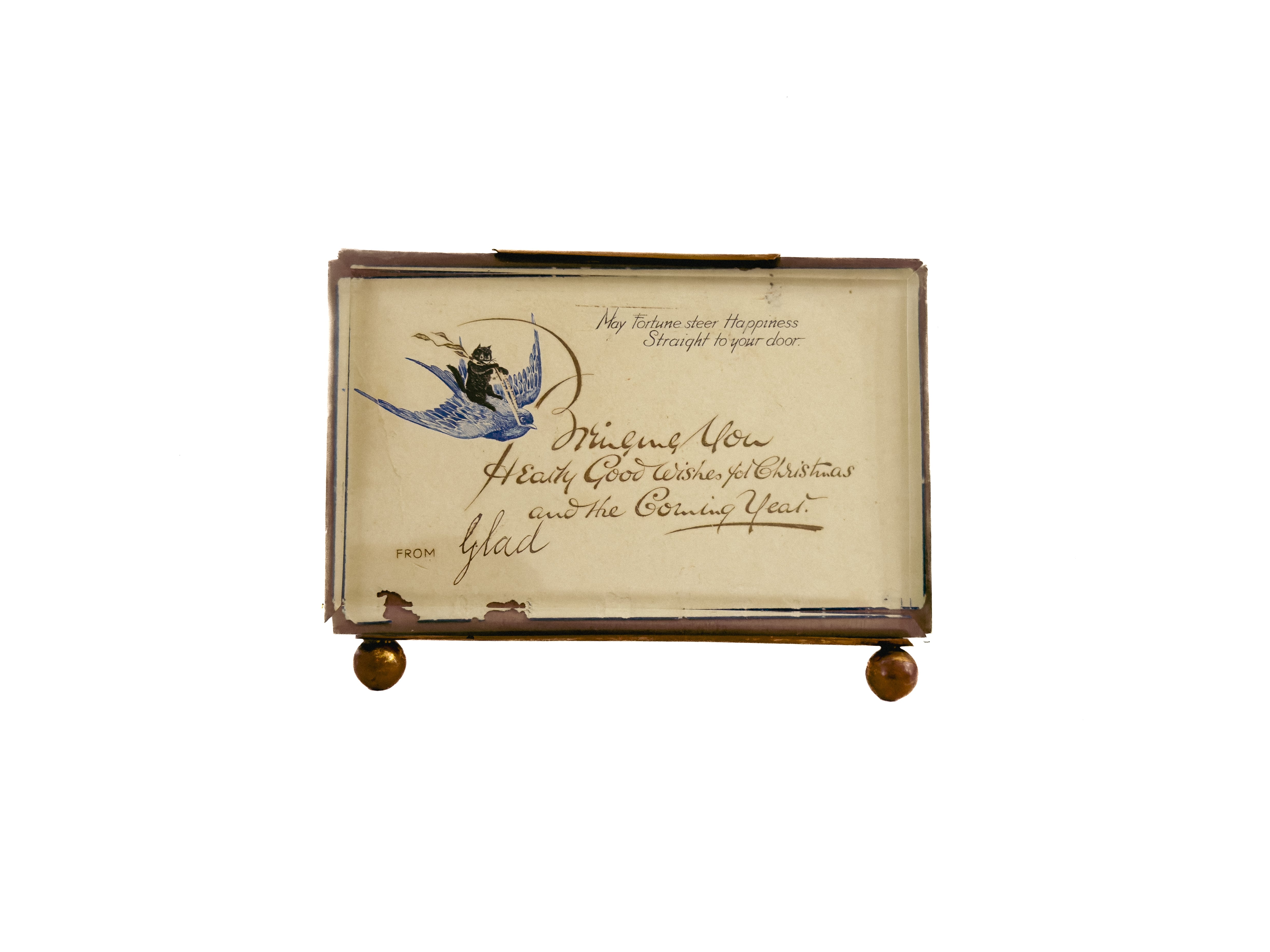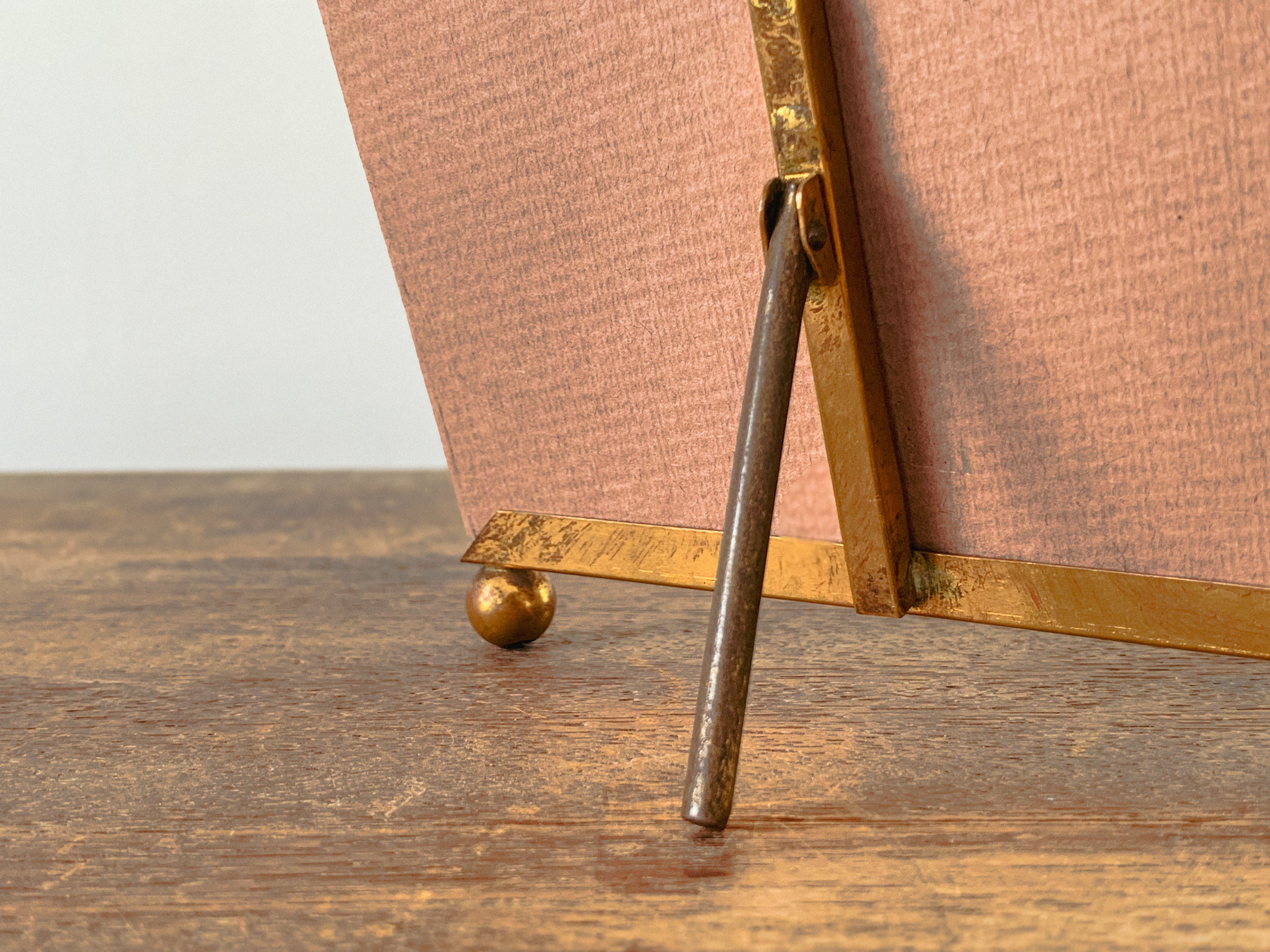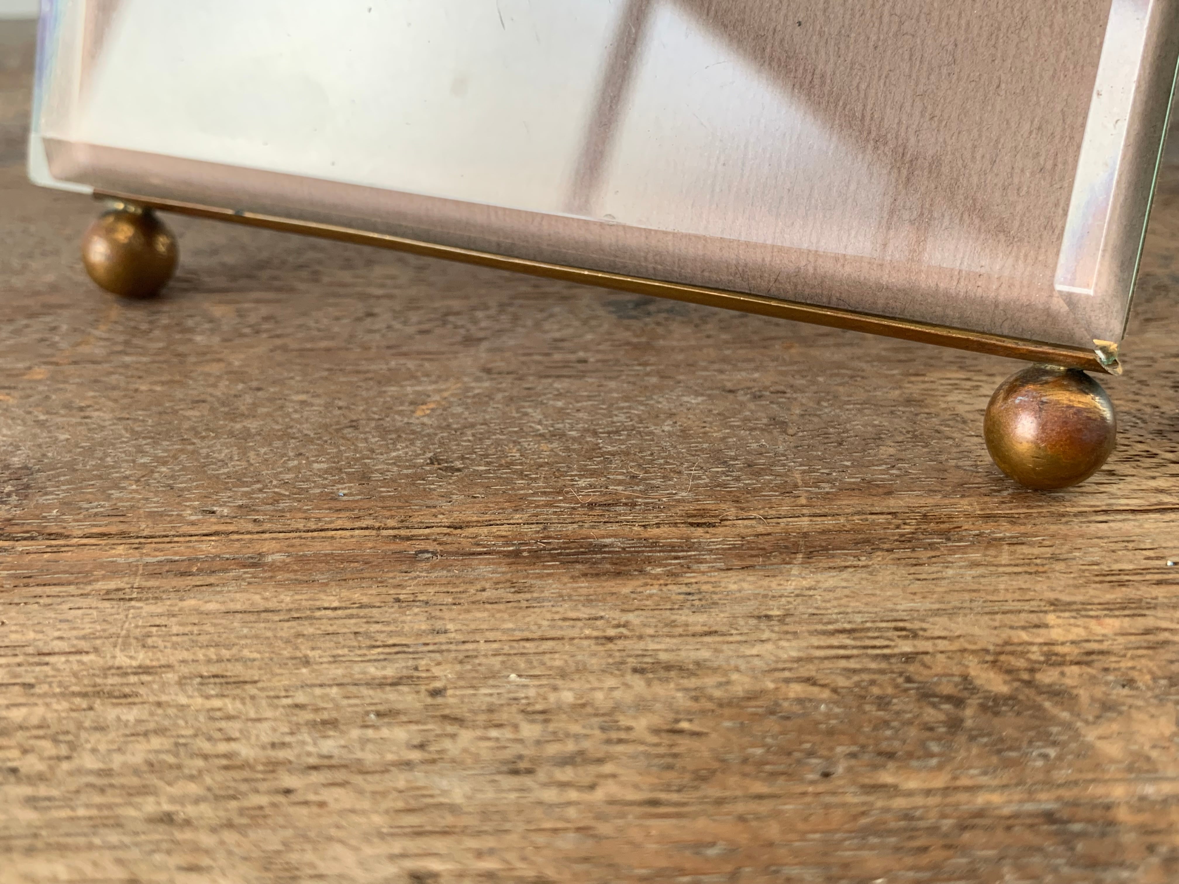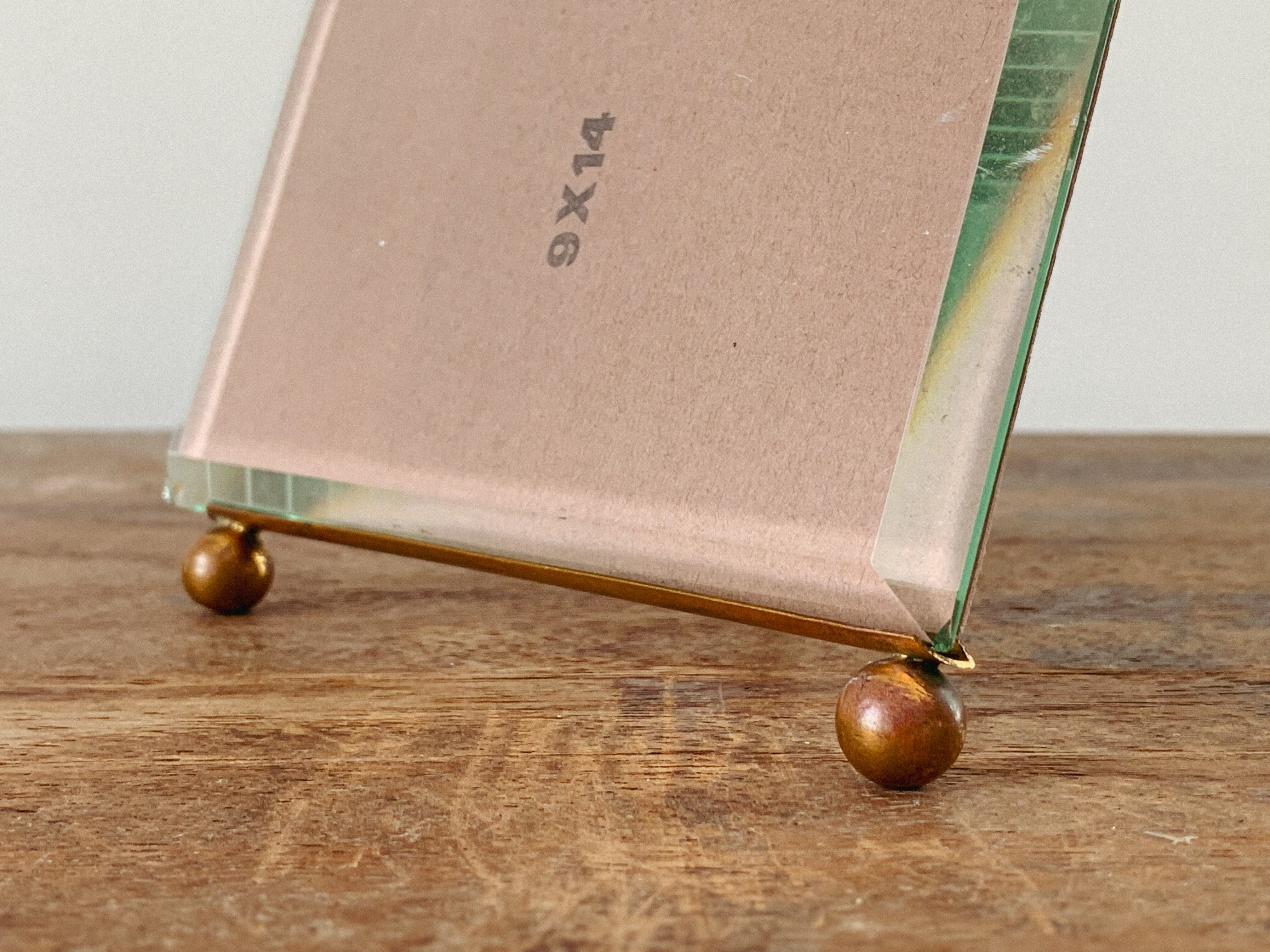フランスの古い真鍮とガラスのフォトフレームになります。1900年代初期のものと思われます。横長タイプののフレームは意外と数が少なく、なかなか出会えません。真鍮の落ち着いた色味と、厚みのあるガラスが美しく、丸い脚の部分も可愛いです。シンプルながらも存在感があります。スタンドとしても壁掛けとしても使えます。写真やポストカード、古い紙物などを入れてお楽しみ頂けますし、あえて何も入れず、フレームそのものをオブジェとして飾って頂くのもおすすめです。