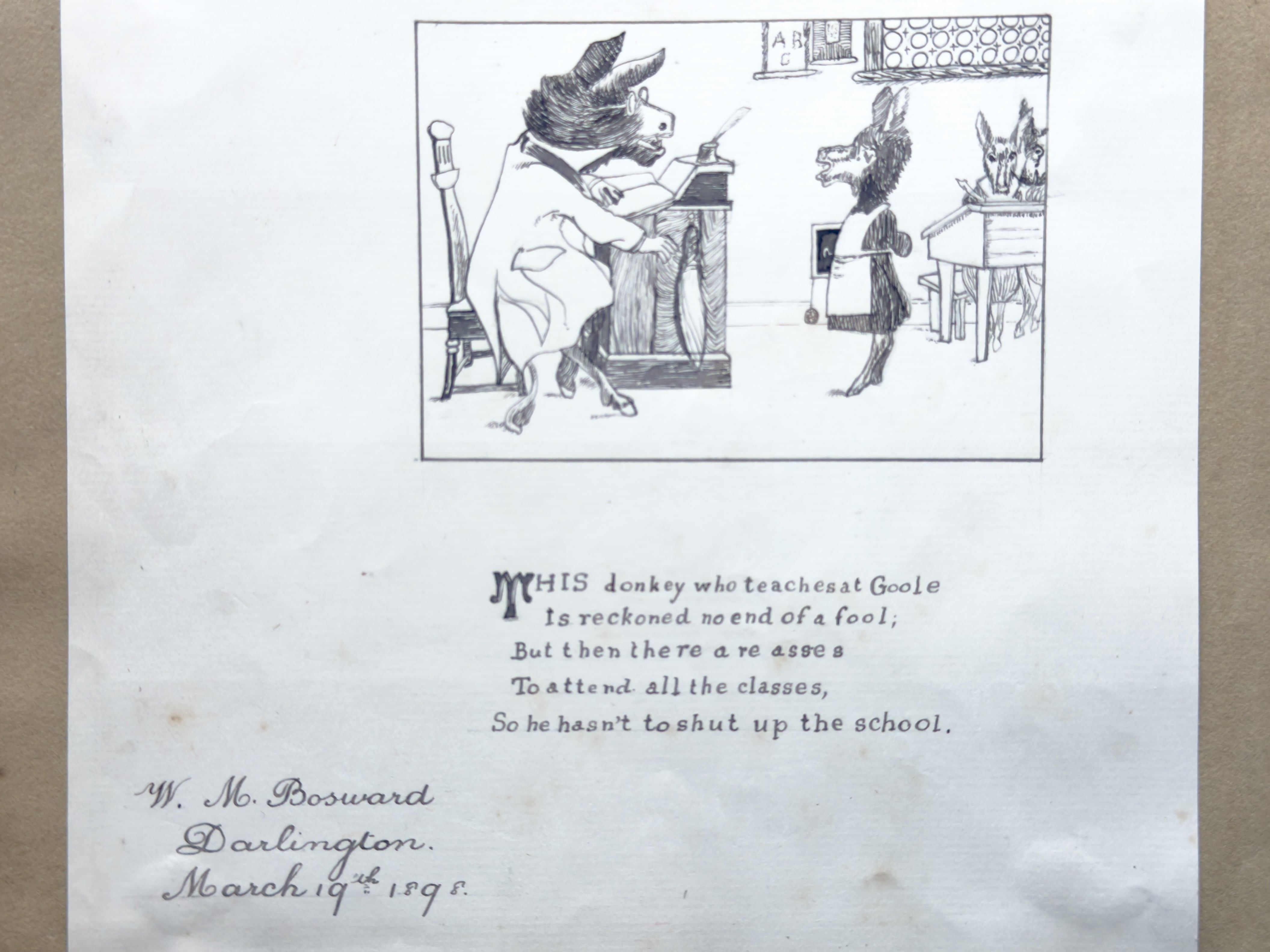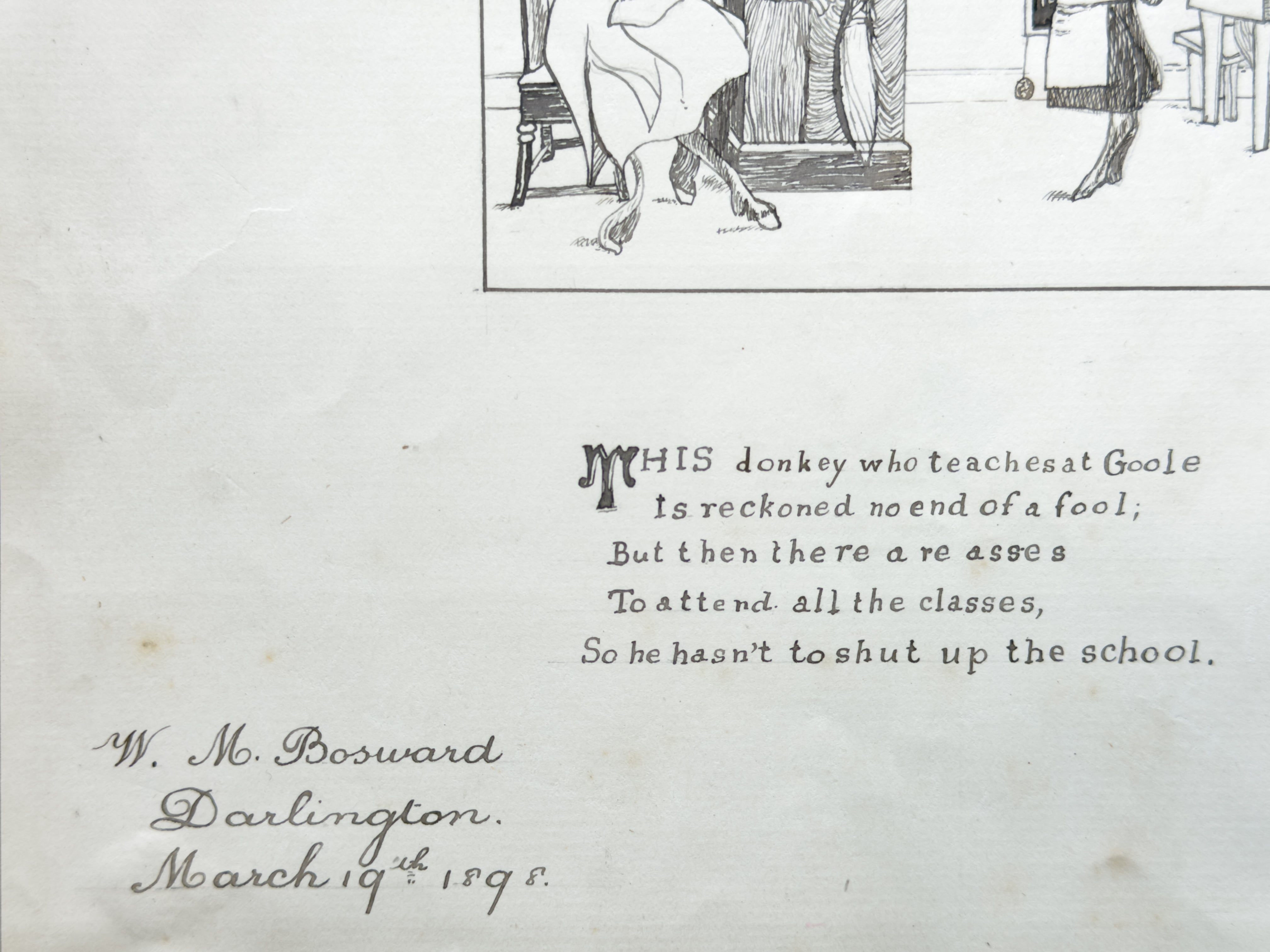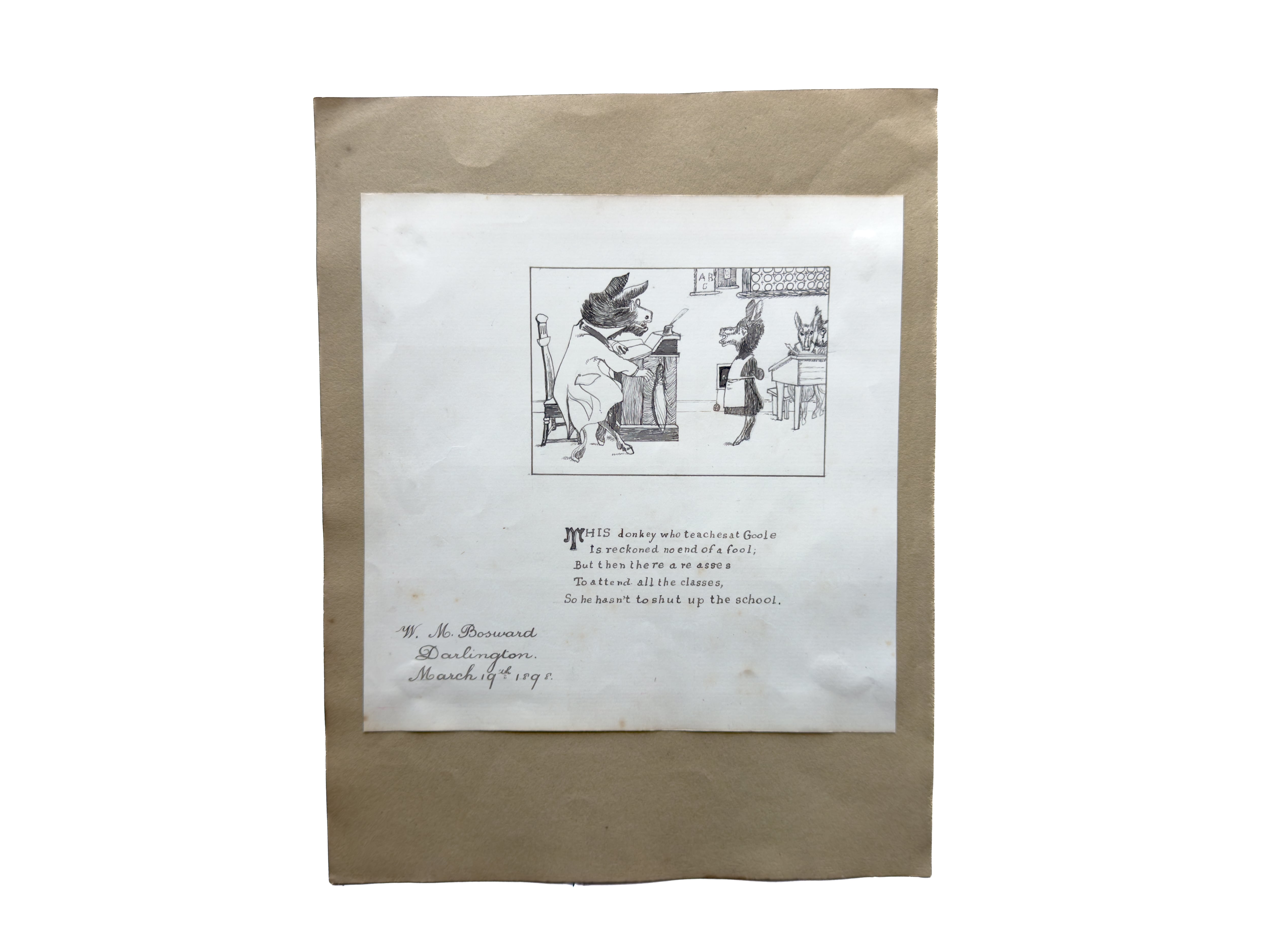W.M.Bosward 1898年とサインがあります。教壇に立つロバの先生と、生徒として並ぶロバの子供の姿が繊細な線描きで描かれた、ユーモア溢れる風刺画です。風刺的な詩が添えられており、当時の社会や教育への皮肉と遊び心が感じられます。可愛らしさの中にある、ちょっとした毒が堪りません。額装して飾って頂きたいお品です。