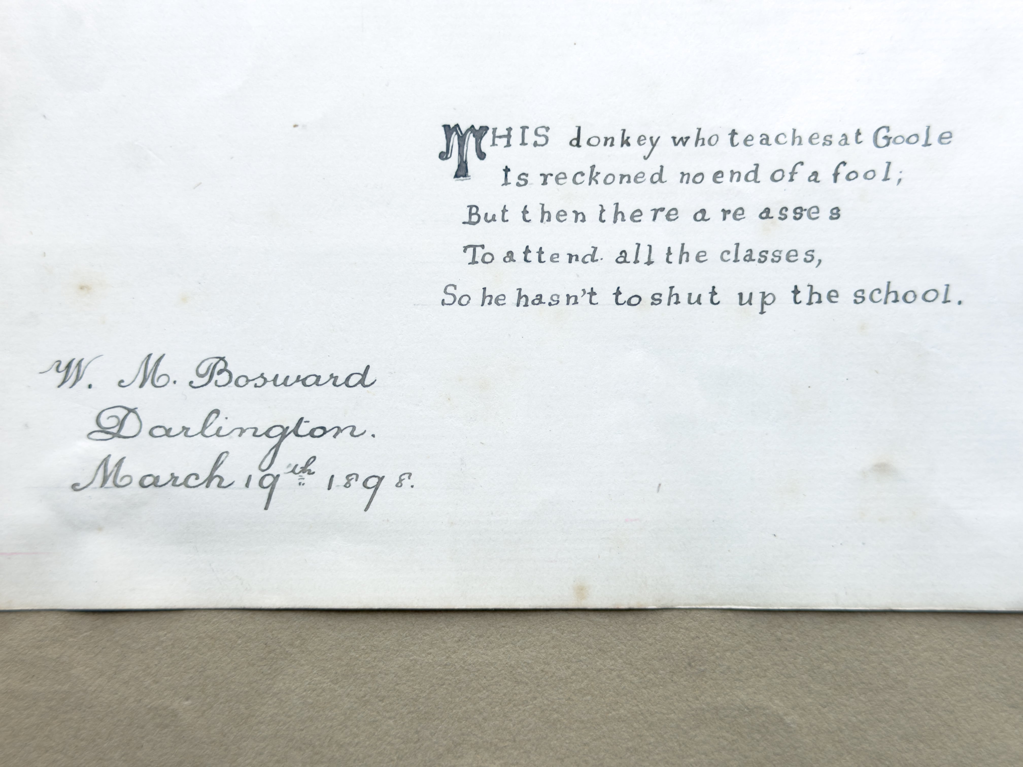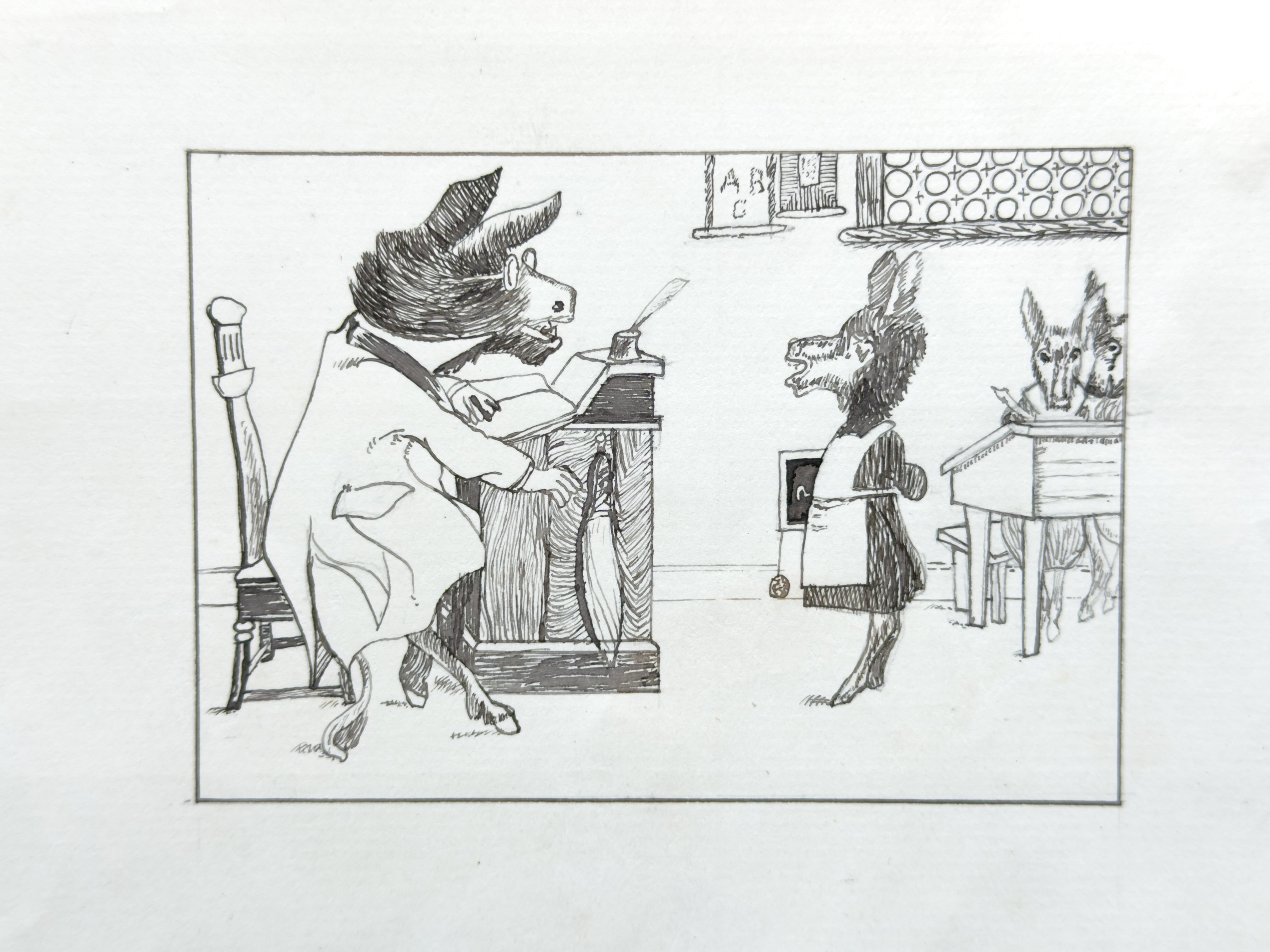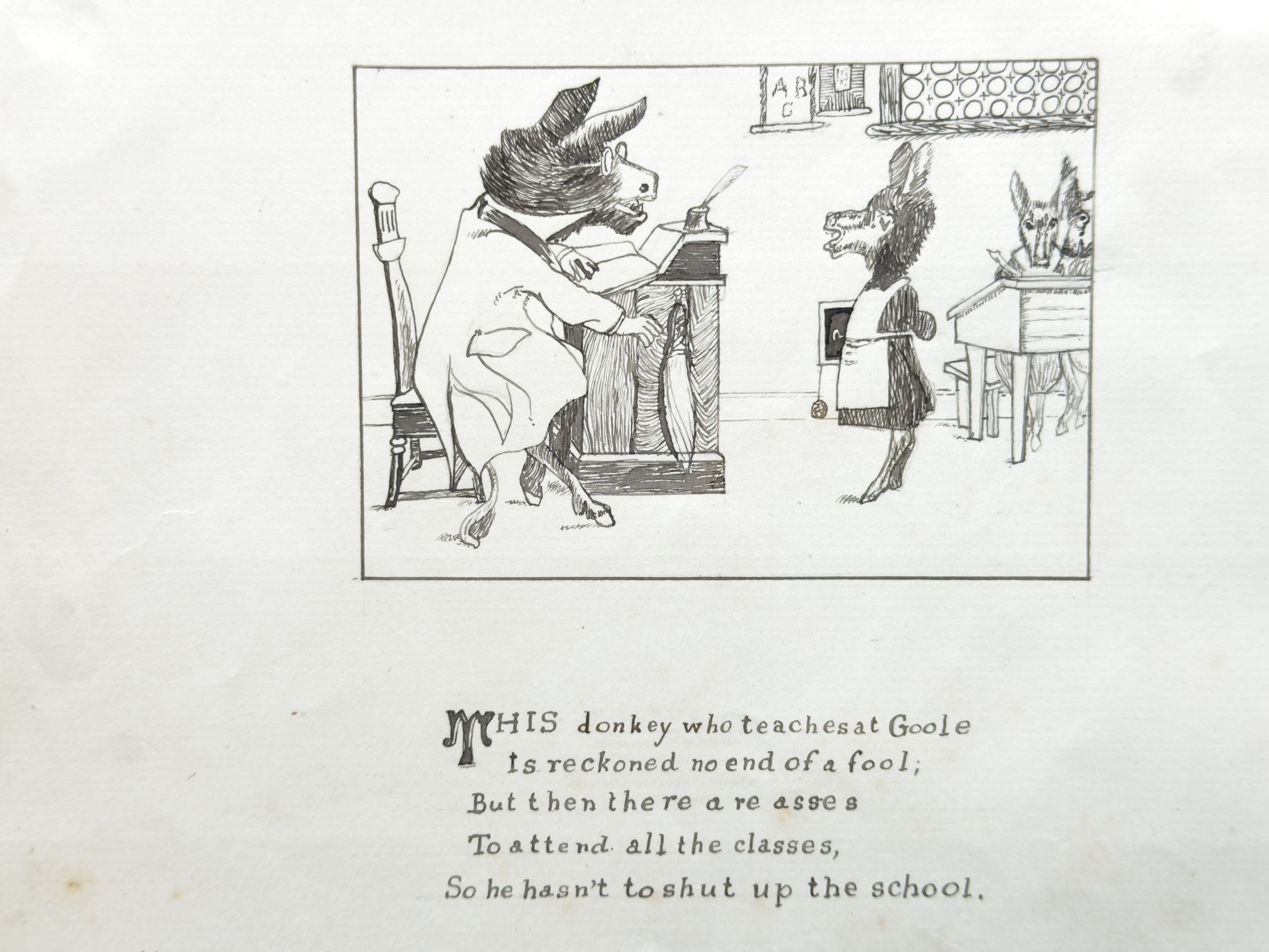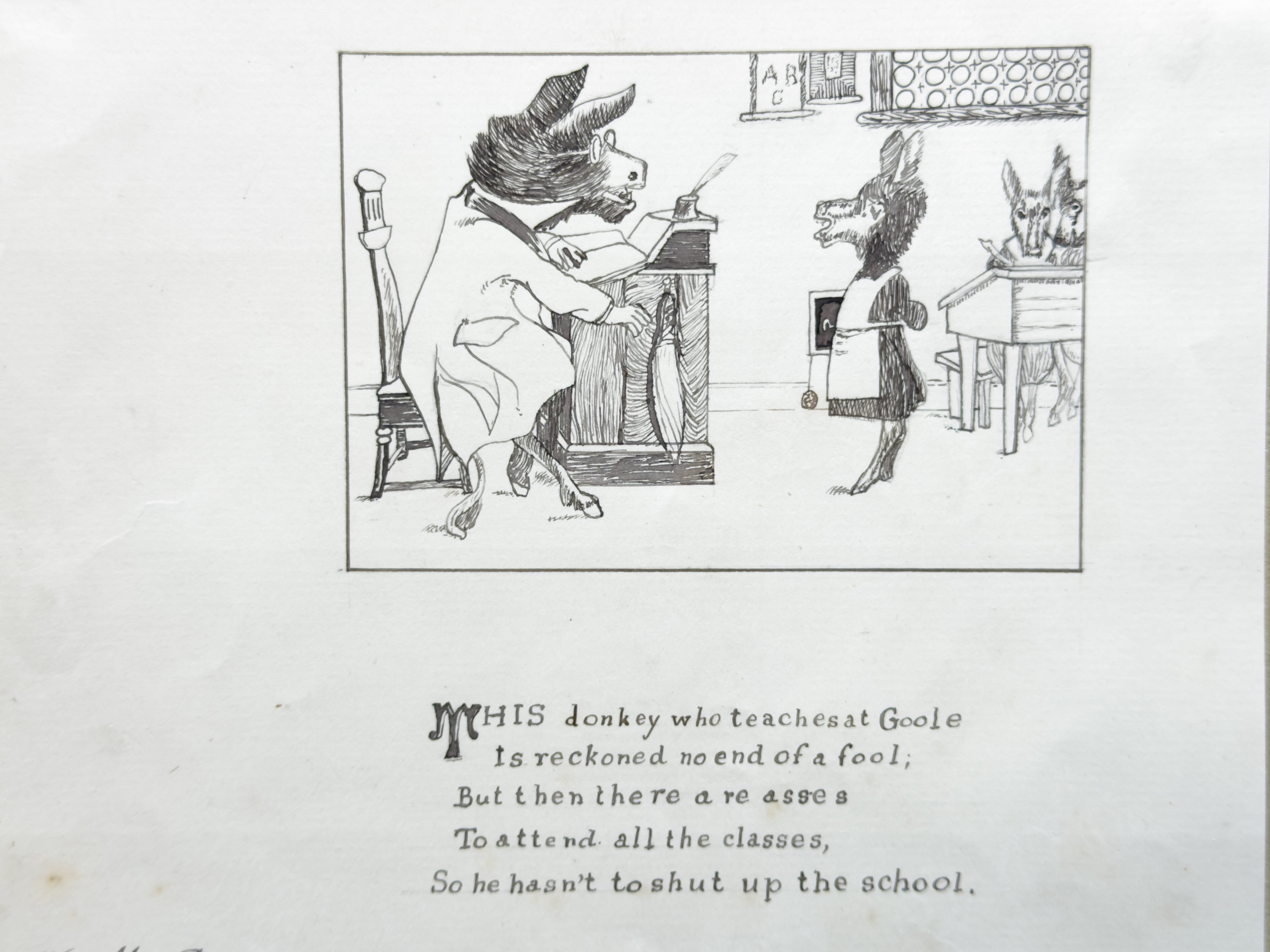 W.M.Bosward 1898年とサインがあります。教壇に立つロバの先生と、生徒として並ぶロバの子供の姿が繊細な線描きで描かれた、ユーモア溢れる風刺画です。風刺的な詩が添えられており、当時の社会や教育への皮肉と遊び心が感じられます。可愛らしさの中にある、ちょっとした毒が堪りません。額装して飾って頂きたいお品です。