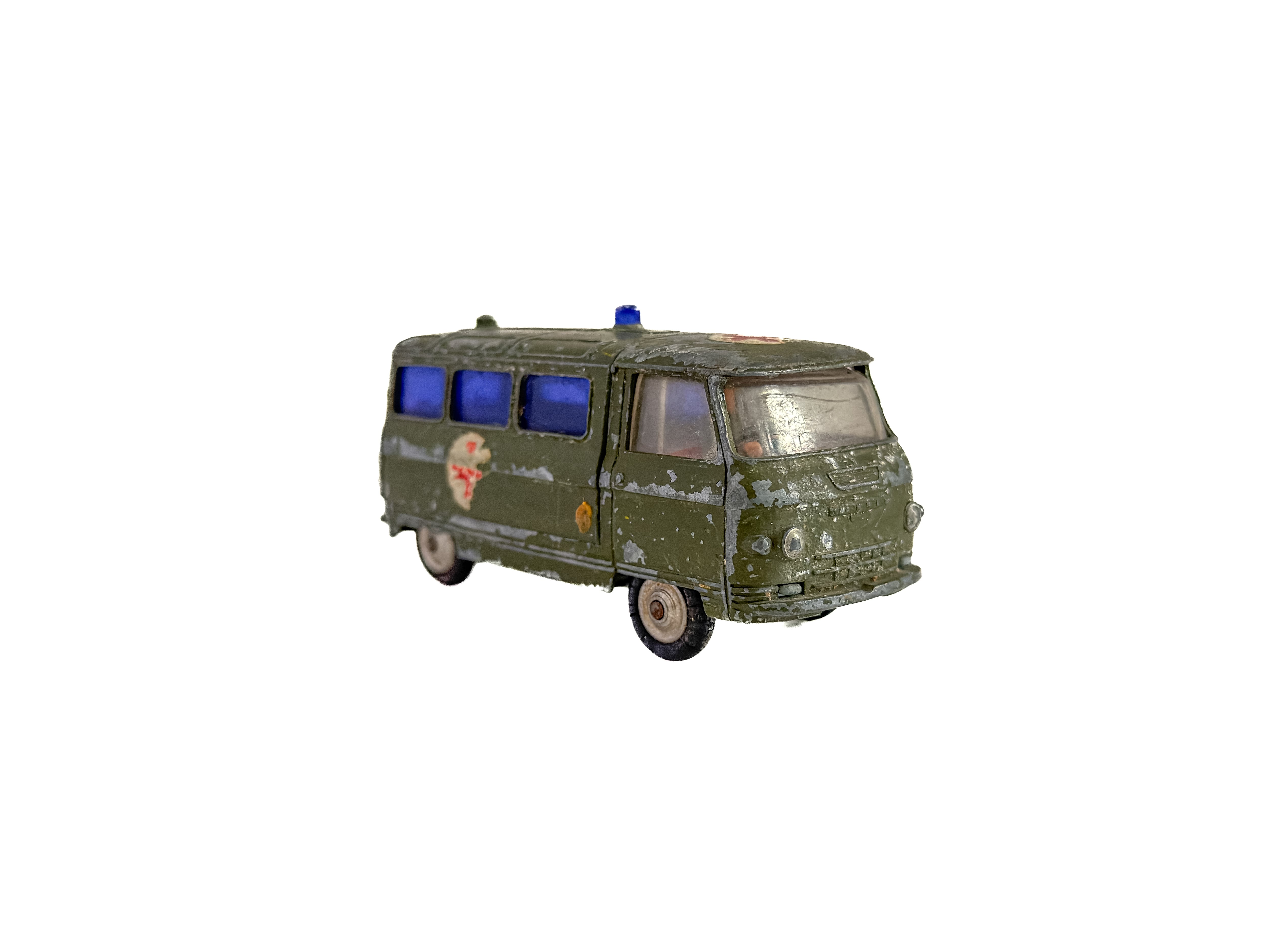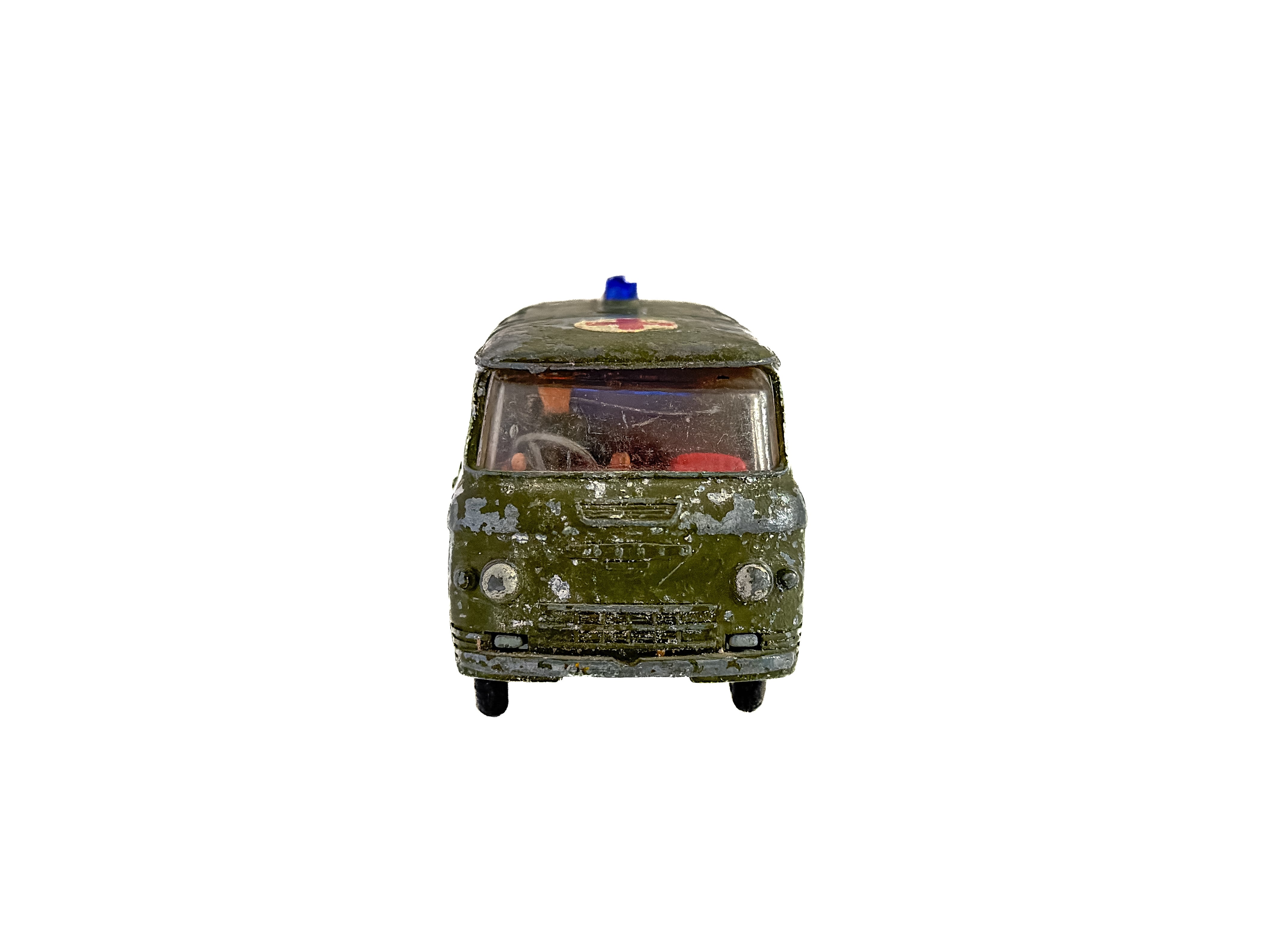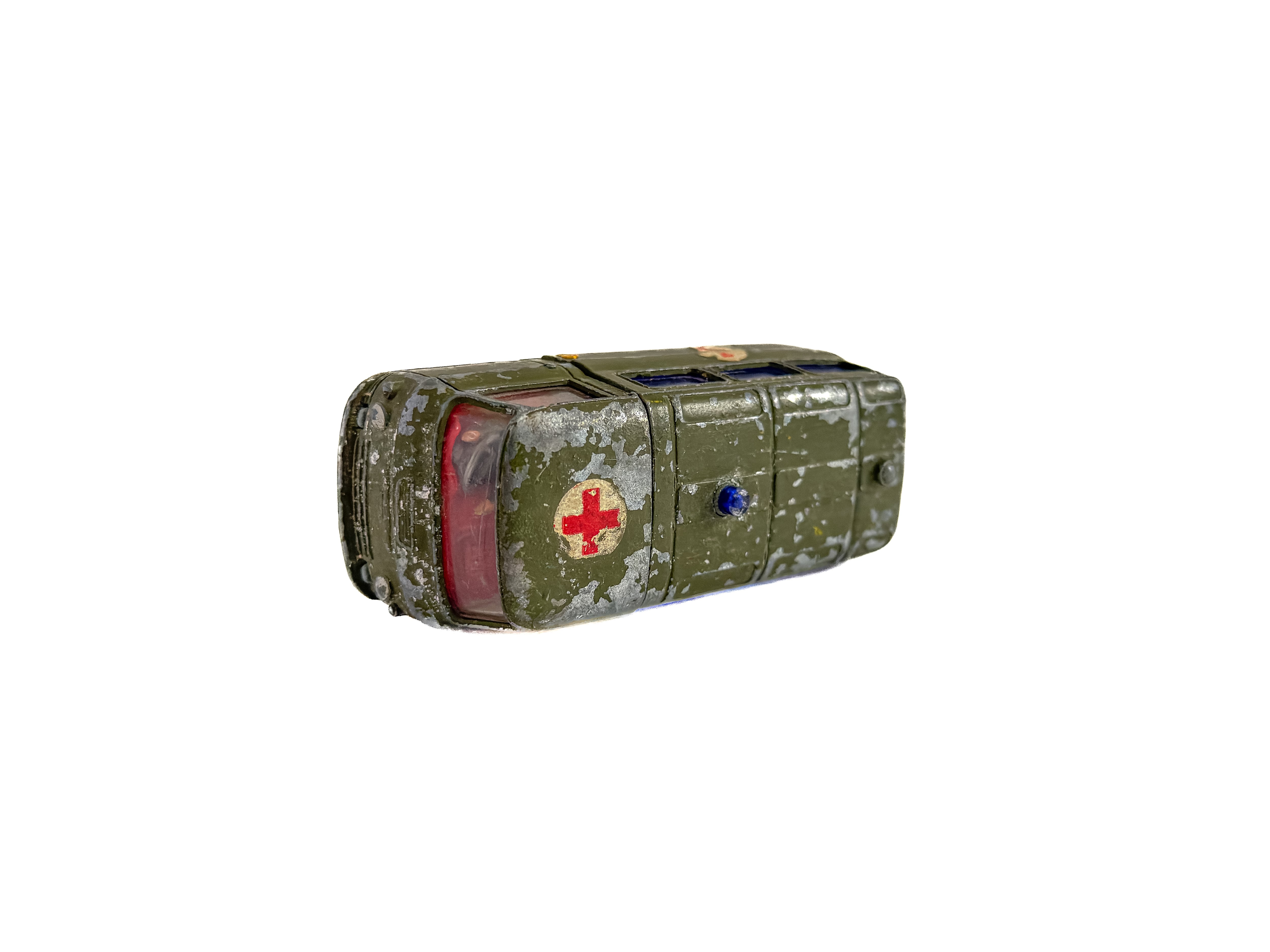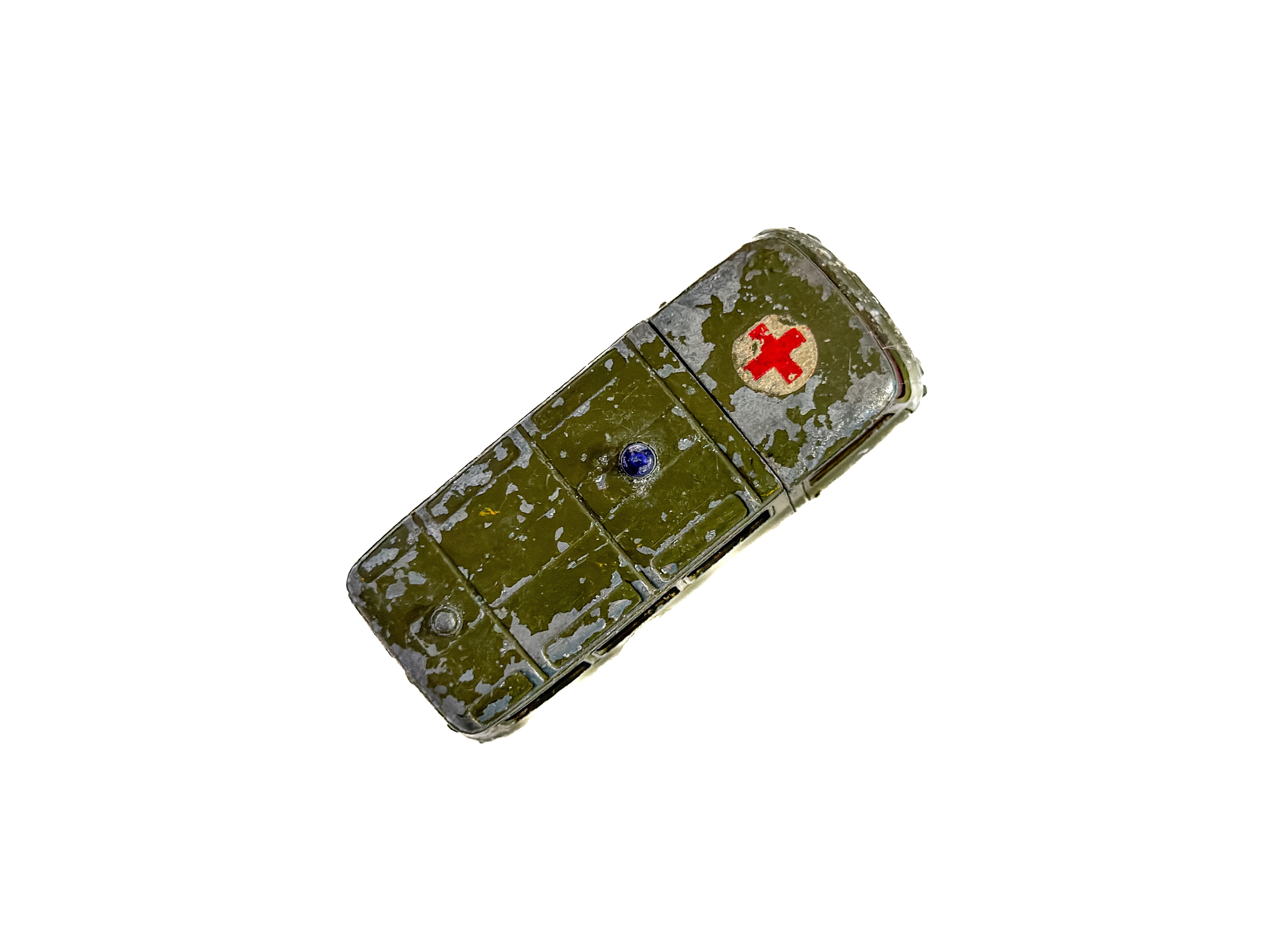 1960年代頃のミニカー。イギリス「Corgi Toys」製の軍用救急車です。深みのあるオリーブグリーンのボディ、ブルーのウィンドウ、赤十字のエンブレム。重厚なダイキャストの質感が魅力です。オリジナルならではの風格をしっかりと感じられます。運転席に残るドライバー人形は、欠損している個体も少なくない中、この存在はコレクターにとっては嬉しい存在です。裏面には「CORGI TOYS」「MADE IN GT. BRITAIN」の刻印があります。