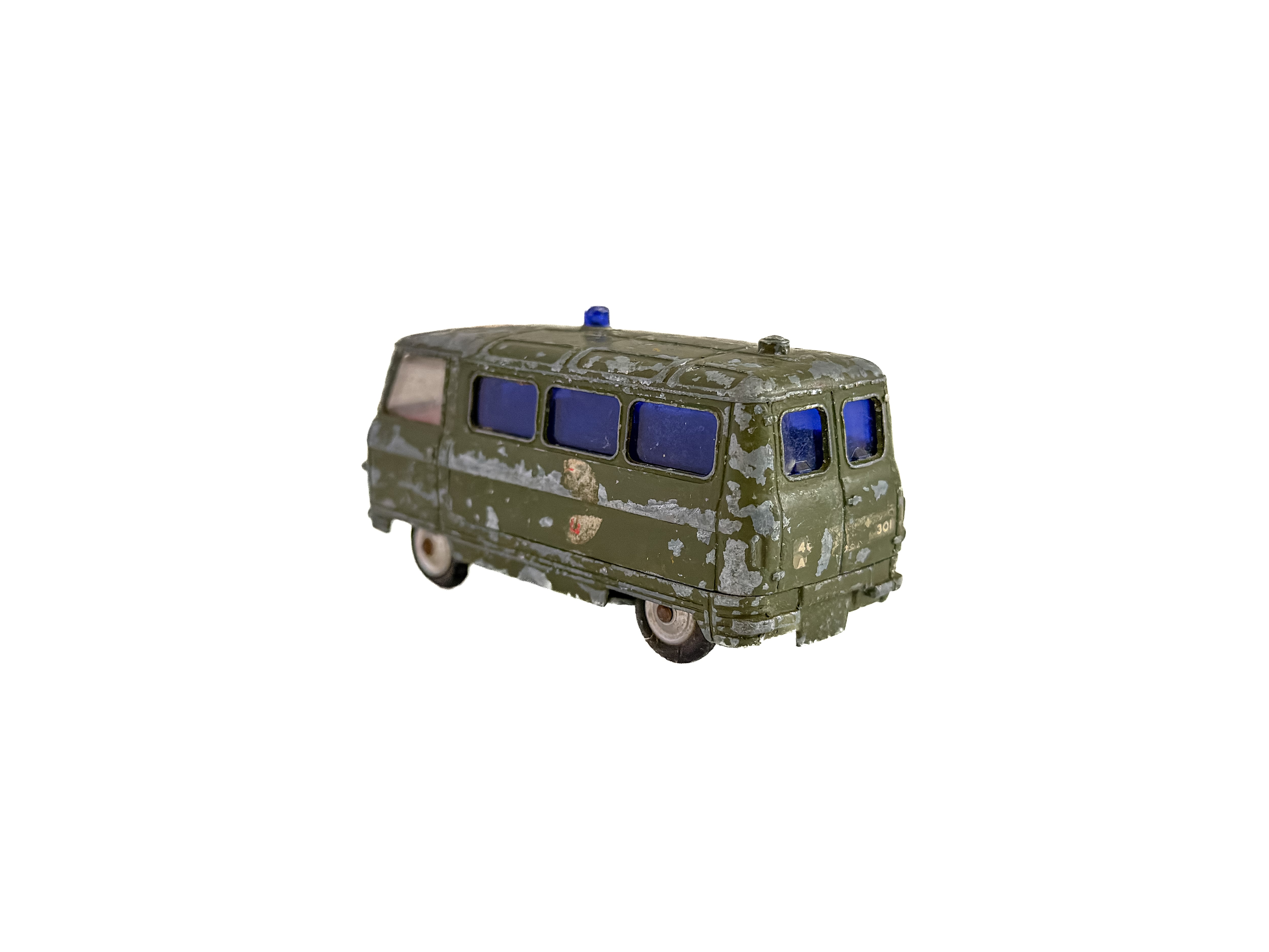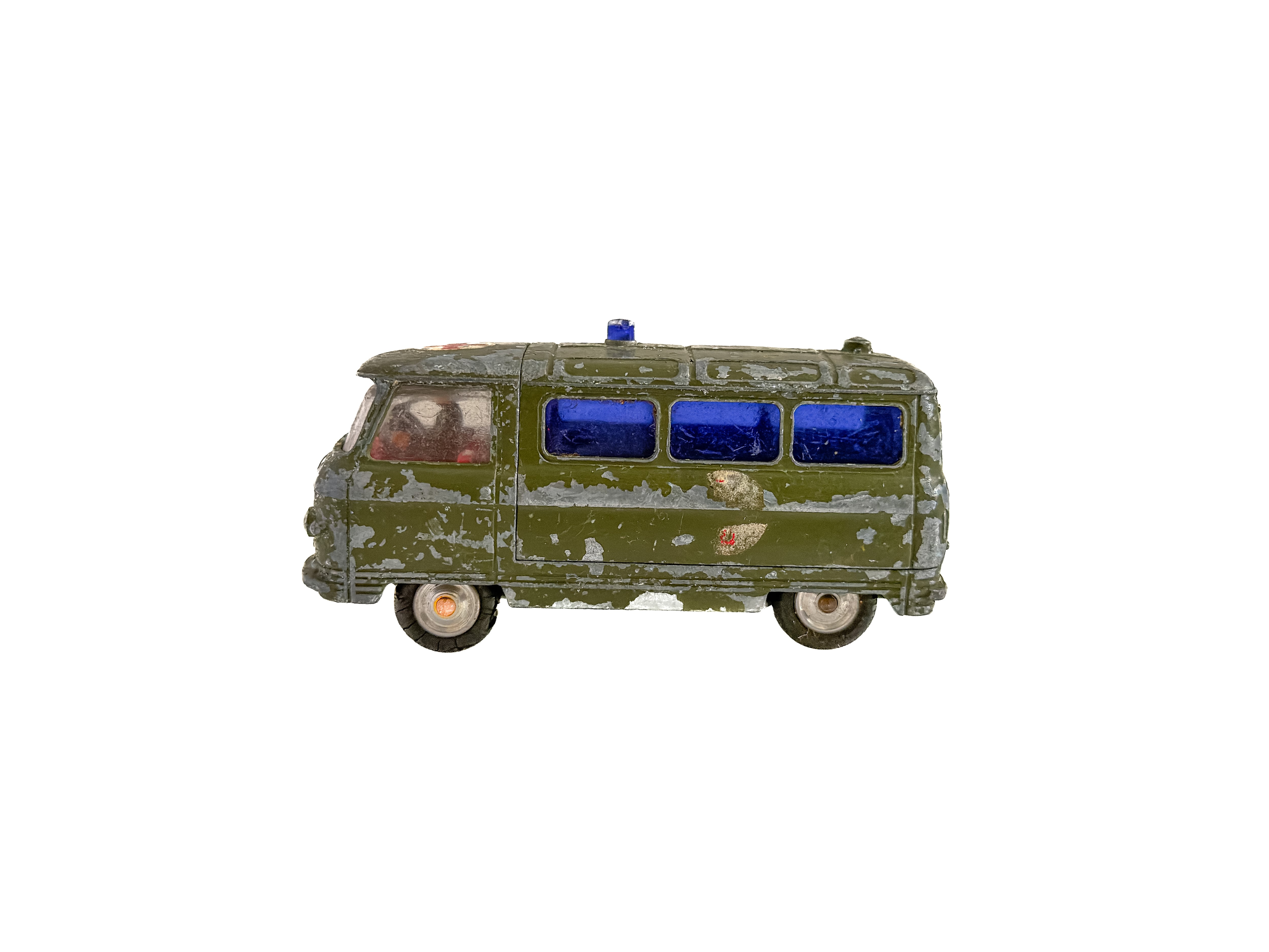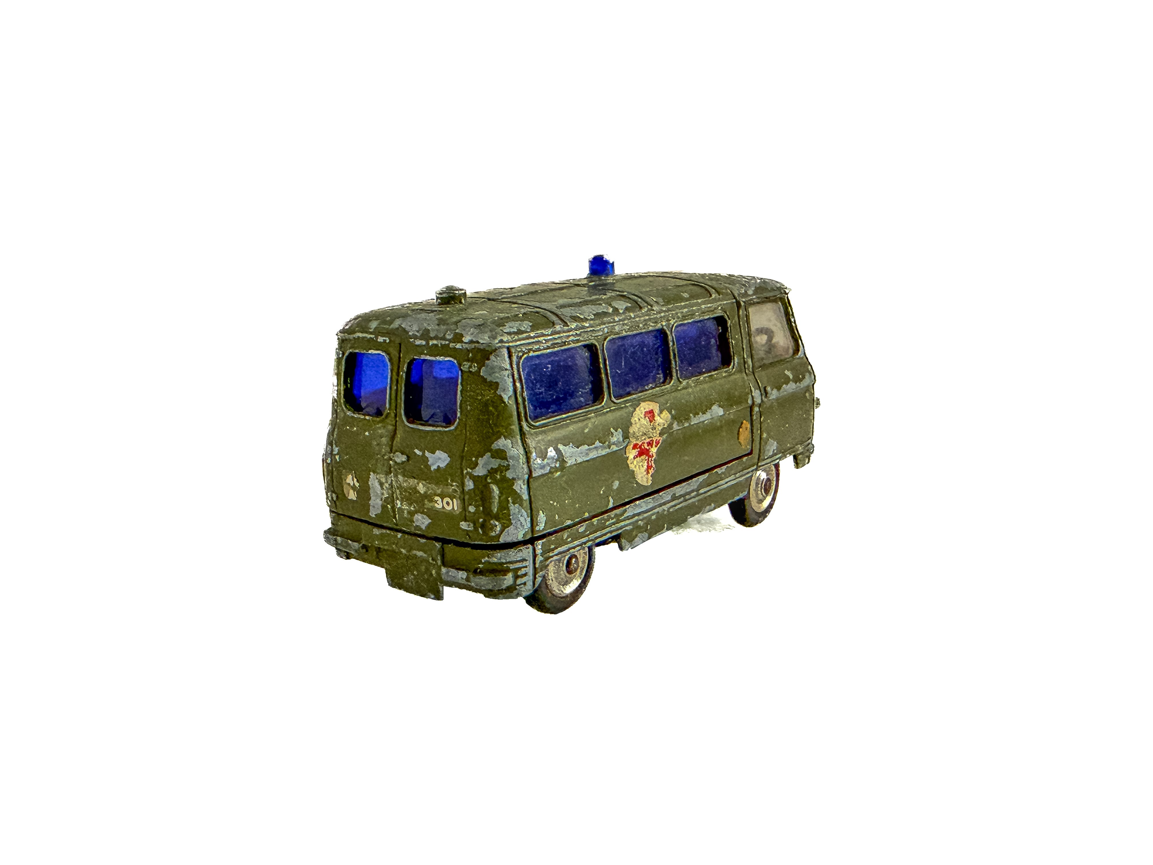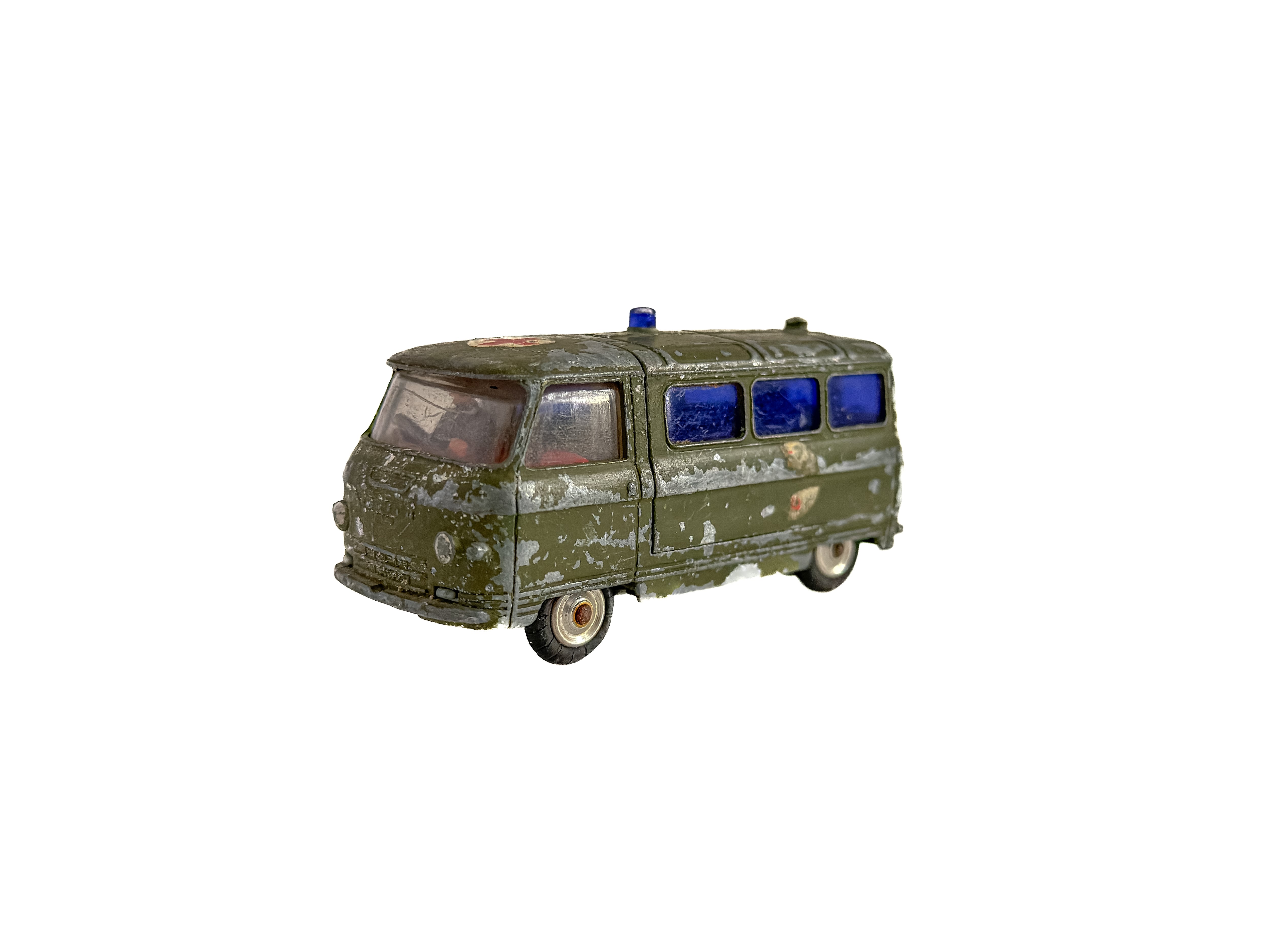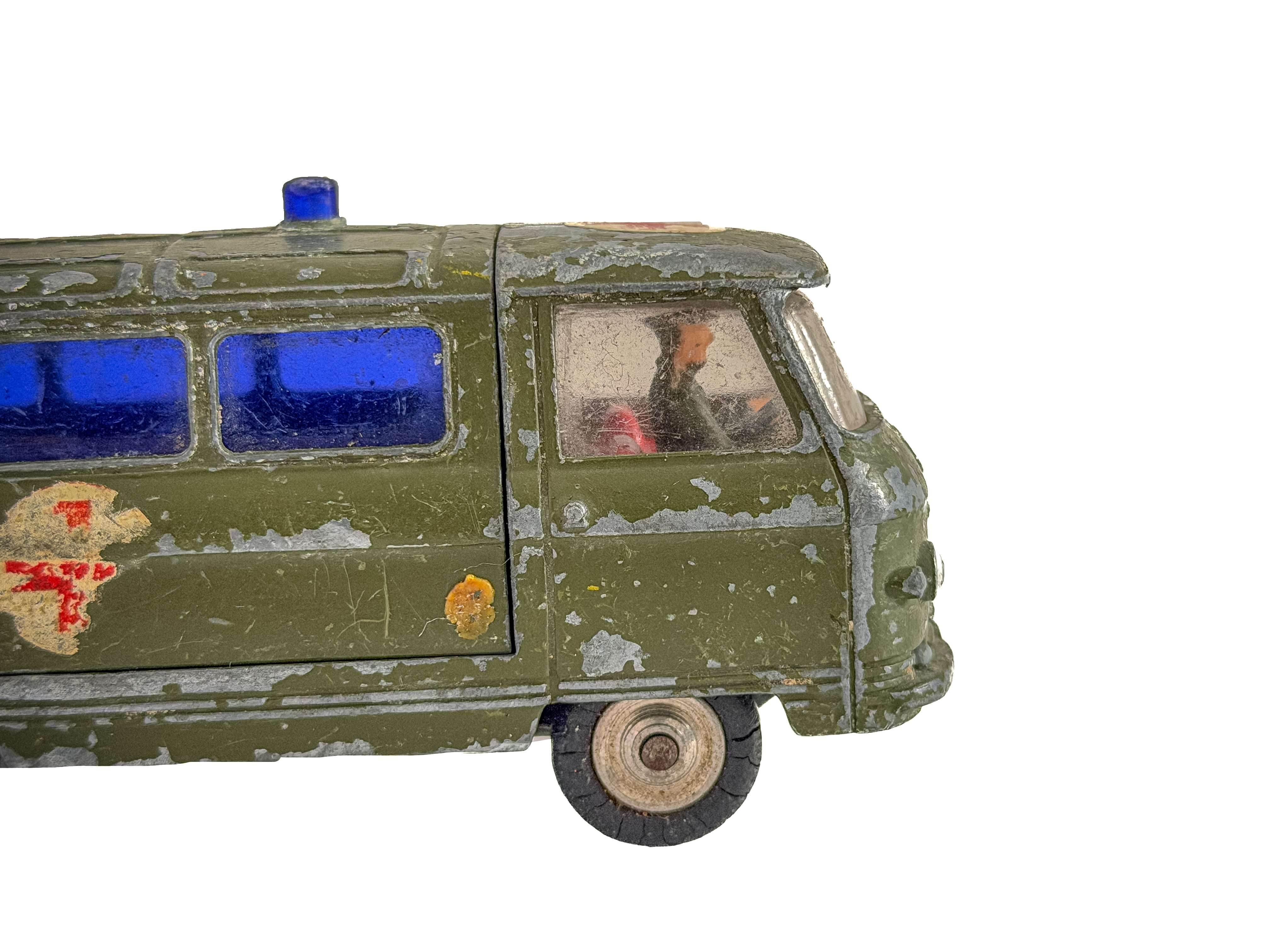 1960年代頃のミニカー。イギリス「Corgi Toys」製の軍用救急車です。深みのあるオリーブグリーンのボディ、ブルーのウィンドウ、赤十字のエンブレム。重厚なダイキャストの質感が魅力です。オリジナルならではの風格をしっかりと感じられます。運転席に残るドライバー人形は、欠損している個体も少なくない中、この存在はコレクターにとっては嬉しい存在です。裏面には「CORGI TOYS」「MADE IN GT. BRITAIN」の刻印があります。