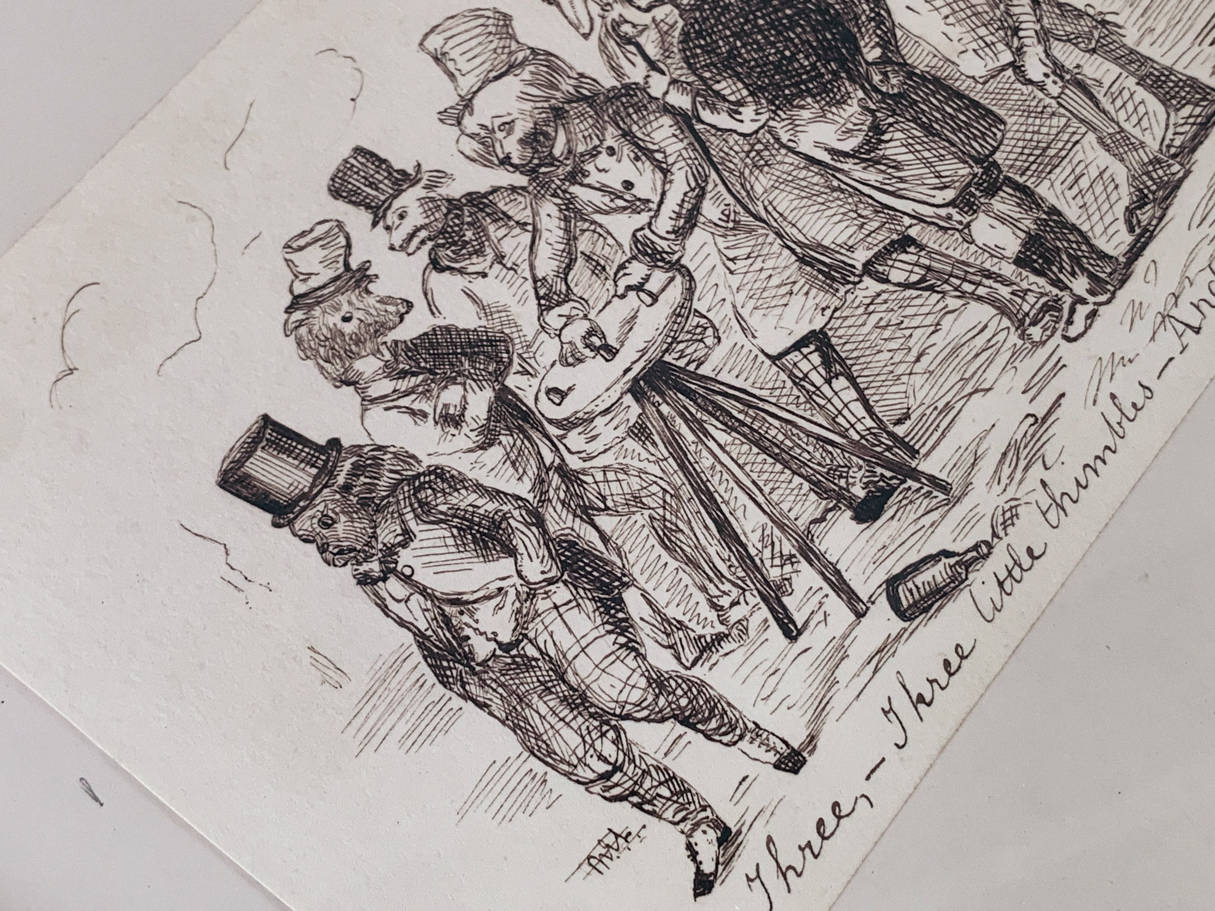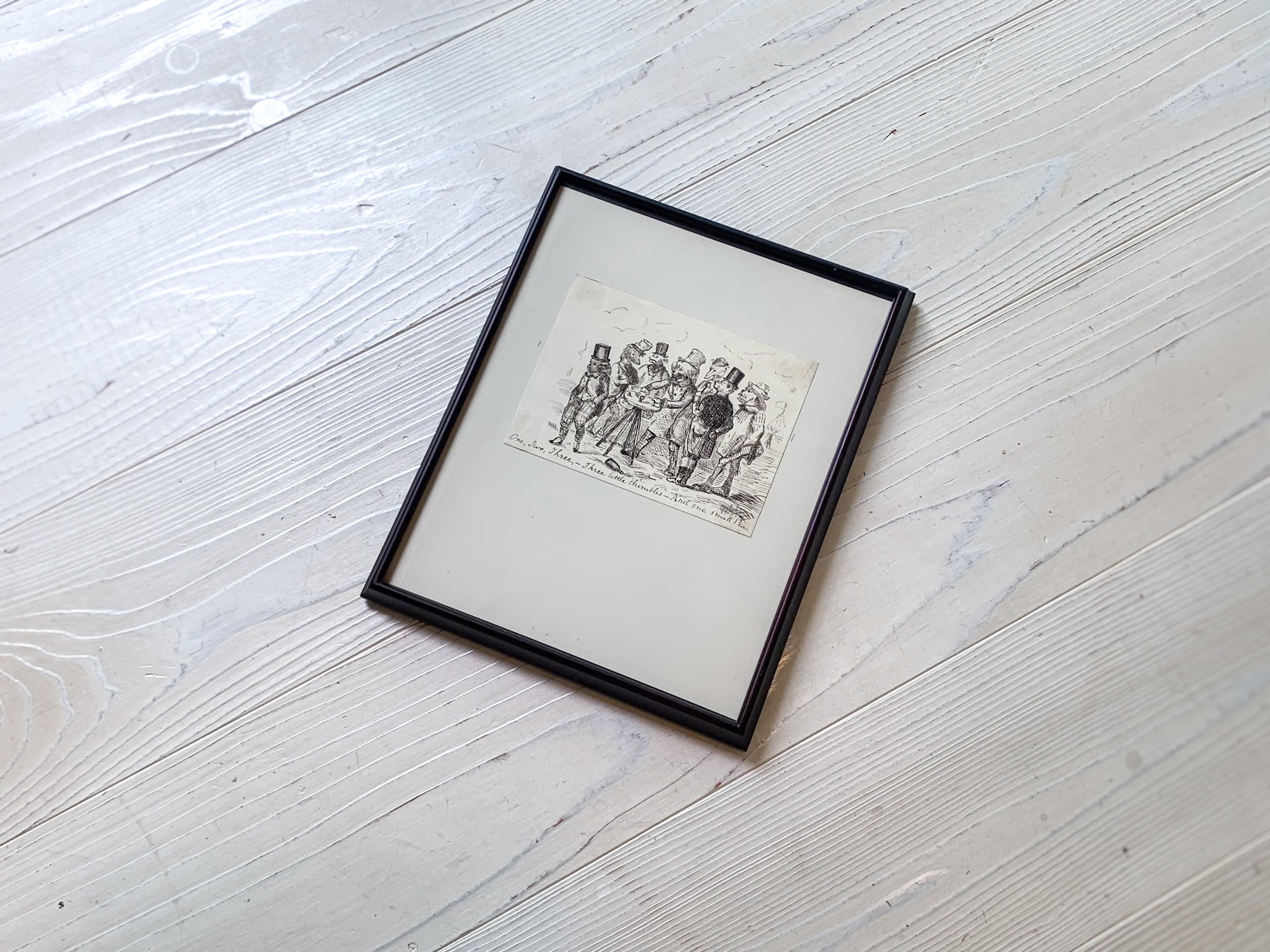 イギリスで見つけた、風刺本の挿絵として制作された古い版画です。1830〜1860年頃の作品と思われます。シルクハットをかぶり、洒落た格好をした紳士たちが小さなテーブルを囲み、ゲームに興じる様子が描かれています。それぞれの仕草や表情がどこか愛らしく、今にも会話が聞こえてきそうなユーモラスな場面です。細やかな線で丁寧に表現された銅版画ならではの繊細なタッチも魅力です。19世紀の小さなワンシーンを切り取ったような、味わい深い版画です。左下にサインも見られます。