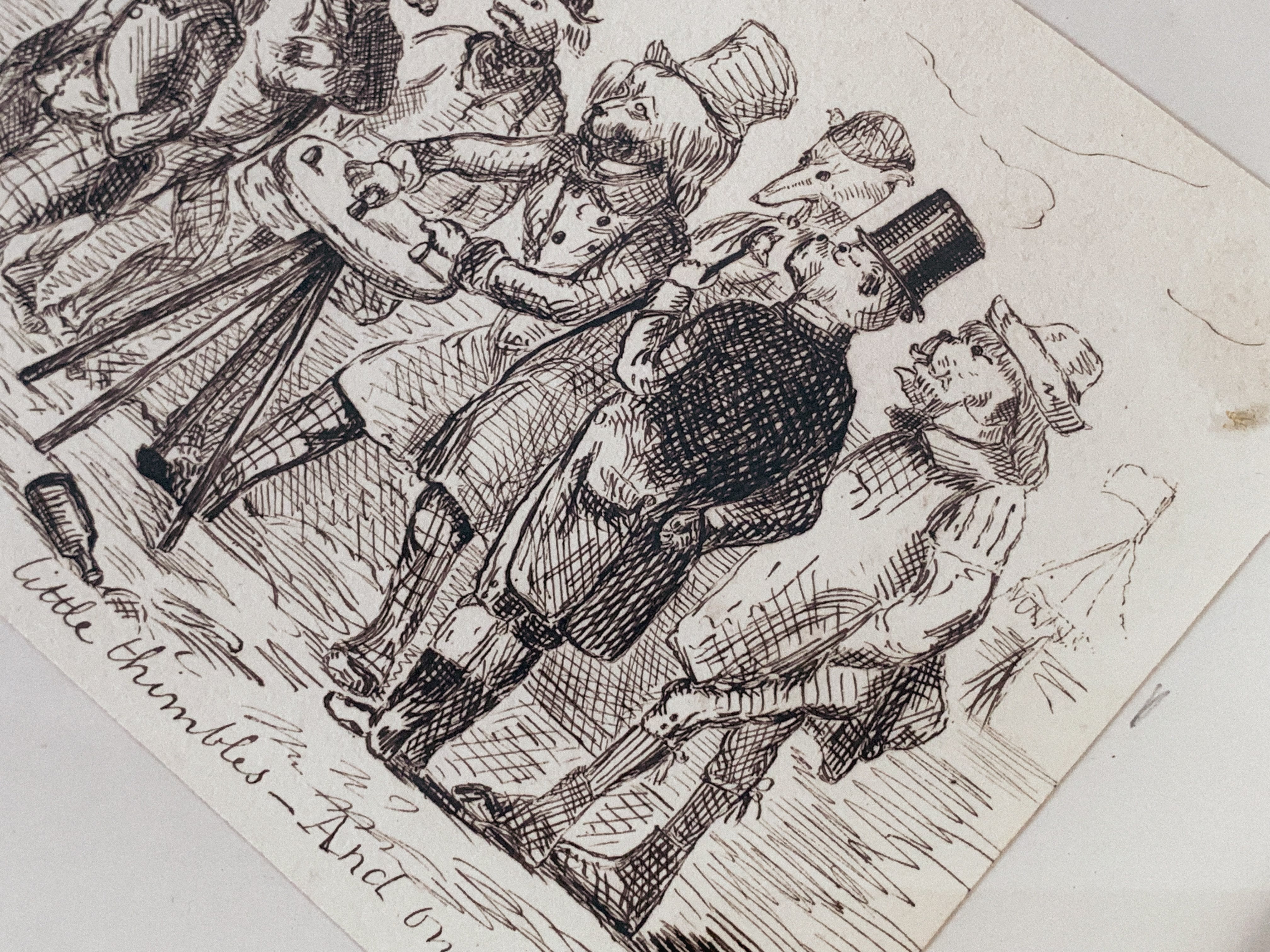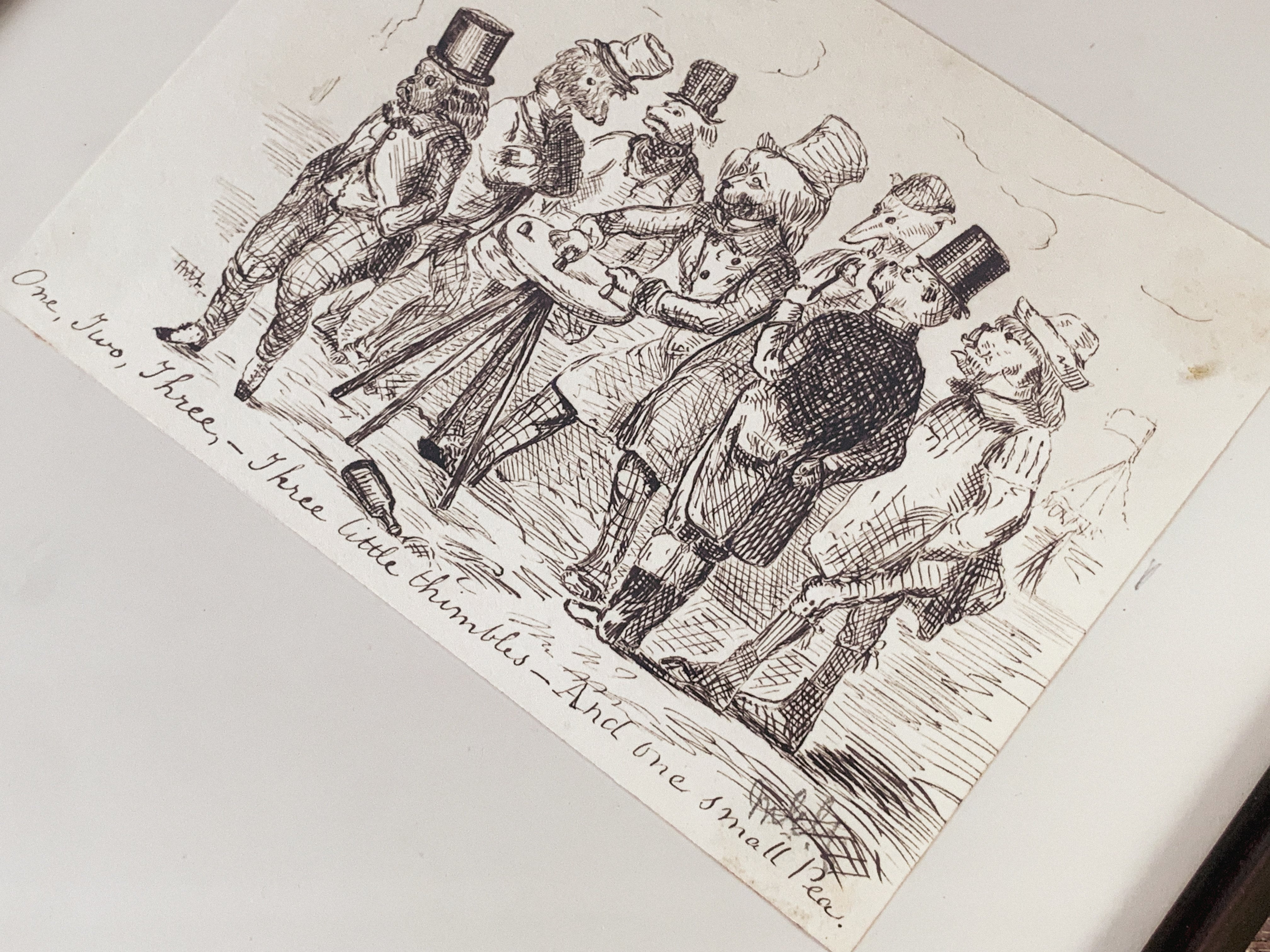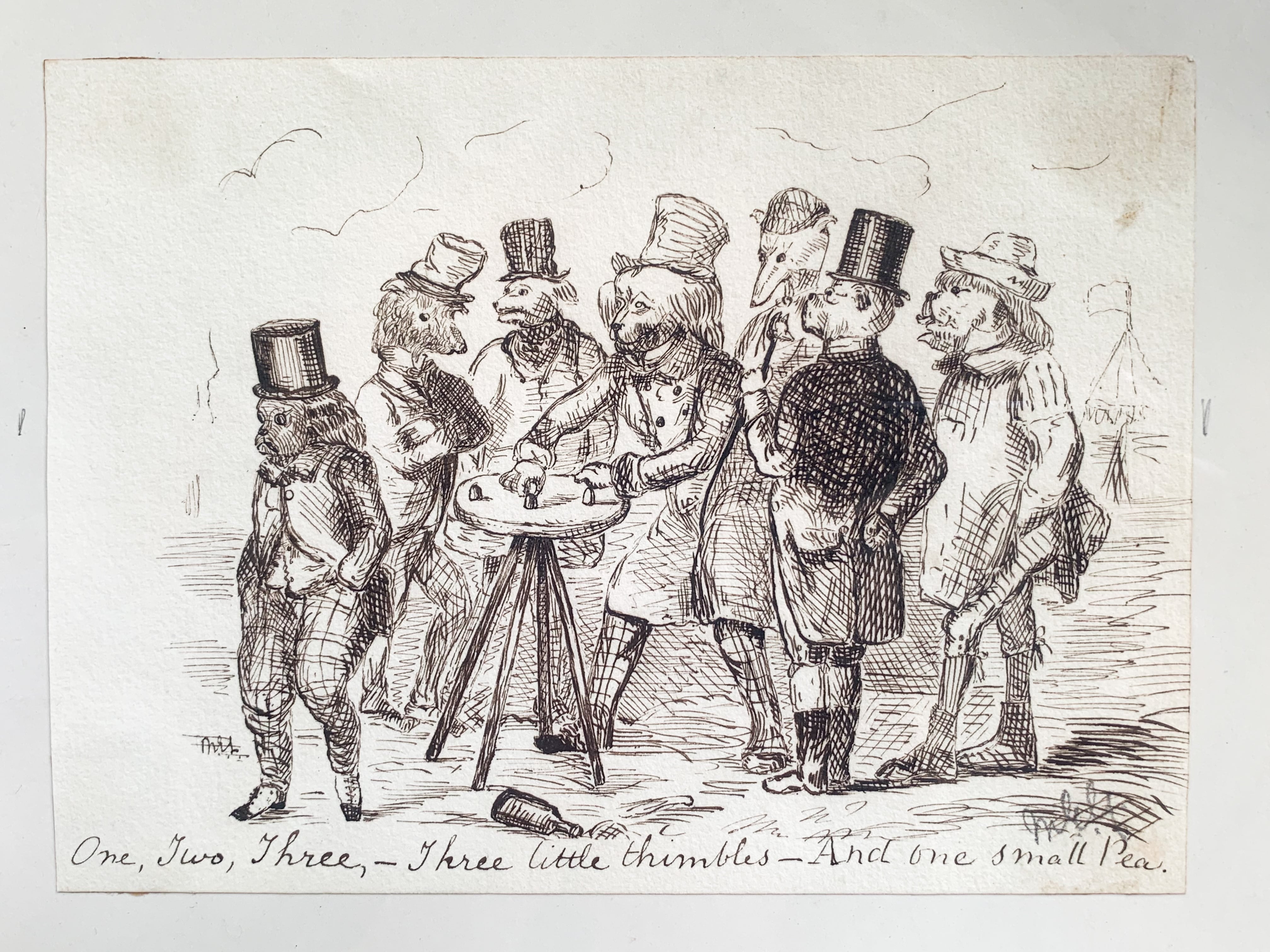 「シンブルゲーム(Thimble game)」と呼ばれる遊びで、テーブルの上に3つの指ぬきを伏せ、そのうちの1つに玉を隠します。ディーラーが素早く指ぬきをシャッフルし、玉がどこにあるかを当てるゲームです。当時は街の見世物や賭け事としても親しまれていました。そんな当時のユーモアや風刺を感じさせる、英国らしい場面が描かれた一枚です。