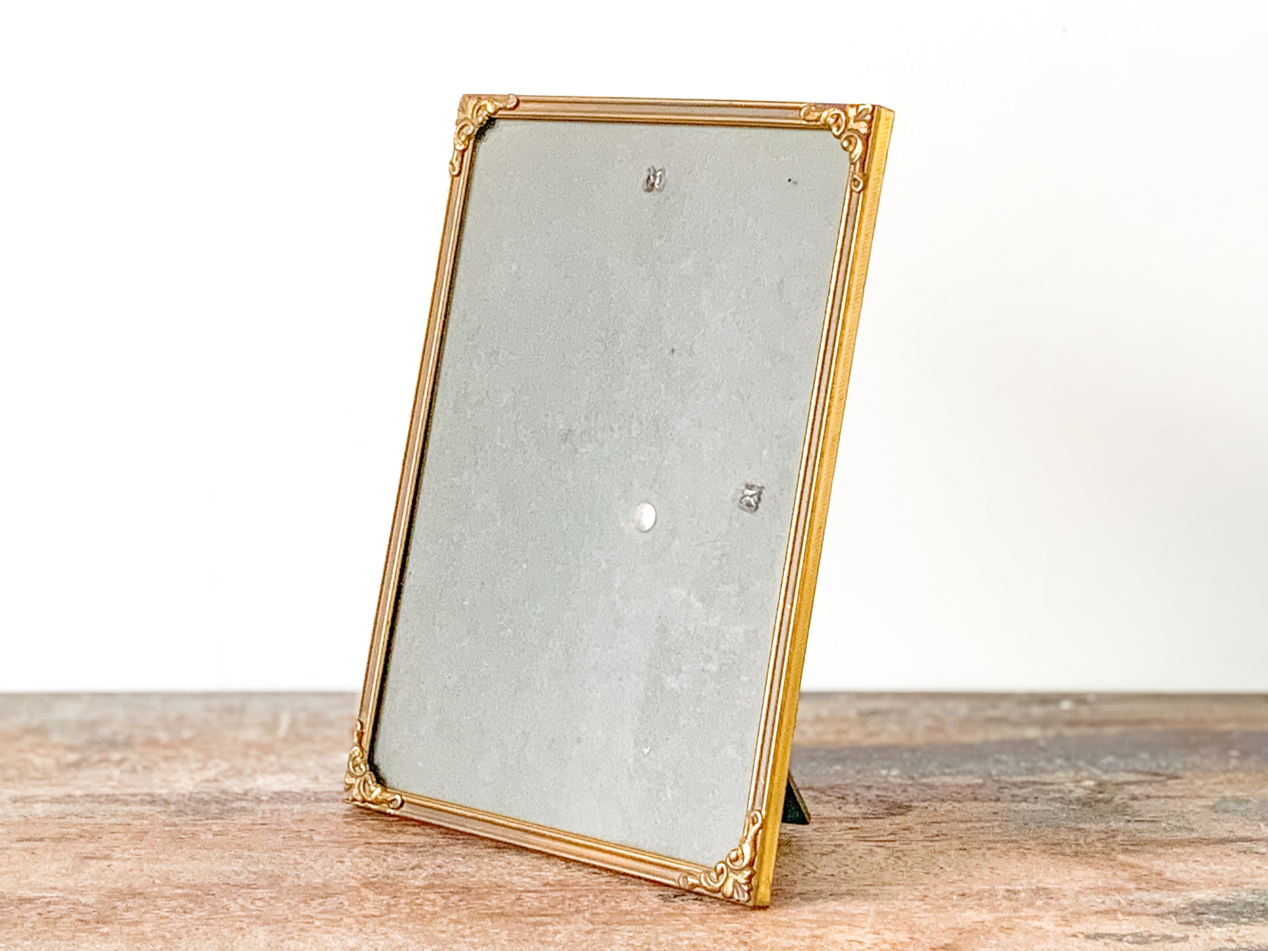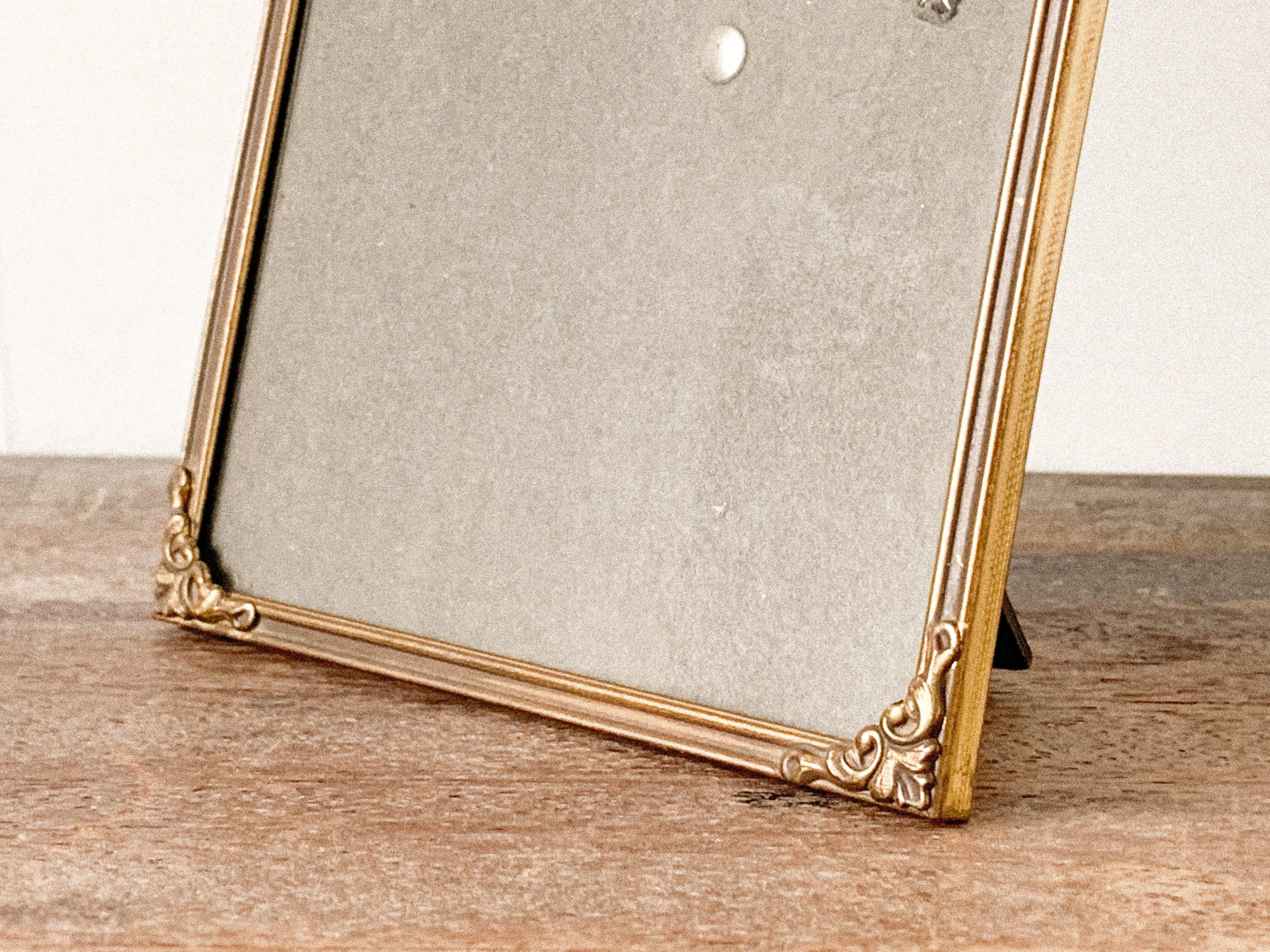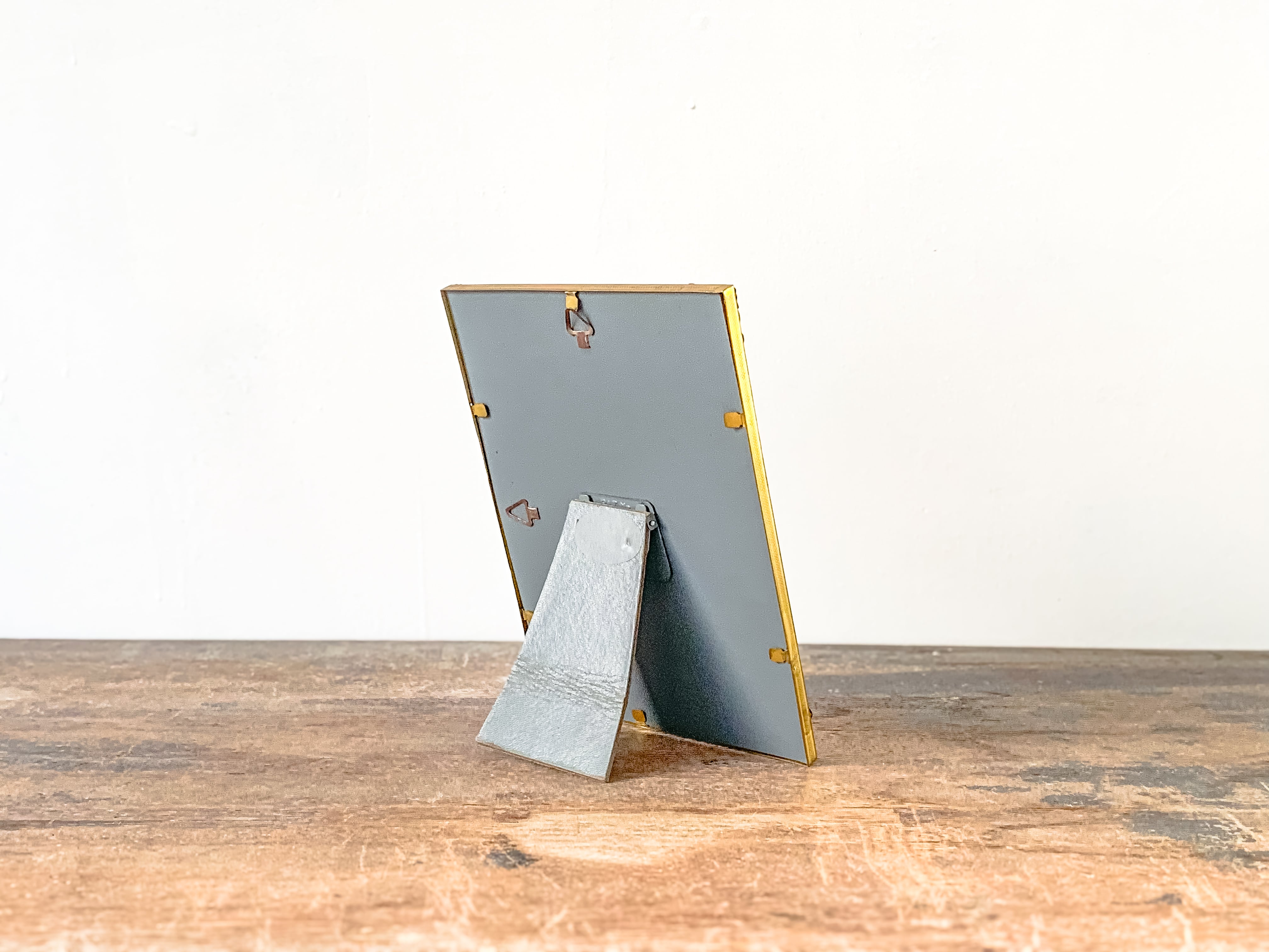 小ぶりなサイズのフォトフレーム。落ち着いたゴールドの色合いと、角に施されたさりげない装飾が上品で雰囲気のあるお品です。壁掛けの場合は縦・横どちらでもお使いいただけます。スタンドも付いているので、立てて飾ることも出来ます。お気に入りの写真や、ポストカード、小さな版画を入れても良いですね。小さなスペースにも飾りやすいです。フレーム部分はメタルっぽい質感です。