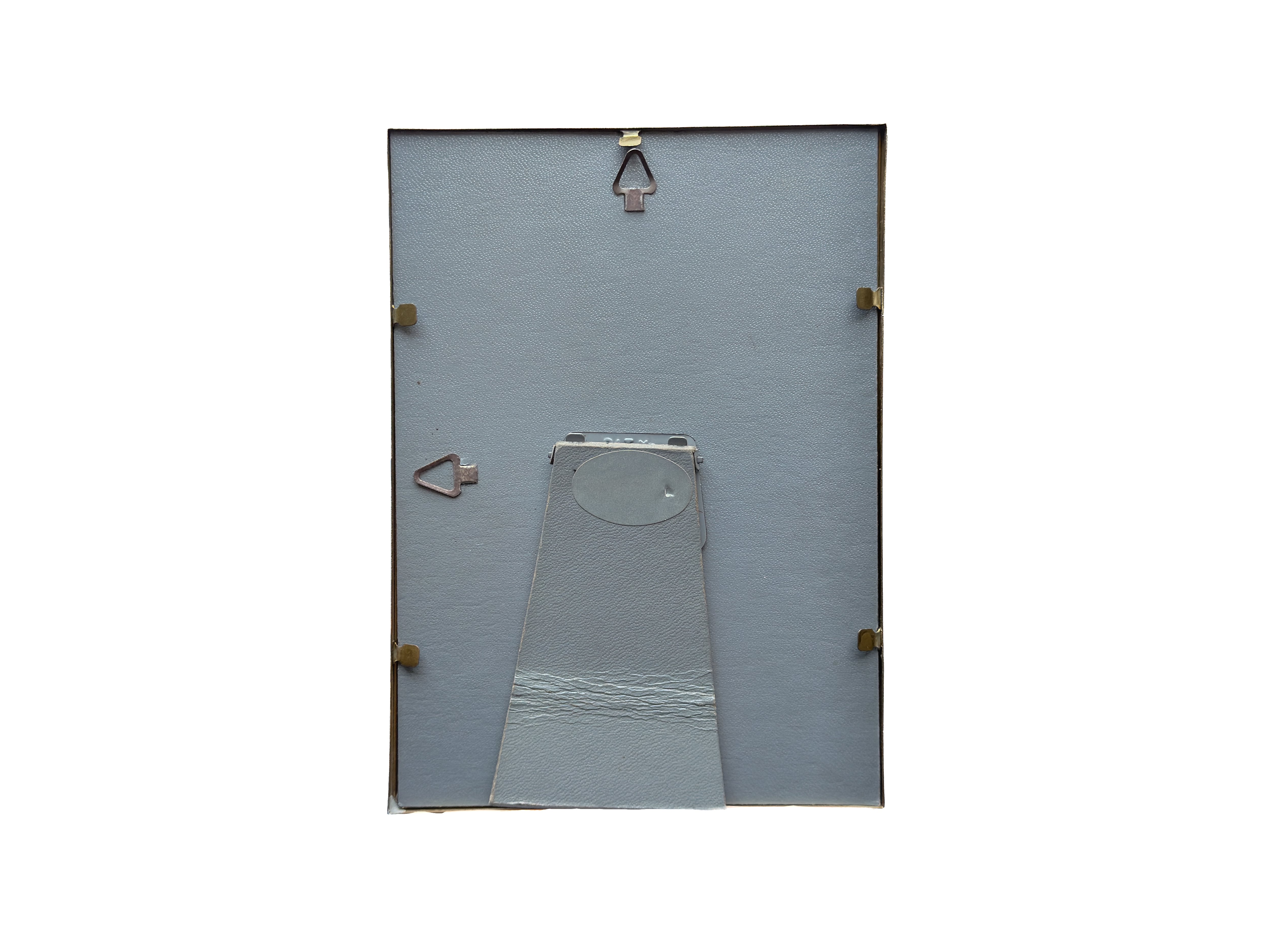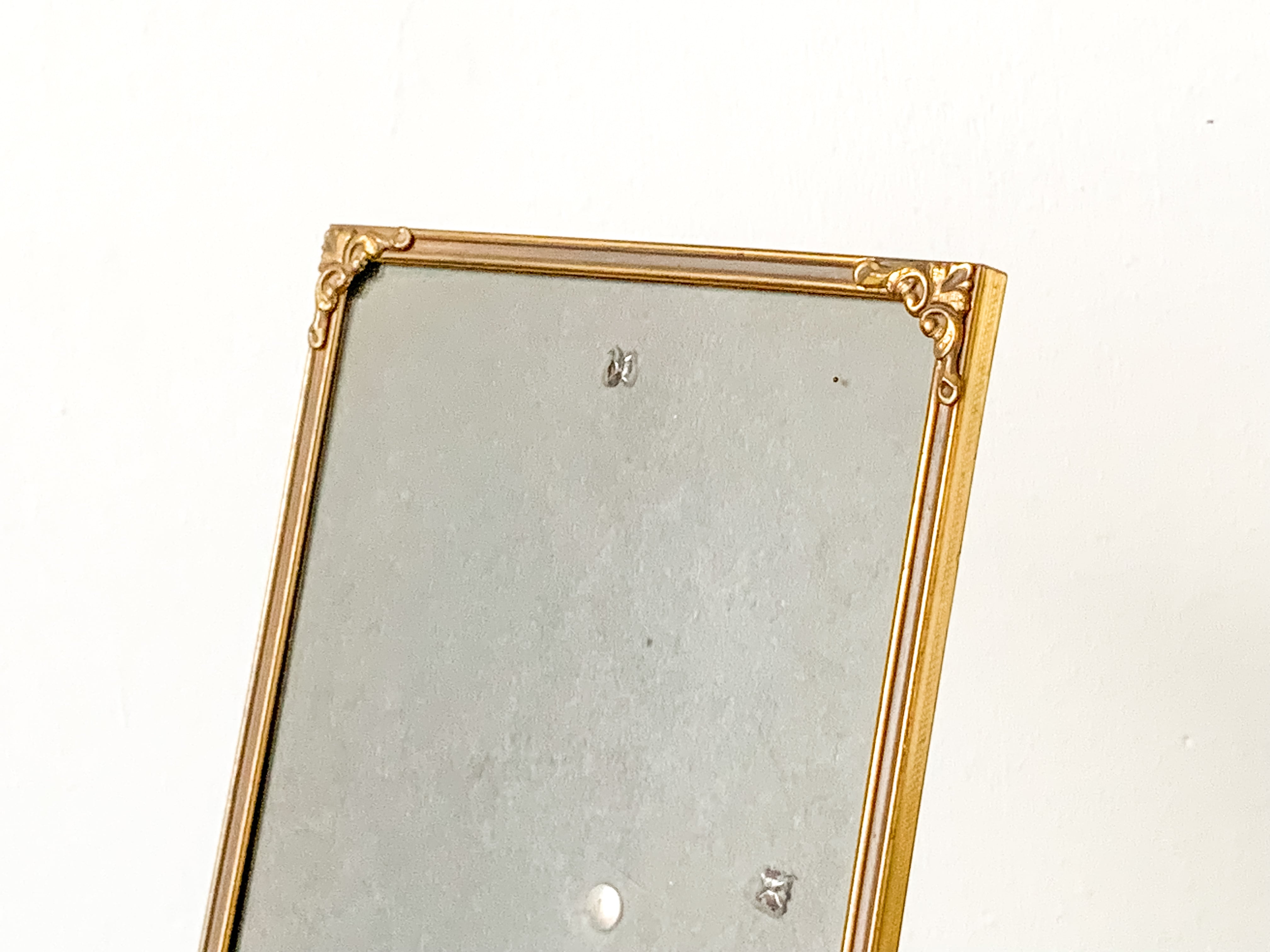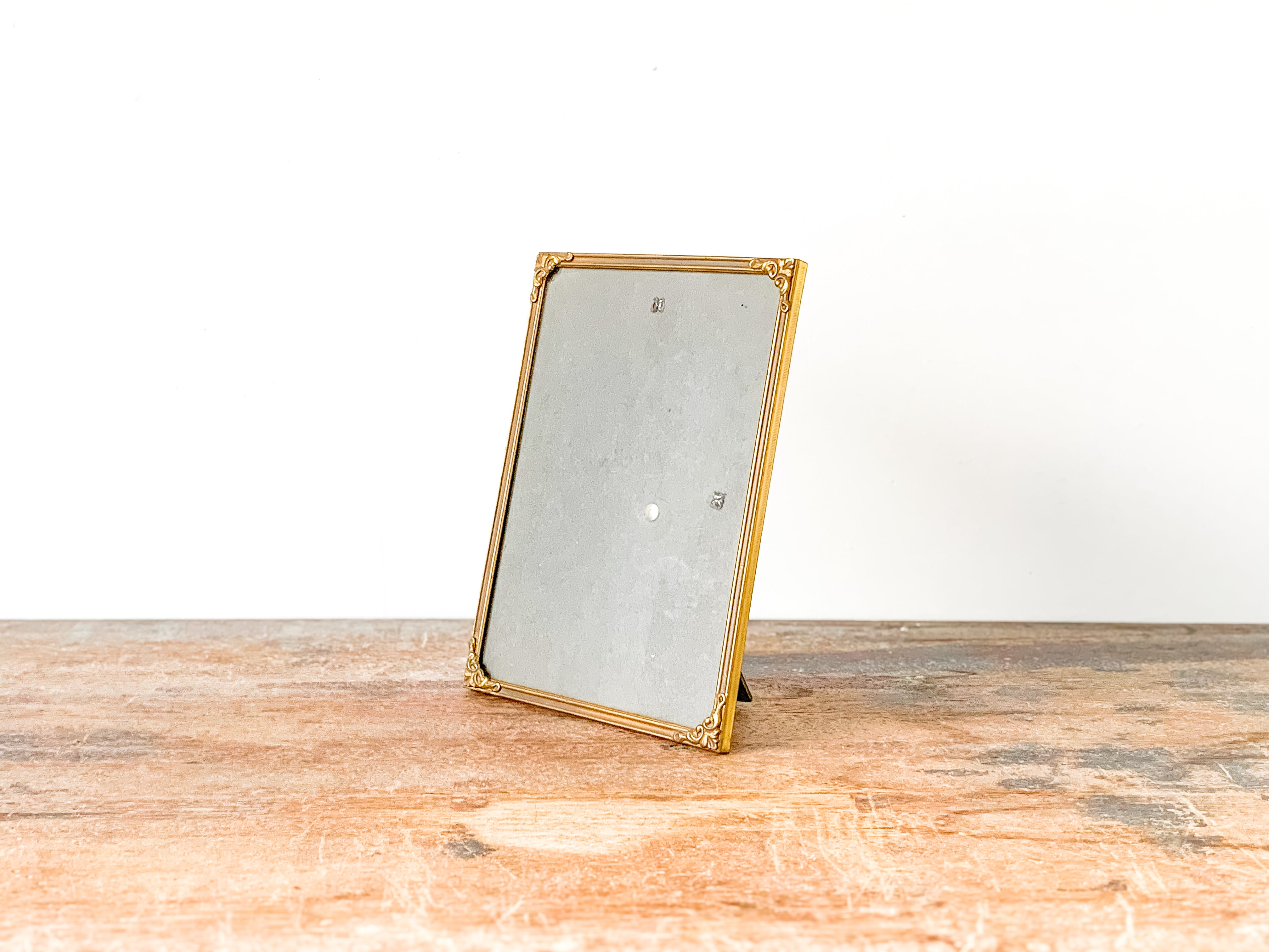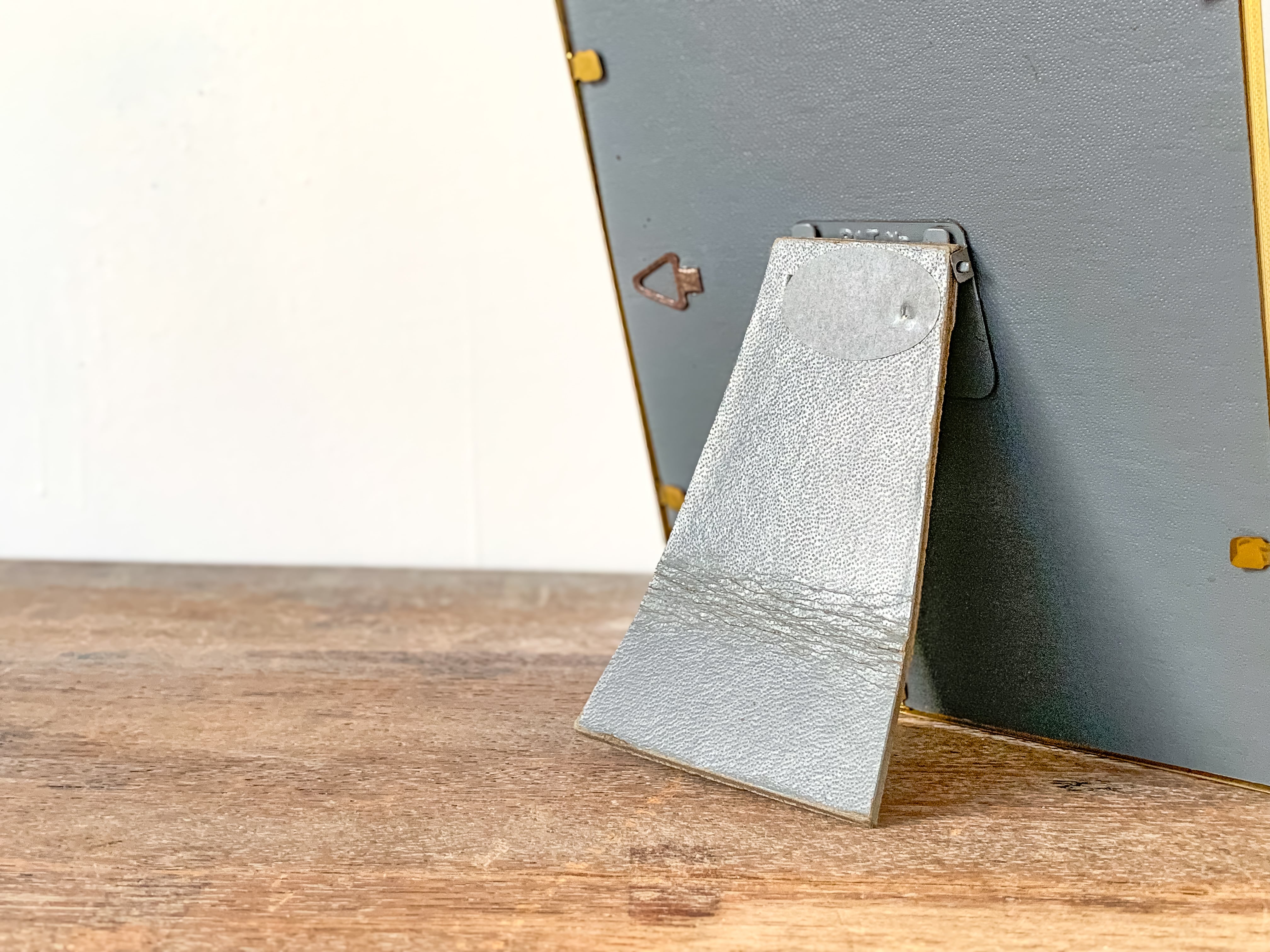 小ぶりなサイズのフォトフレーム。落ち着いたゴールドの色合いと、角に施されたさりげない装飾が上品で雰囲気のあるお品です。壁掛けの場合は縦・横どちらでもお使いいただけます。スタンドも付いているので、立てて飾ることも出来ます。お気に入りの写真や、ポストカード、小さな版画を入れても良いですね。小さなスペースにも飾りやすいです。フレーム部分はメタルっぽい質感です。