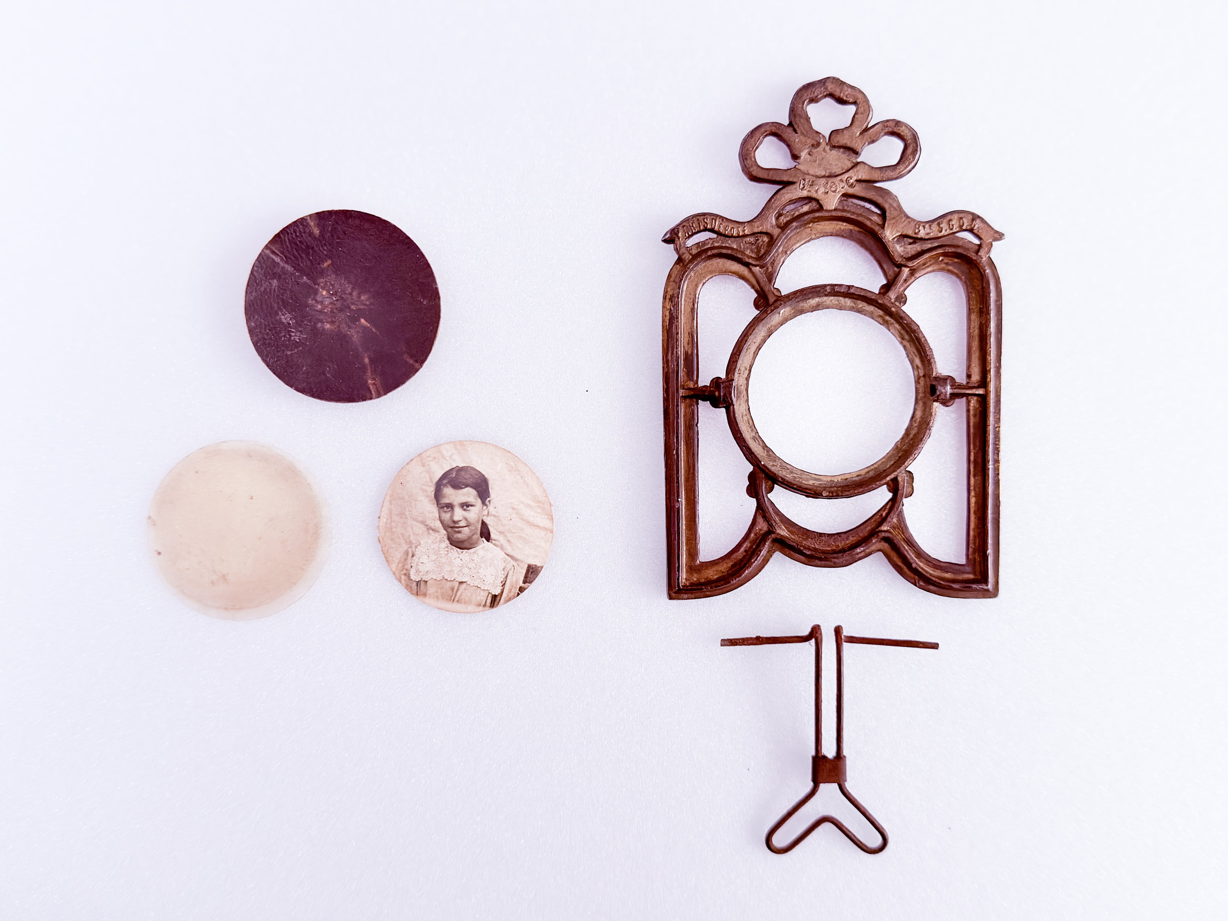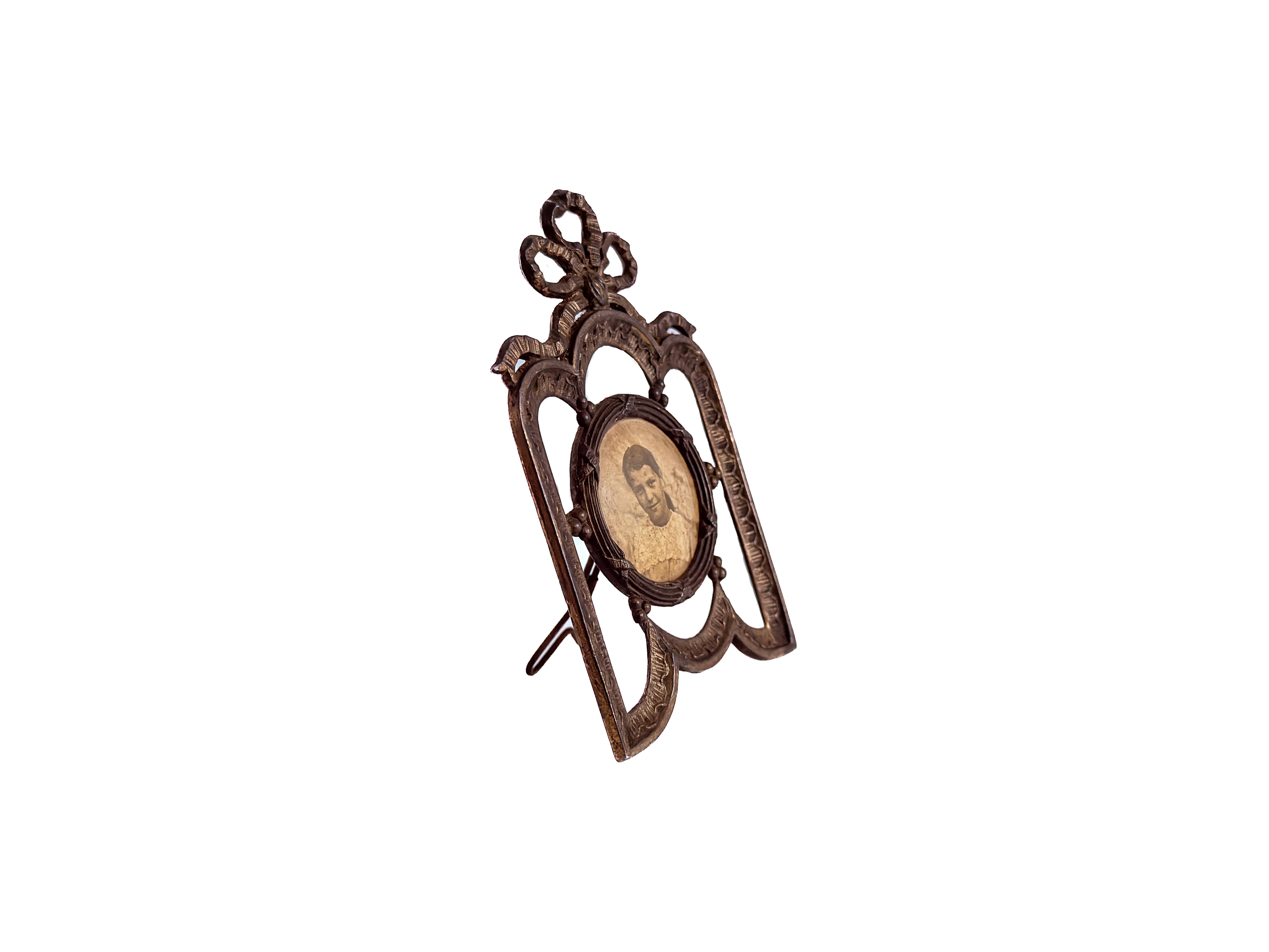 アールデコのリボンデザインが印象的な、小さなアンティークのフォトフレーム。1900年代初期、フランスのものになります。重厚な金属の質感の中に、大きく結ばれたリボンの装飾と、繊細なデザイン。そのコントラストが美しく、静かでありながら、ふと目を惹く存在感があります。中央の丸い窓は小ぶりで愛らしく、現在収められている写真も、当時の古いものになります。