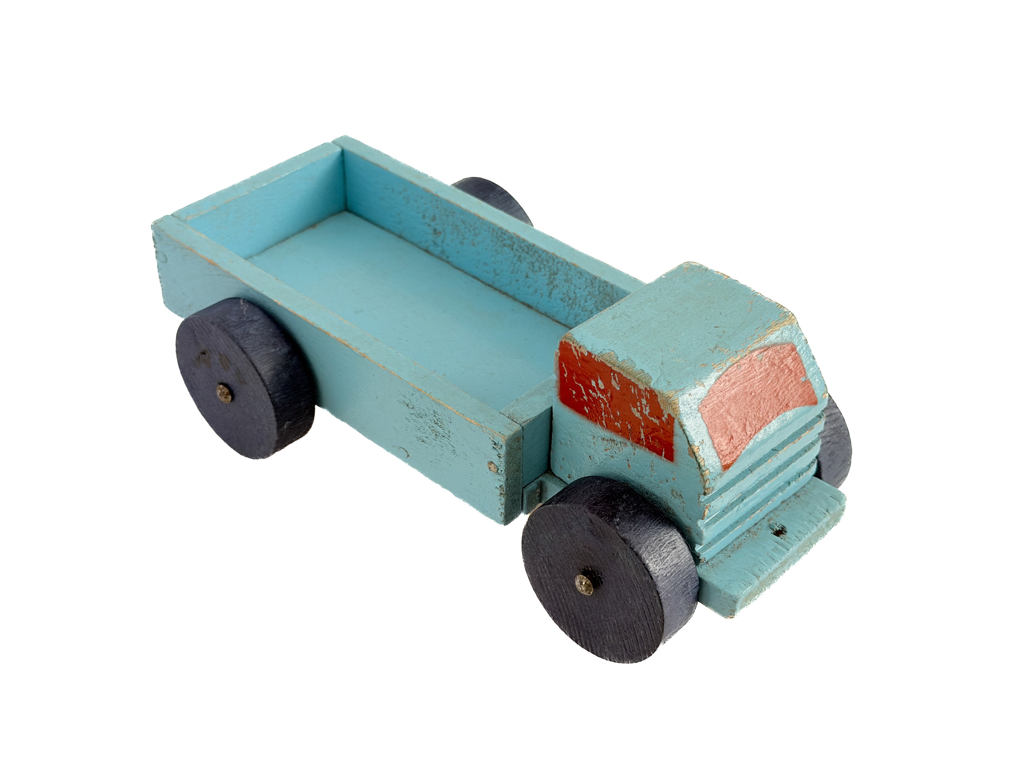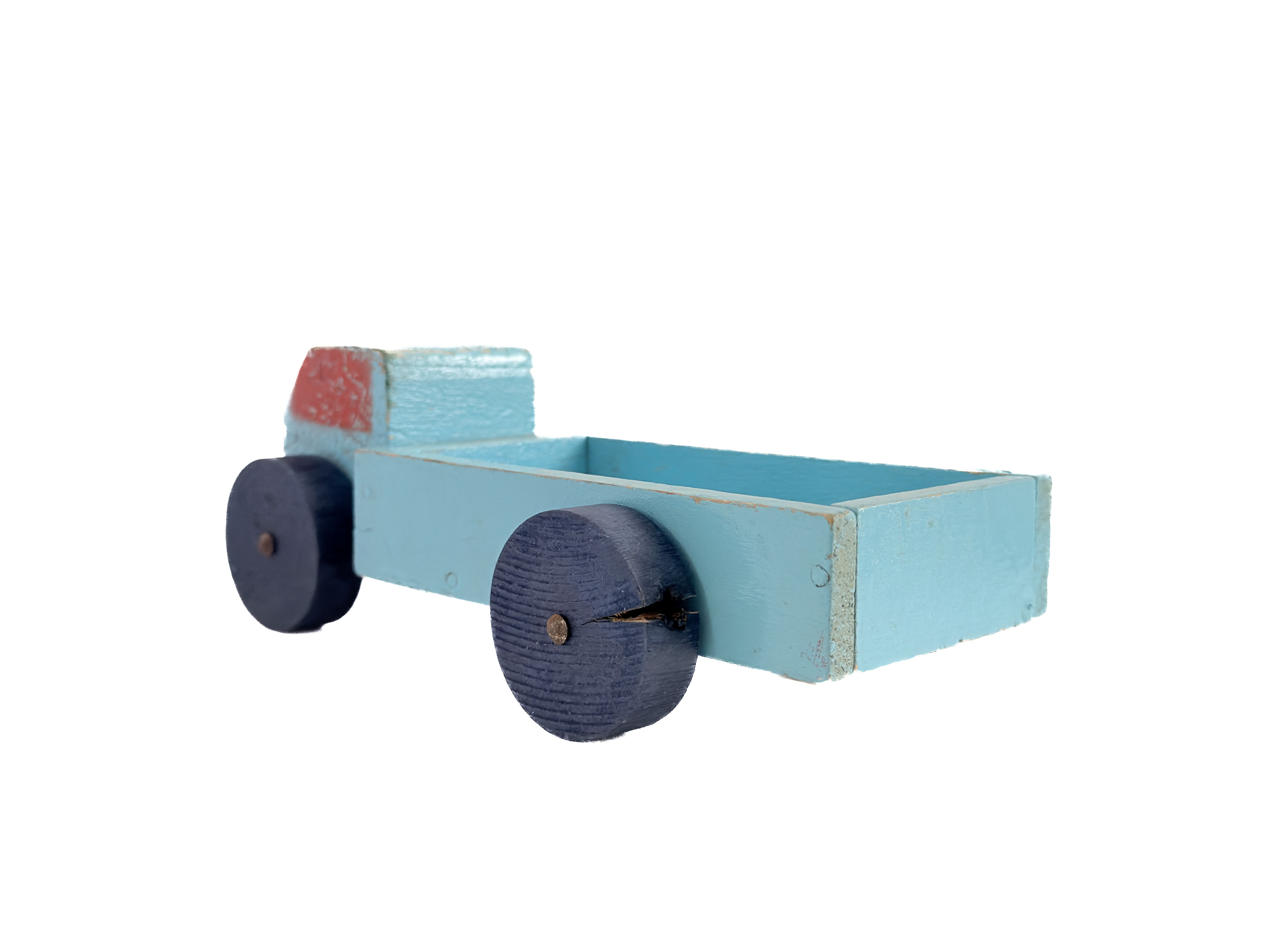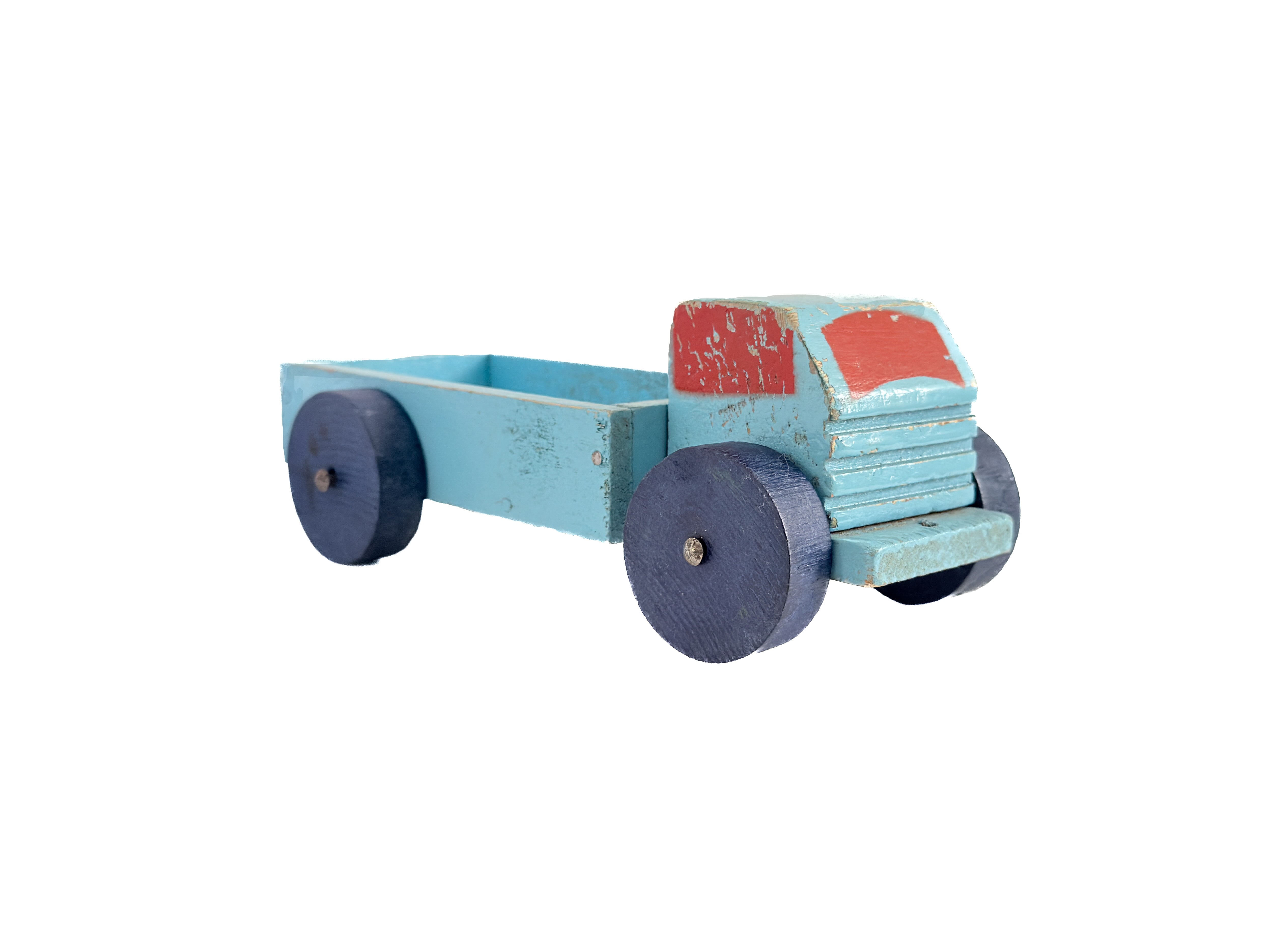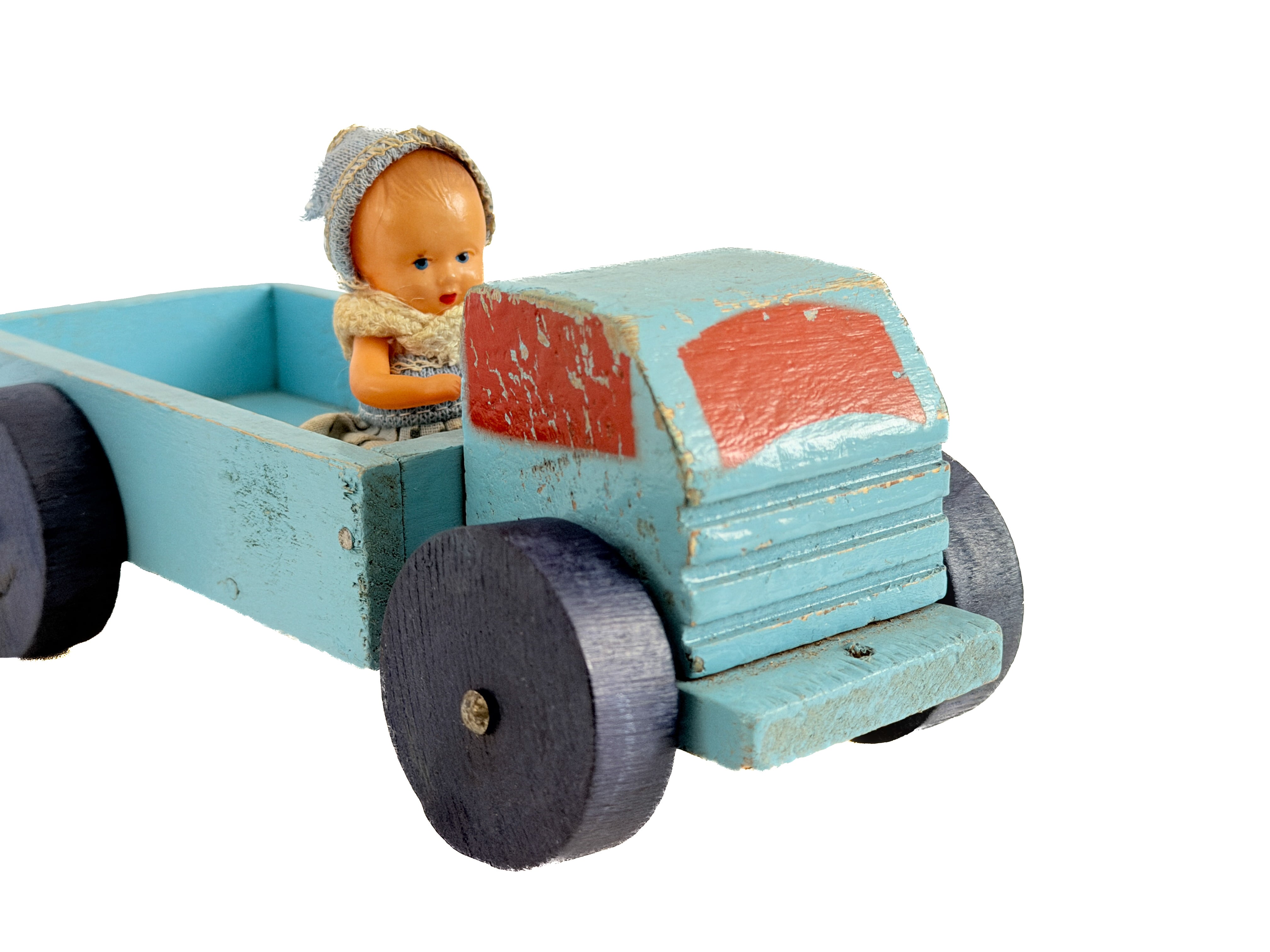 フランスで見つけた、古い木製のトラック。淡いブルーと赤のペイント、くるくると回る木製の車輪や、無駄のないフォルムからは、当時の手仕事の温もりが感じられます。単なる古いおもちゃではなく、オブジェとして飾って頂けます。荷台にお人形を乗せてあげると、さらに可愛いです。※人形は別売りです