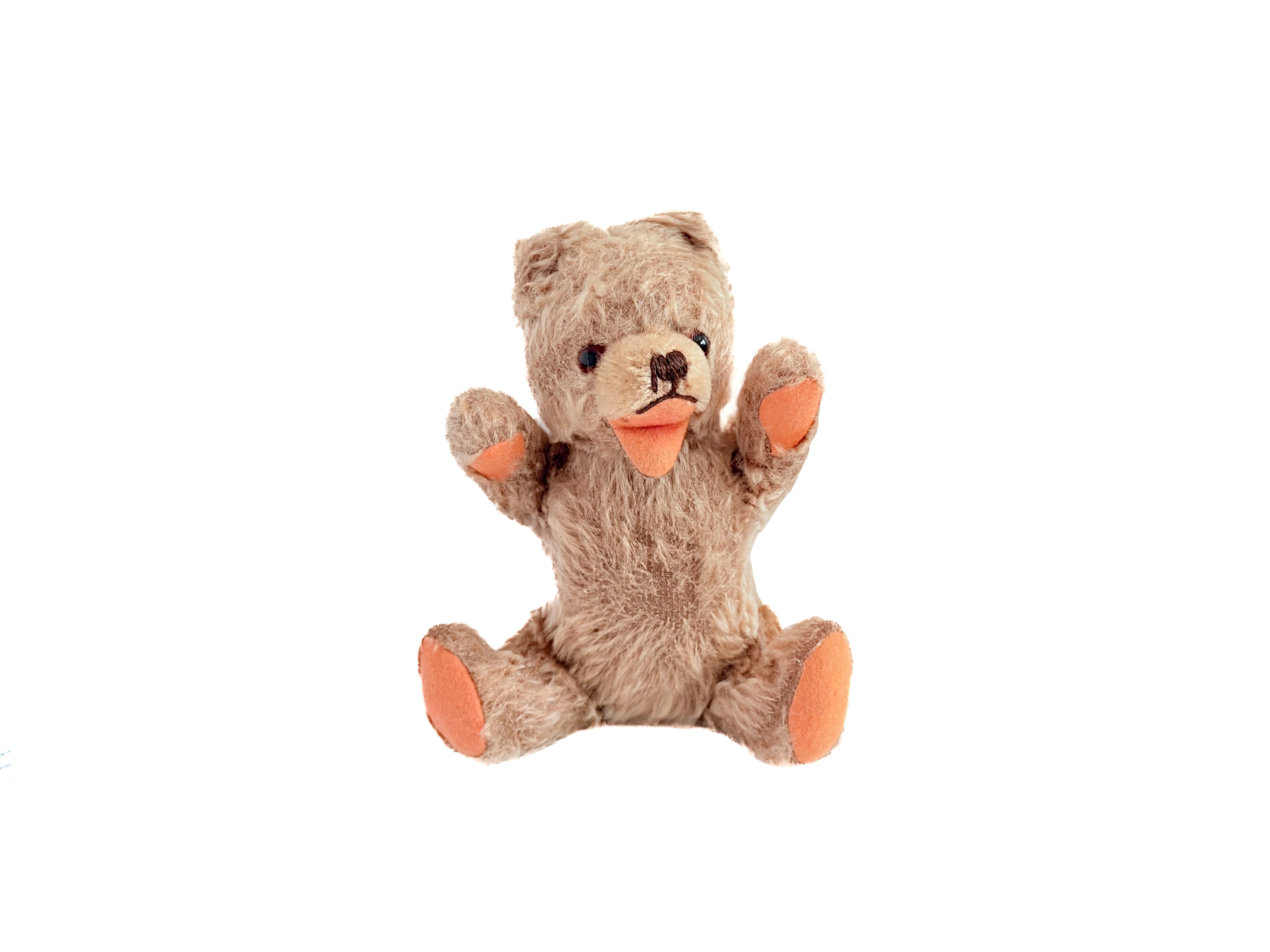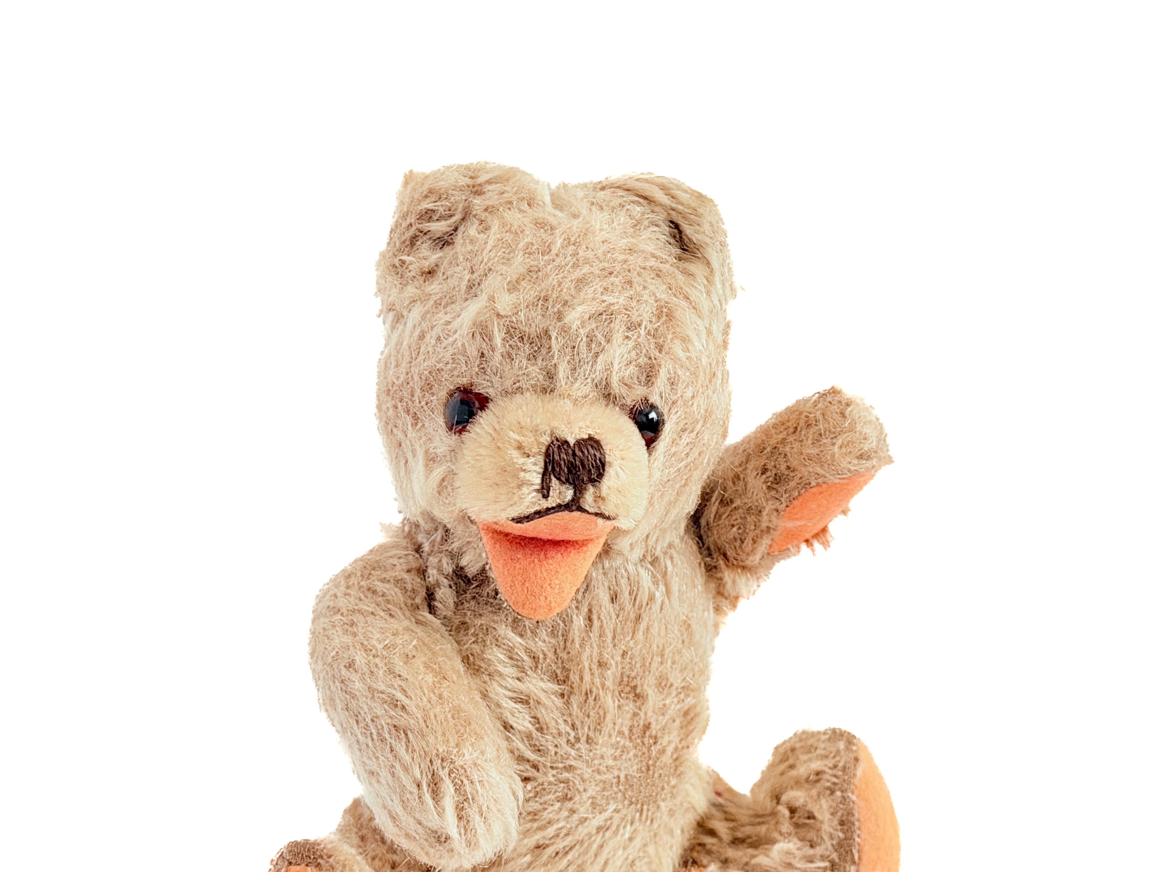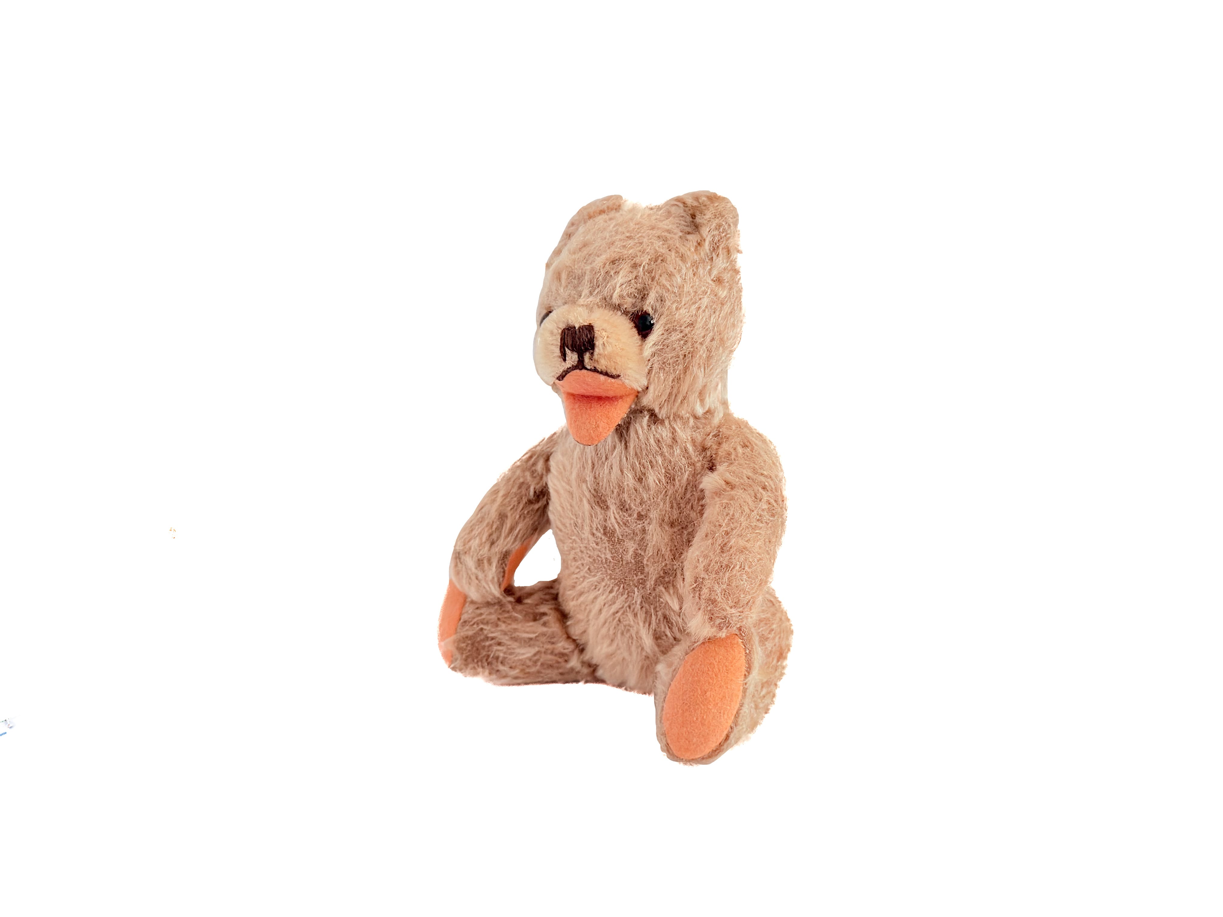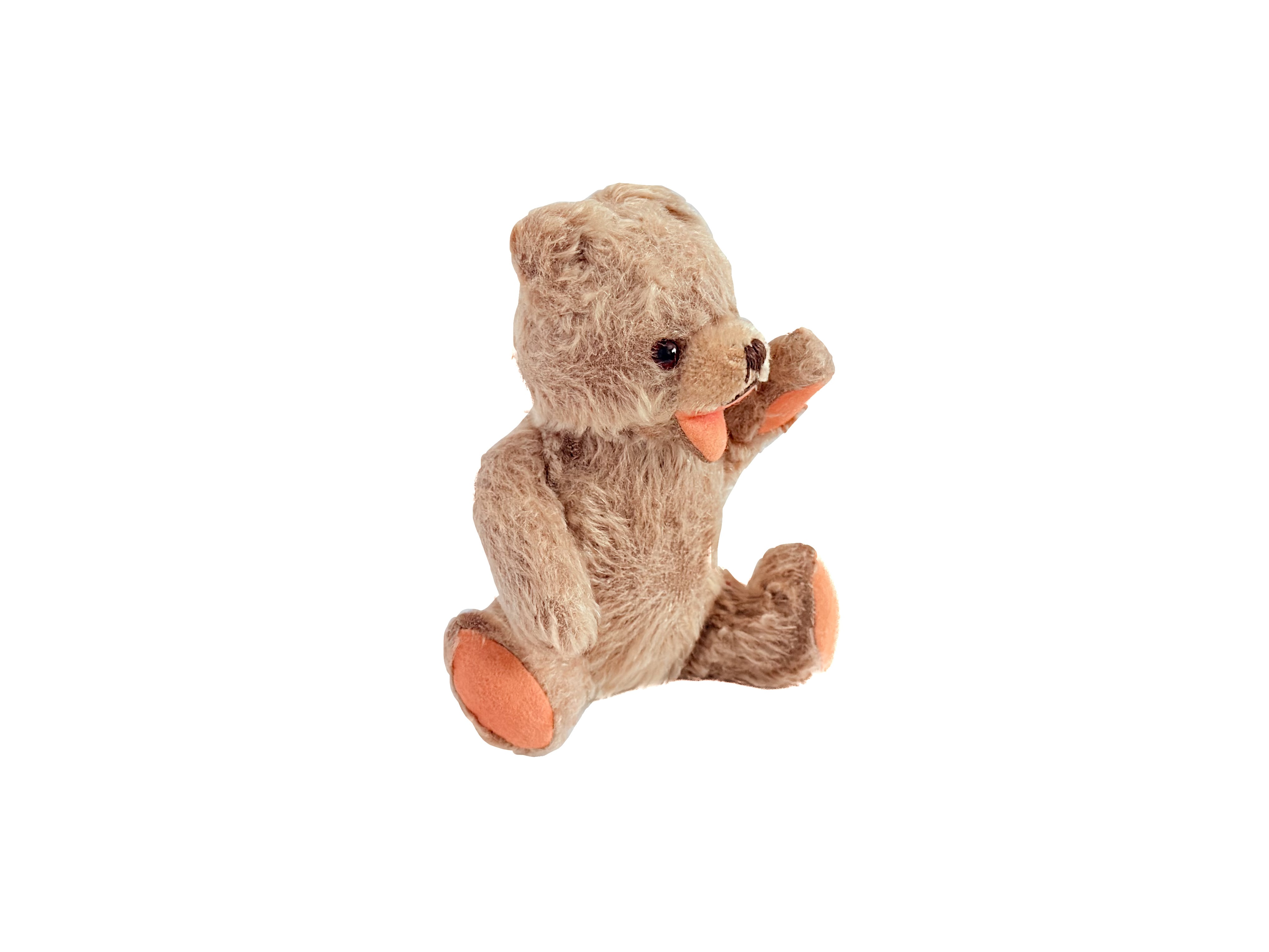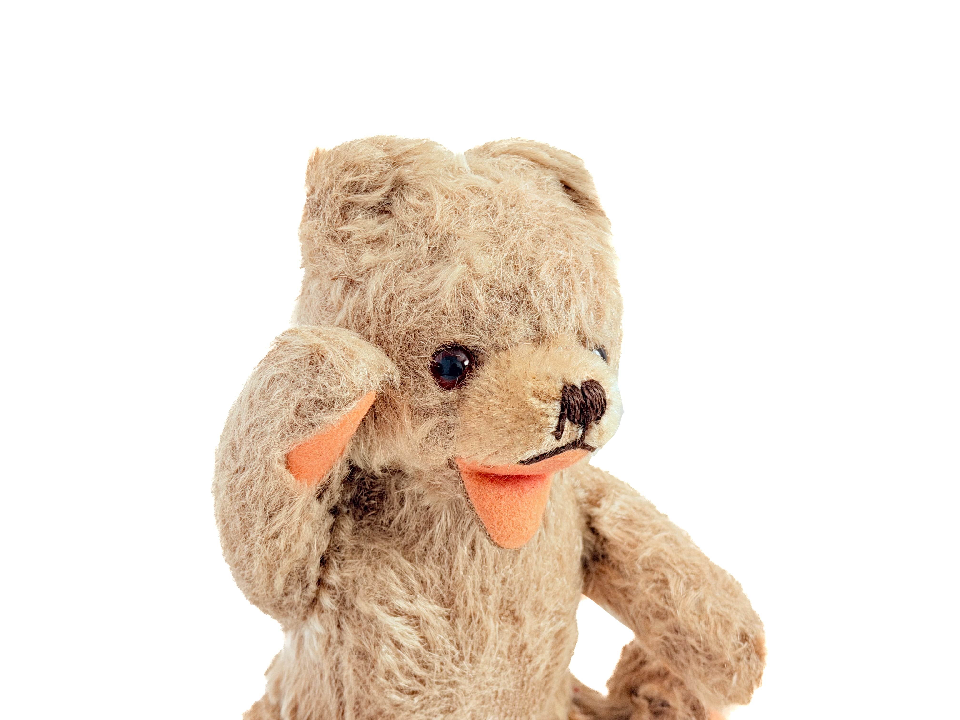 ドイツ・ハーマン社の、手のひらに乗る小さめなテディベアです。少し変わった毛並みと、口を開けて笑っているような表情がとても可愛くて、なんだか楽しそうなので、こちらまで少し幸せな気持ちになります。どこかユーモラスで、じわじわと惹かれていく魅力があります。手足と頭は可動式です。自立はしないため、何かに寄りかけさせて飾るか、ちょこんと座らせてあげてください。
